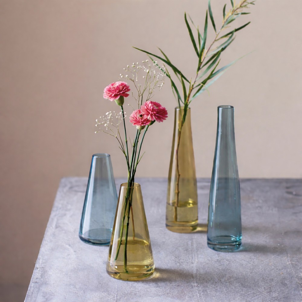 いただいたお花や植物などをちょっとしたスペースに華やかに飾ることができる小ぶりのカラーガラスは、いくつあっても重宝します。