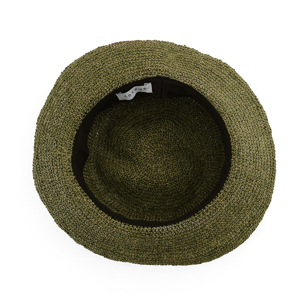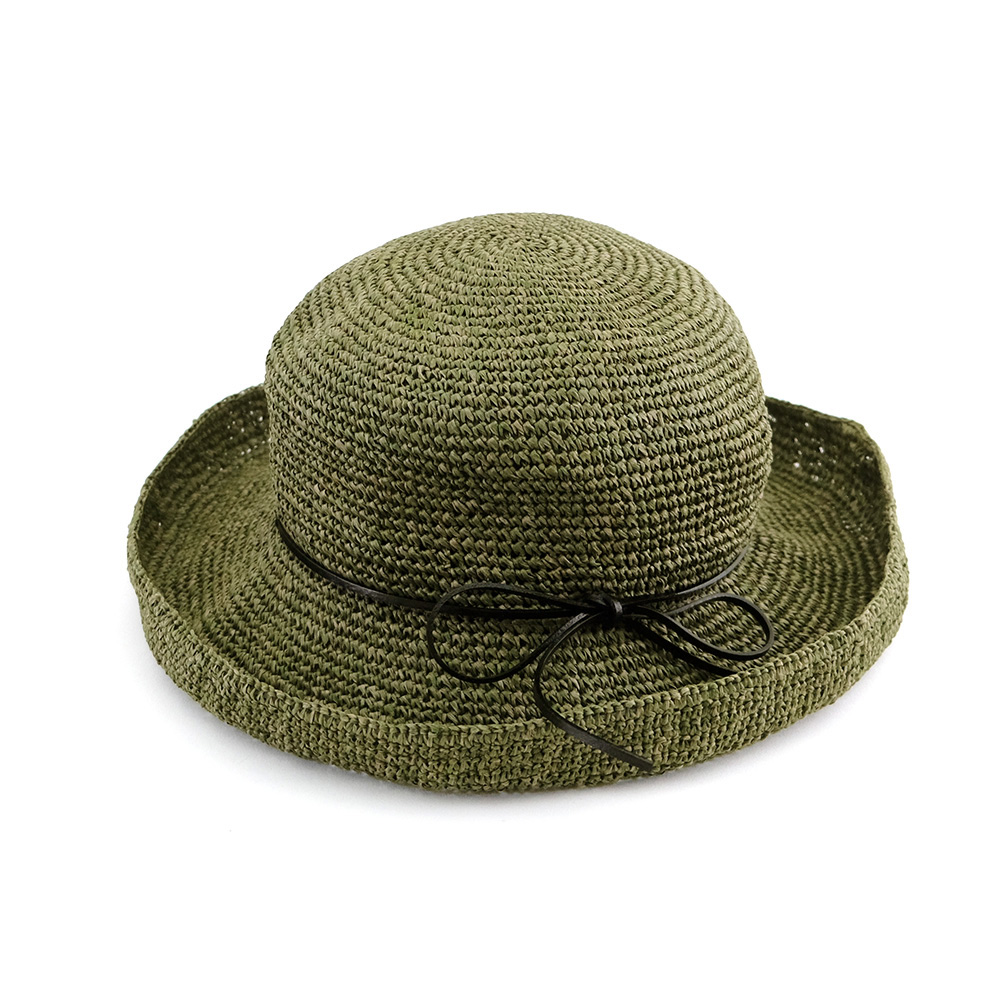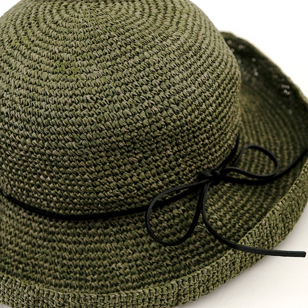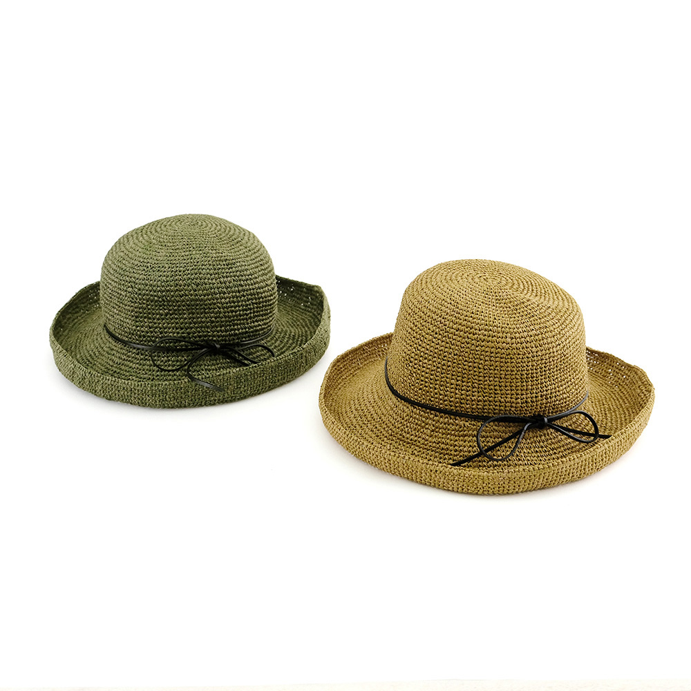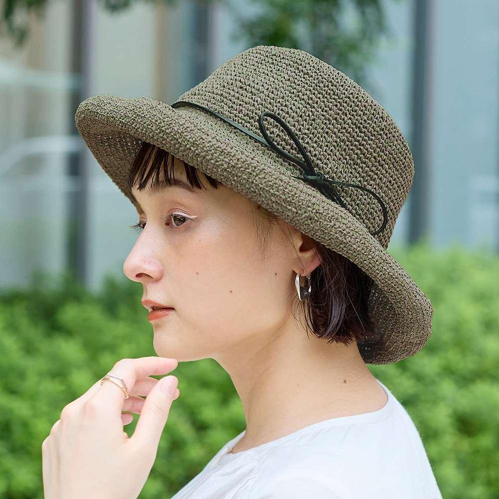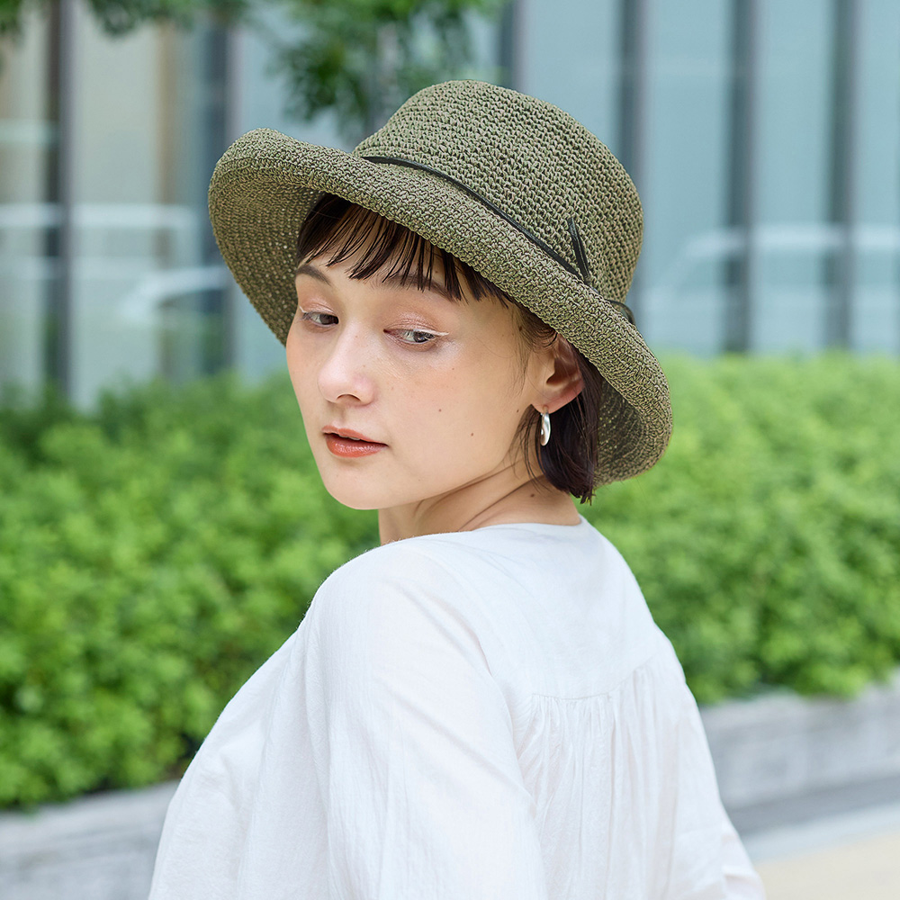 柔らかなペーパー素材を使用した軽さが特徴のクロシェハット。 簡単に折り畳めてバッグに収納できるのでお出かけの際も荷物になりません。 つばの周りに施されたワイヤーでブリムの形を調整でき、つばを深くして日よけにしたり、少し上向きにして顔回りをすっきりさせたりできます。 シンプルな編みと可憐なリボンでどんなコーディネートにもマッチするアイテムです。 2色のペーパーを組合せる事でハットに表情が生まれ柔らかい印象をあたえてくれます。 ペーパー素材とは紙のことで、紙繊維を糸状に撚ったものです。撚ることで密度が高まり、十分な強度を確保することができます。軽くて丈夫な素材で、帽子やバッグなど様々なアイテムに使用されています。紙は空気を通しやすく、通気性にも優れています。染色もしやすく、天然素材では難しい豊富な色展開や発色が可能な事も特徴の一つです。 春夏らしいアイテムなので、店頭に並べると一気に春夏シーズンの印象になります。 季節感を取り入れるアイテムとしてシーズン早目のご検討をおススメします。 >>ファッション雑貨