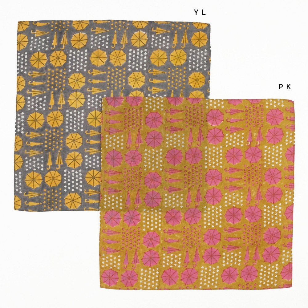 子供の頃は楽しかった雨ふりも大人になると苦手に。季節の移り代わりにふる長雨は、すこし寂しくネガティブな気持ちになってしまいがちです。そんな雨ふりも楽しい気分にしてくれる傘のモチーフハンカチをお届けします。ドット柄は雨粒をイメージ、雨の日に眺めた町並みをブロックプリントで表現しました。 ブロックプリントとは、木彫り版でハンコを押すように1柄ずつ1色ずつプリントされたものです。まず、アウトラインとなる柄のスタンプを押していき、その後色を乗せていきます。使われている色の数だけ作業は複雑になっていきます。全て手作業の為、染ムラやスタンプの境目などが少し出ていますが、それがブロックプリントの良さでもあり、風合いとなっております。 >>ファッション雑貨