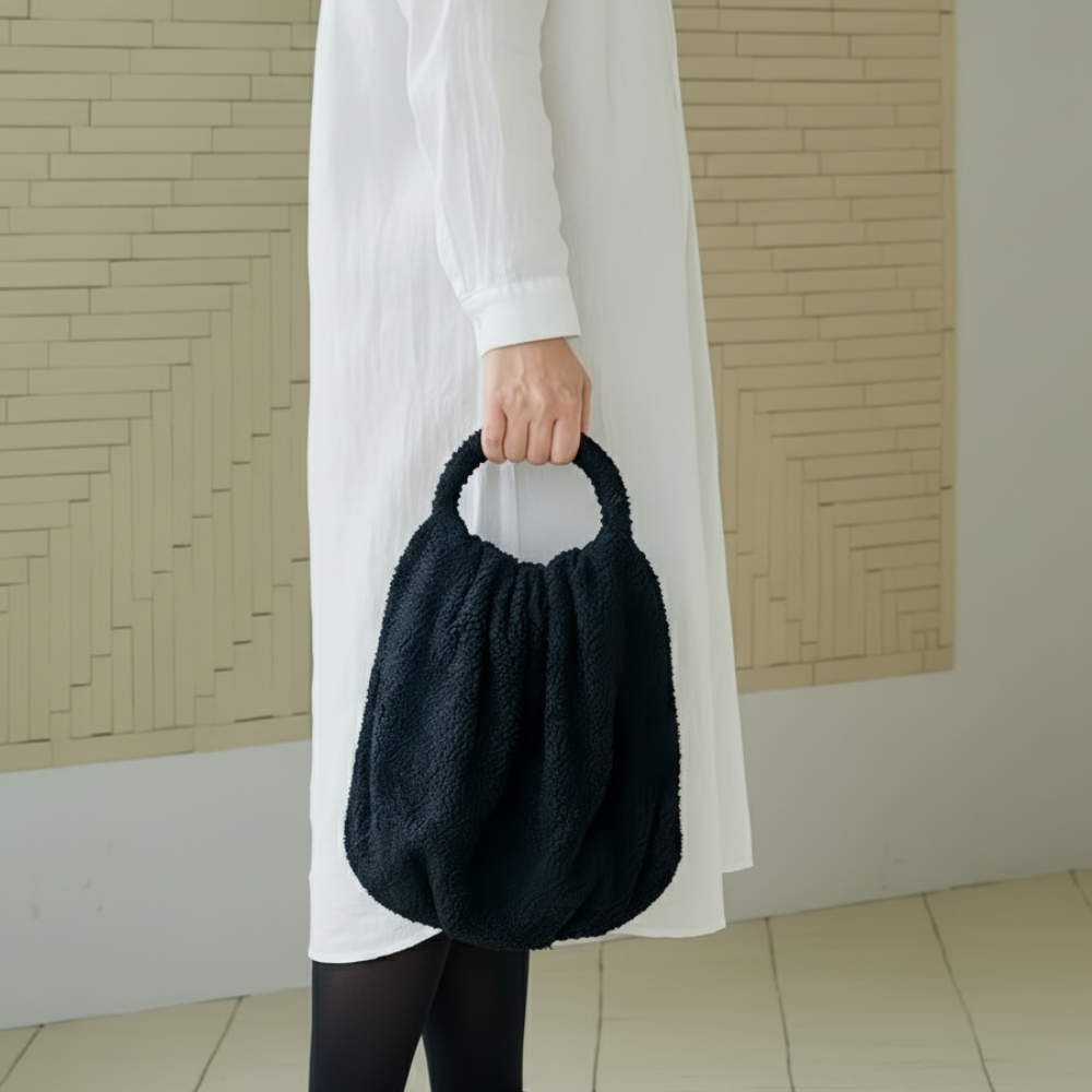 タックをたっぷり入れたシルエットが見た目に可愛らしいバッグです。大人コーデにマッチするようシックなカラー展開にしています。共布のハンドル使いがカジュアルな装いに合わせやすいデザインです。見た目にボリュームはありますが、とても軽くて持ちやすいのが特徴です。 ブークレはフランス語で『輪』というの意味。布地の表面に糸の輪(ループ)が出た織物、または編地のことをいいます。モコモコとした凹凸が特徴で、暖かそうな見た目だけでなく、肌触りの良さと保温性にも優れた素材です。 >>ファッション
