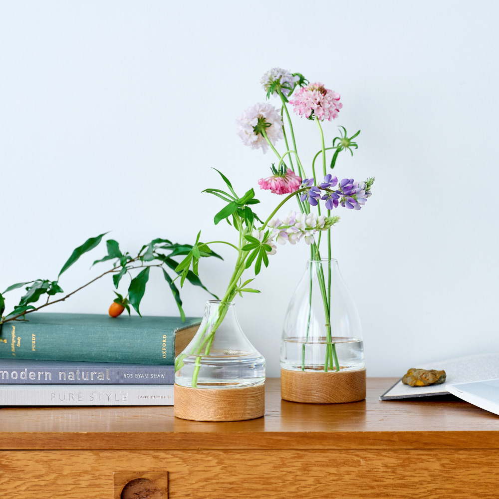 ウッドベースを使ったリューズガラスのフラワーベースです。少ない本数でもバランスよく生けられるサイズとデザインにしています。ガラス部分と土台のウッドは取り外せるので水替えなどのお手入れも簡単です。美しい木目が特徴のオーク材を使用しておりインテリアと調和しやすいので、インテリアに馴染む フレグランス ディフューザー リフィル(108039)、エッセンシャルオイルを使った虫除けディフューザー リフィル(F161357)と一緒にディフューザーボトルとしても使っていただけます。 ≫ リードはこちら リューズガラスとは、再利用されたガラスのことをいいます。一般的には「リサイクルガラス」や「再生ガラス」とも呼ばれ、一度は捨てられたり不要になったガラスをリサイクルして使っています。そのためリューズガラスは、環境にやさしいサスティナブル( Sustainable =持続可能)な社会への取り組みとしても注目されています。再生ガラスのパイプ(シリンダー)を溶かして、型にはめ込んで成型する「シリンダー成型」と呼ばれる製法を使っています。吹きガラスなどのハンドメイドガラスと違い、厚みやサイズの個体差が出にくく、気泡やシワなどが入りにくいクリアな仕上がりが特徴です。リューズガラスは再生ガラスを使用した当社商標登録商品です。 オーク材は耐久性があり、固く丈夫なため高級家具によく使用されています。耐水性にも優れており害虫にも強いという特徴があります。美しい木目が特徴で、虎斑と呼ばれる特有の木目もオーク材ならではの魅力です。 >>インテリアグリーン・ガーデン