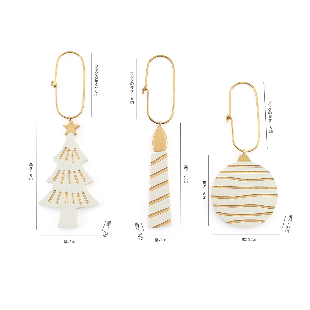 | サイズ | A(ツリー):幅5×奥行0.5×高さ9cm(フックの長さ6cm) B(キャンドル):幅2×奥行0.5×高さ8.5cm(フックの長さ6cm) C(ボール):幅5.5×奥行0.5×高さ6cm(フックの長さ6cm) |