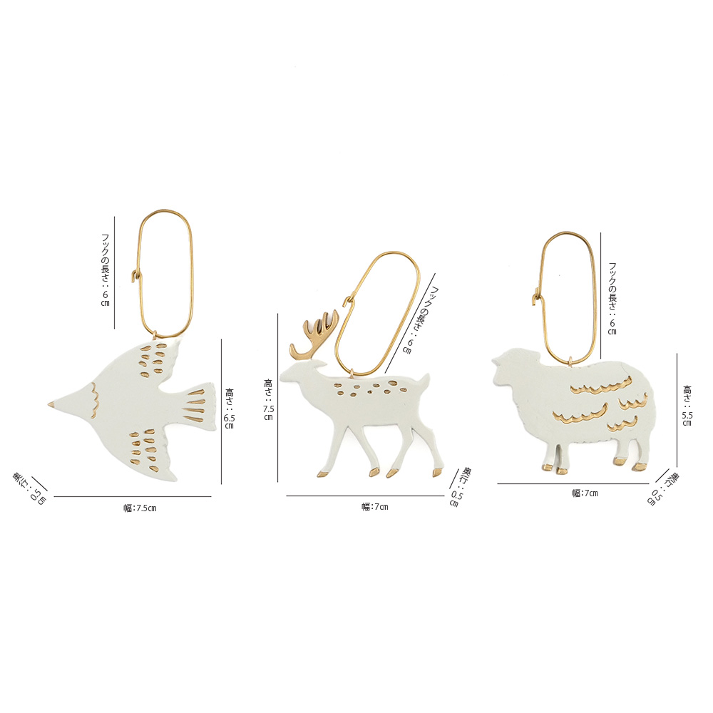 | サイズ | A(鳥):幅7.5×奥行0.5×高さ6.5cm(フックの長さ6cm) B(トナカイ):幅7×奥行0.5×高さ7.5cm(フックの長さ6cm) C(羊):幅7×奥行0.5×高さ5.5cm(フックの長さ6cm) |