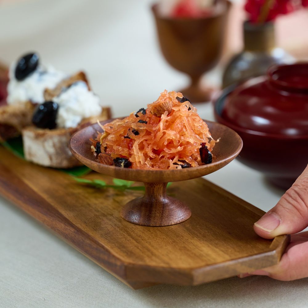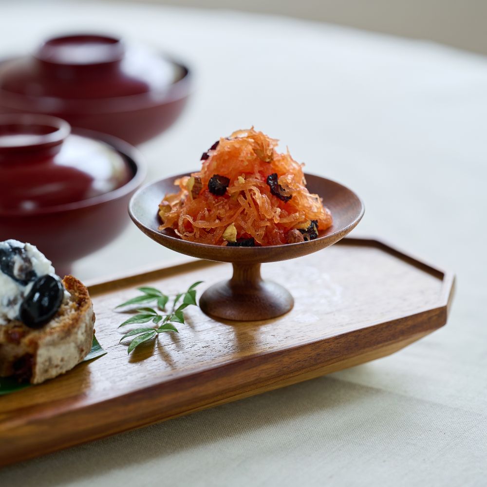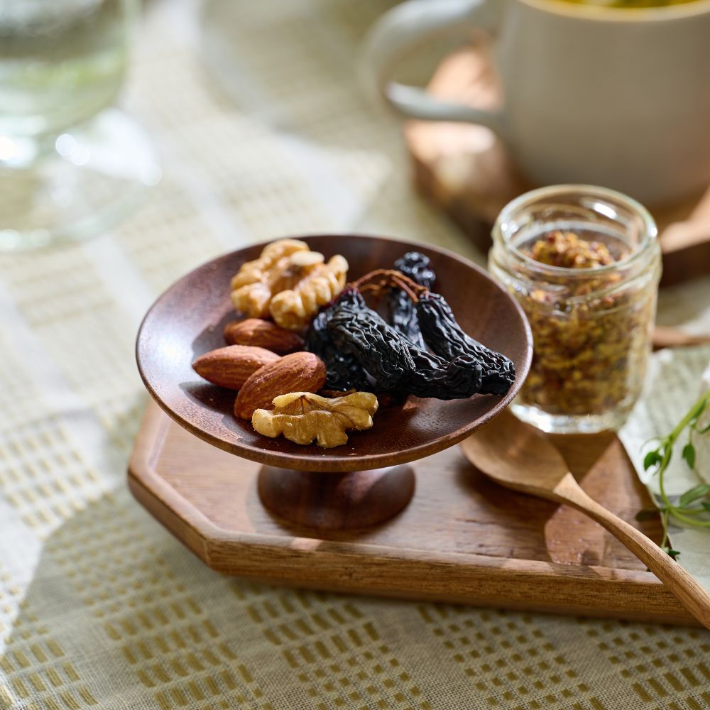 お正月のおせち料理や、クリスマスの特別な一品を、ひときわ上品に引き立てる木製の脚付き豆皿です。和の趣と洋のテイストを兼ね備えているため、様々な食卓シーンで活躍します。わずかに設けられた脚が、豆皿に上品な高さを与え、盛り付けた料理を一層美しく際立たせます。天然木ならではの優しい手触りと、丁寧に仕上げられた滑らかな質感が、食卓に心地よさをもたらします。お正月には、おせち料理の縁起物を盛りつけ、クリスマスにはオードブルやディップなどを盛りつける。普段使いにはちょっとしたおつまみを盛りつけるなど、食事のアクセントとしてお使いいただけます。 ■アカシアウッドのアイテムはこちら ■脚付きの食器はこちら ACACIA WOODは中心部が濃い茶色で周辺部は白色と、濃淡の差がはっきりとしています。これらを木材そのものの特徴として捉え、原材料を無駄なく使い、限りある資源を大切にしたいと考えています。また、手作りのため商品のサイズや形状にも多少の誤差があります。素材そのものが持つ個体差や、大量生産にはないそれぞれの表情をお楽しみください。 >>食器・キッチン