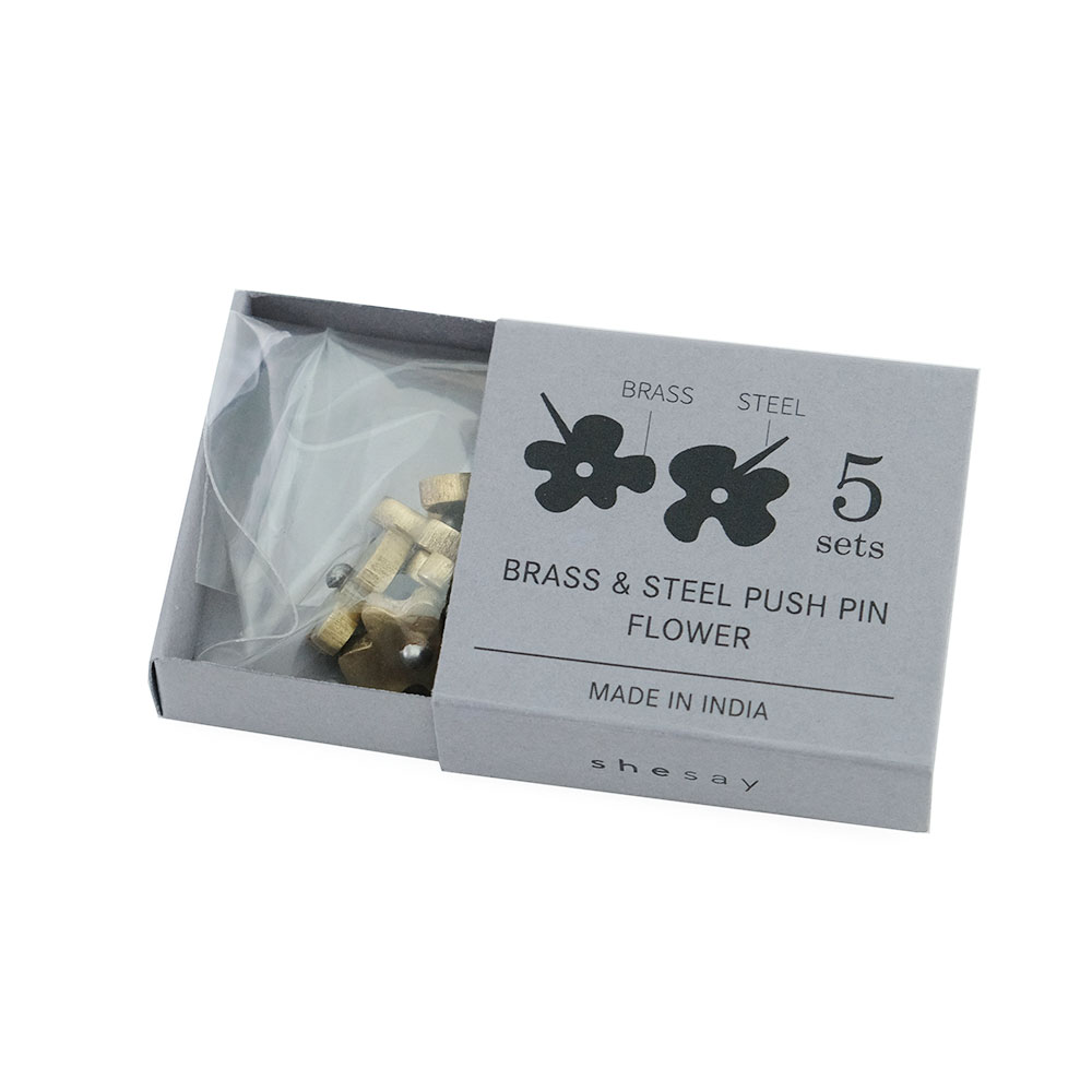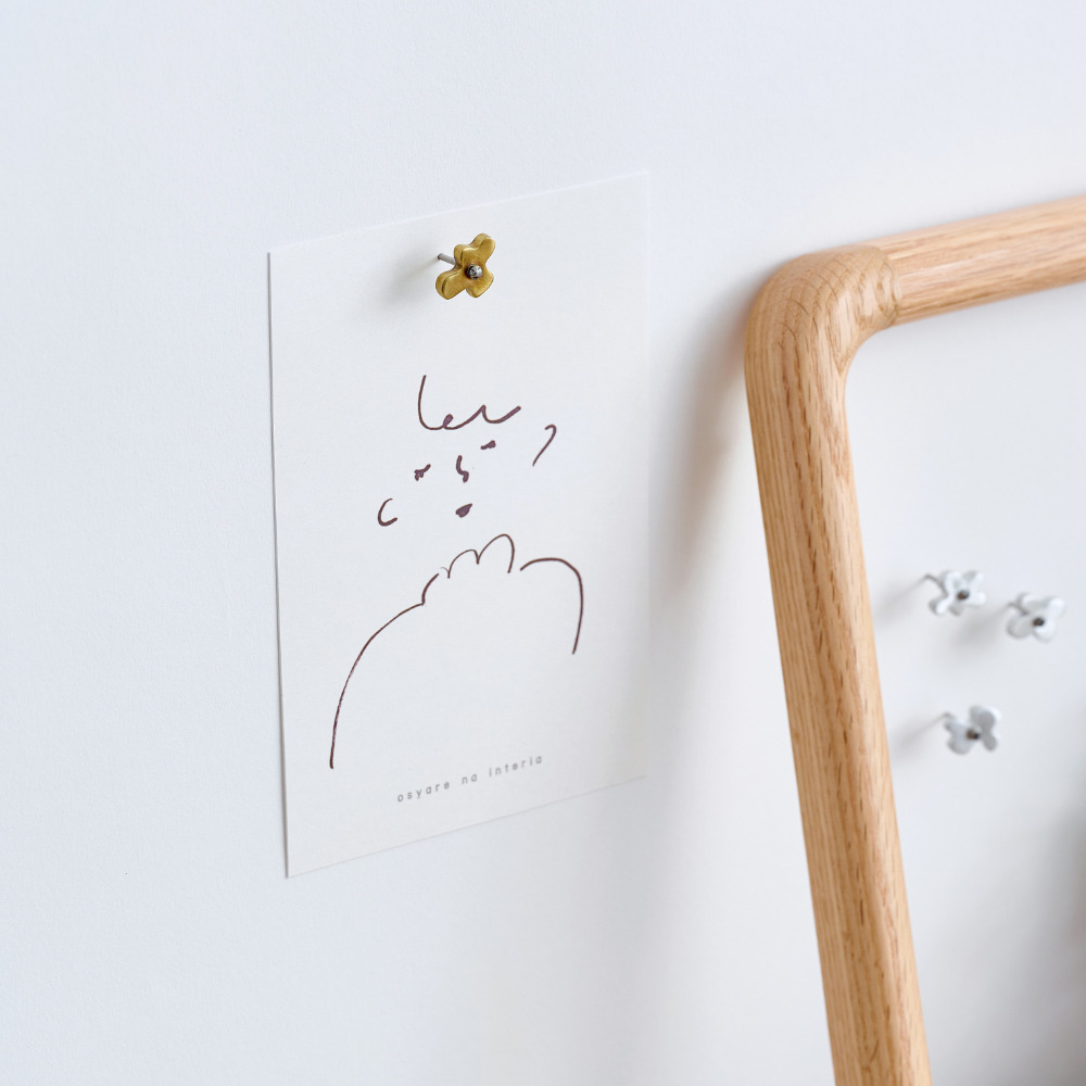 真鍮素材でかたどったお花のモチーフが、まるで壁にとまっているような愛らしい押しピンです。ポストカードやお気に入りの紙ものを飾るとき、味気ない押しピンではもったいない。そんな「ちょっとした残念さ」を、見た目も気分も上がる小さなアクセントで解決します。ピン部分はスチール製で、実用性にもこだわりを。かわいさだけじゃなく、しっかり留まる安心感も兼ね備えています。 ■壁にとまっているような飾りピンのシリーズはこちら ■ステーショナリー・クラフト関連はこちら BRASS(ブラス)について BRASS とは真鍮のことで、SHISEI の BRASS 製品はすべて職人によるハンドメイドで生産しています。独自の質感や深みのある光沢が上品な雰囲気を醸し出し、使うほどに増していく風合いも真鍮素材ならではの特徴です。年月の経過とともに、自分だけのエイジングを感じられる愛着のあるものへとなっていきます。 スチールについて stainless steel SUS201は、耐食性が高くコストパフォーマンスにも優れたステンレス鋼です。主に家庭用機器、建材、自動車部品などに用いられる実用性の高い素材になります。尚、特徴として非磁性の金属になります。 >>生活雑貨・日用品
