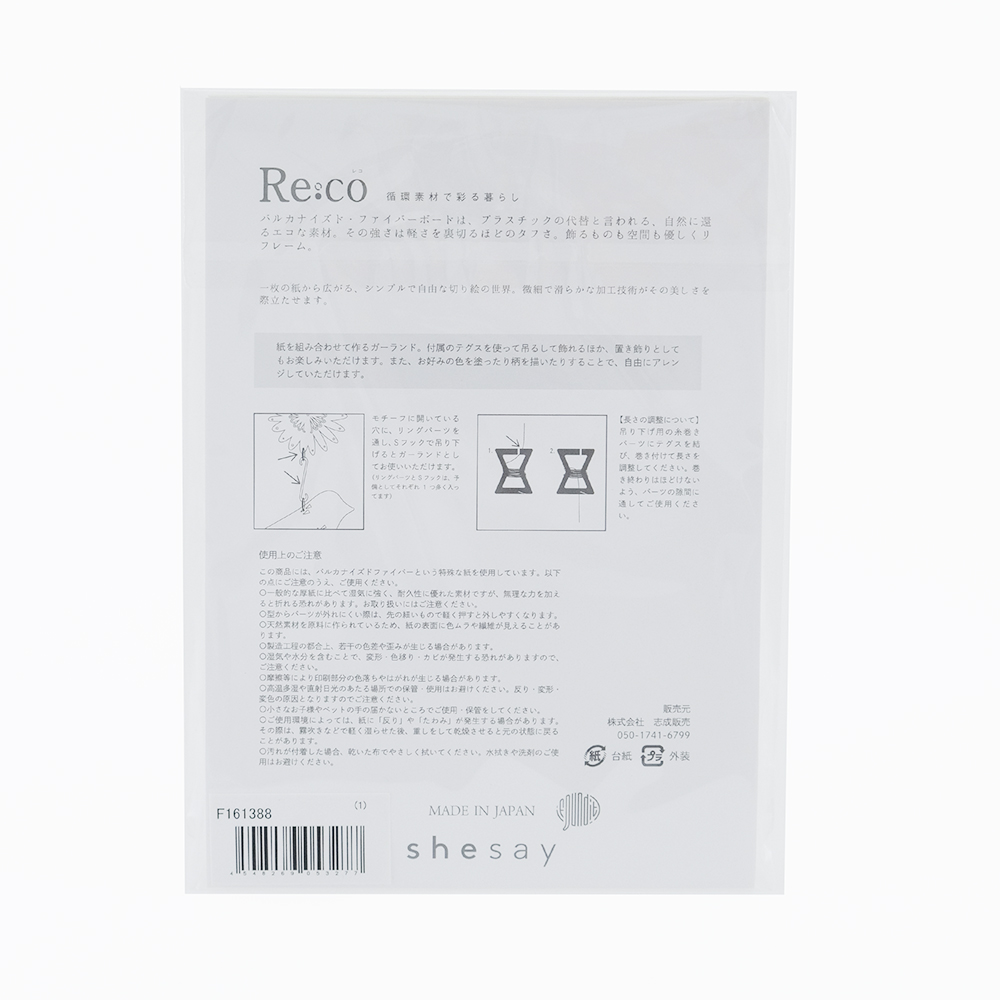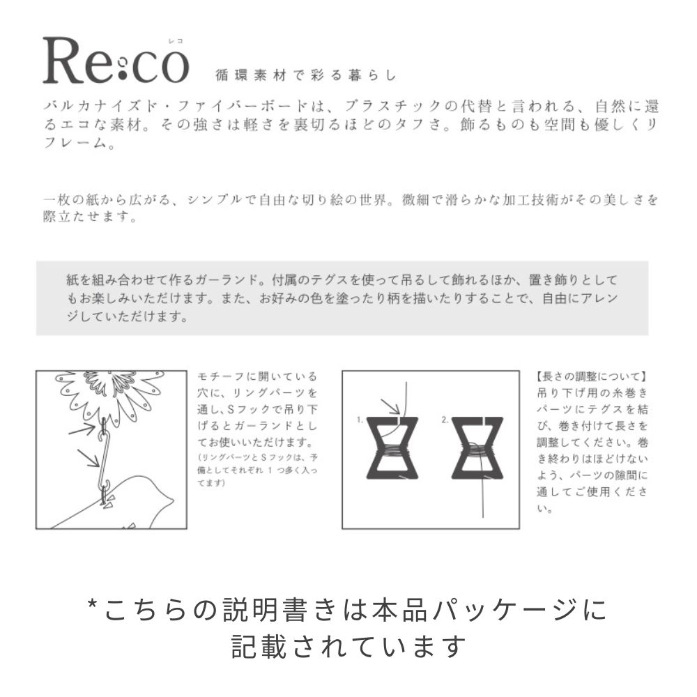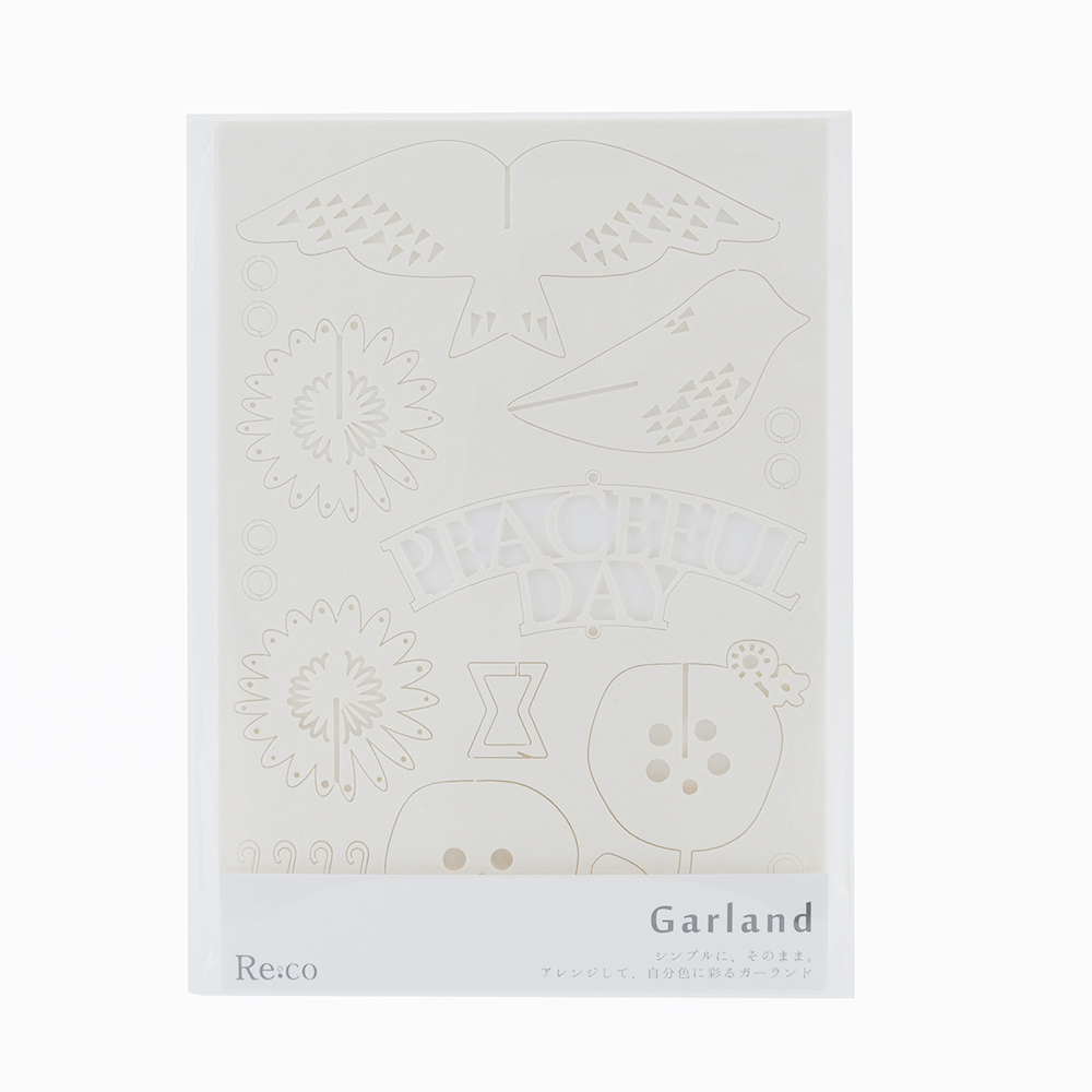 【Re:co】は、循環素材やリサイクルを取り入れた、繰り返し大切に使えるサステナブルなシリーズです。人にも地球にもやさしい素材を選び、ものや時間、気持ちを循環させる暮らしを提案します。 バルカナイズド・ファイバーボードは、プラスチックの代替と言われる、自然に還るエコな素材。一枚の紙から広がる、シンプルで自由な切り絵の世界。微細で滑らかな加工技術がその美しさを際立たせます。 組み立てると立体になる、遊び心たっぷりの余白を残したガーランド。付属のテグスを使って吊るして飾れるほか、置き飾りとしてもお楽しみいただけます。また、お好みの色を塗ったり柄を描いたりすることで、自由にアレンジしていただけます。 ■【Re:co】シリーズはこちら ■オブジェ・置物関連はこちら バルカナイズド・ファイバーボードは、セルロースを原料として作られます。プラスチックの代替と言われる、自然に還るエコな素材で、石油化学製品に代わる環境にやさしい素材です。 >>インテリア雑貨