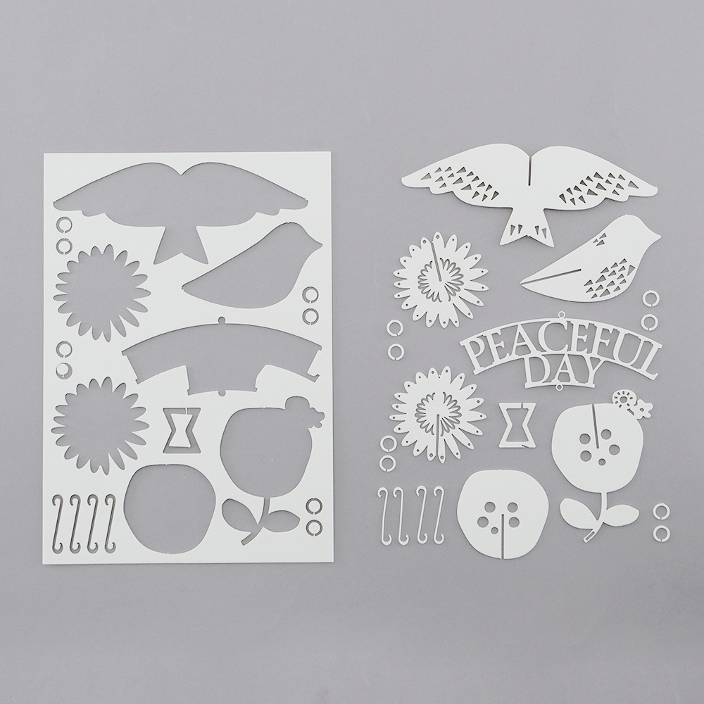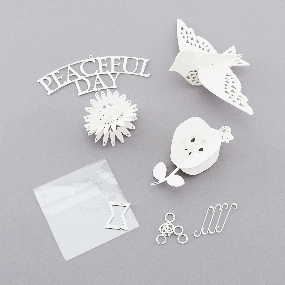 | サイズ | 幅14.8×高さ21cm ・ (鳥)幅13×奥行7.3×4.5cm ・(花)幅5×奥行5×高さ5cm ・(一輪花)幅5.5×奥行4.7×高さ7.5cm ・(文字)幅10.3×高さ4cm ・ (Sフック)幅0.6×長さ3cm ・テグス:1m |