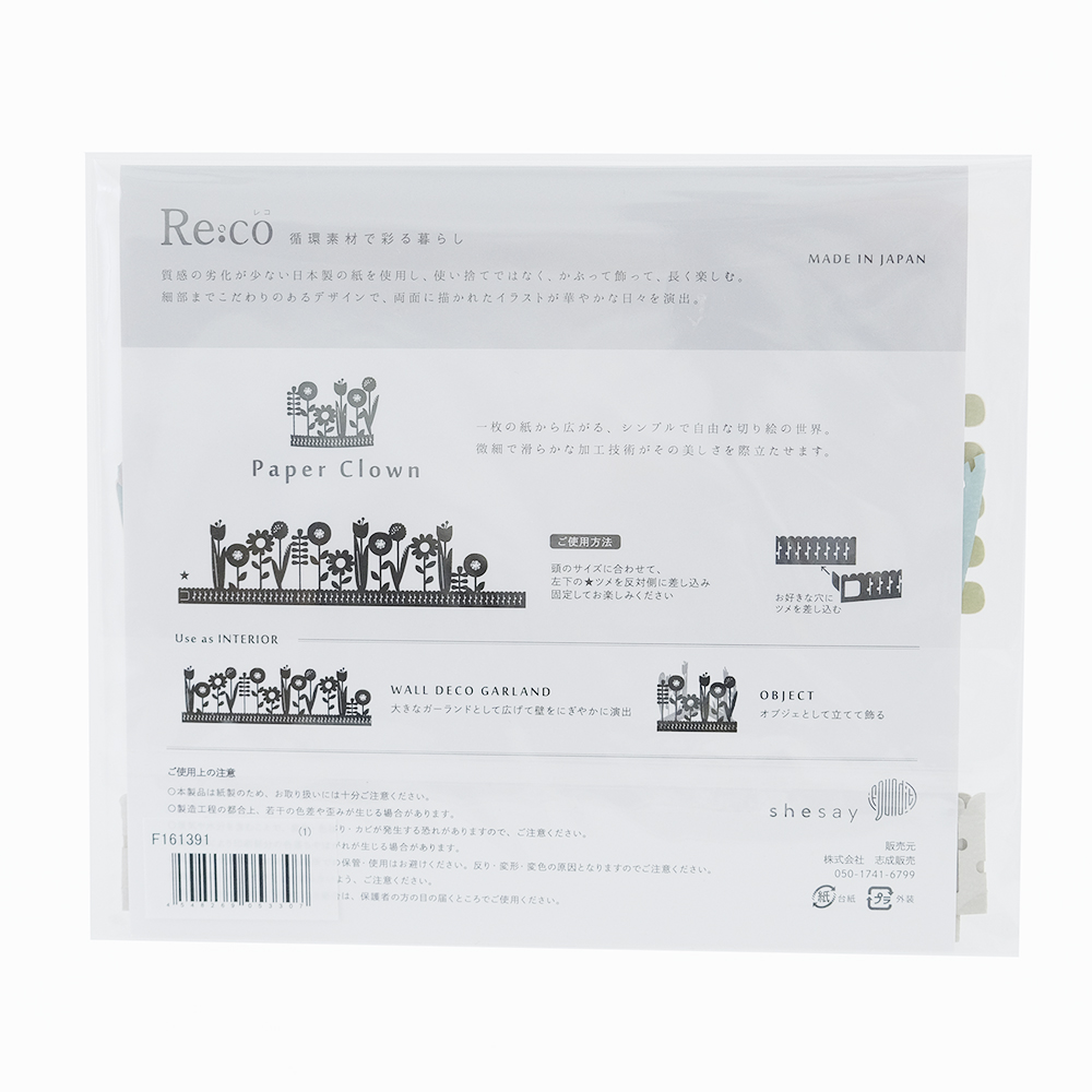 【Re:co】は、循環素材やリサイクルを取り入れた、繰り返し大切に使えるサステナブルなシリーズです。人にも地球にもやさしい素材を選び、ものや時間、気持ちを循環させる暮らしを提案します。 細部までこだわりのあるデザインで、両面に描かれたイラストが華やかな日々を演出します。一枚の紙から広がる、シンプルで自由な切り絵の世界。微細で滑らかな加工技術がその美しさを際立たせます。 「かぶる」も「飾る」も楽しめる、存在感のあるペーパークラウン。使った後は、お部屋のインテリアとしてオブジェやガーランドとしてお使い頂くことができ、”思い出”をそのまま飾れます。 ■【Re:co】シリーズはこちら ■オブジェ・置物関連はこちら 質感の劣化が少ない日本製の紙を使用していて、使い捨てではなく長く楽しめます。 >>インテリア雑貨