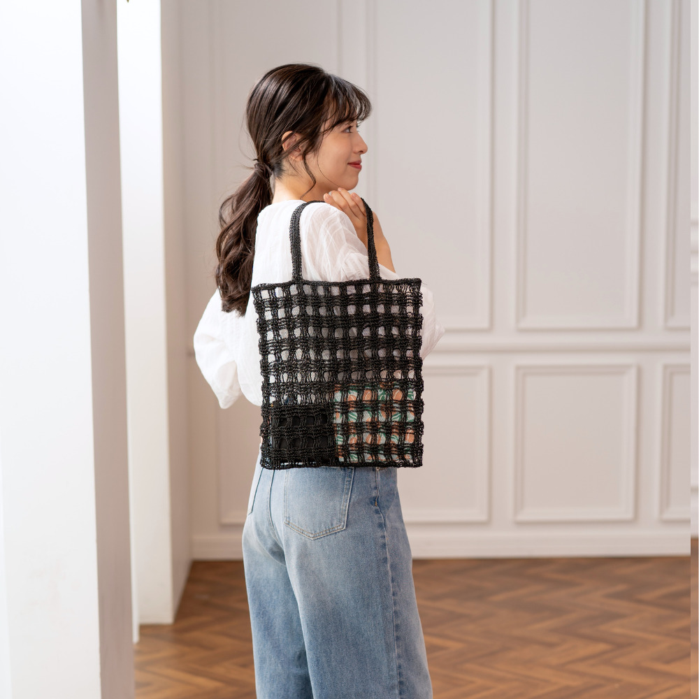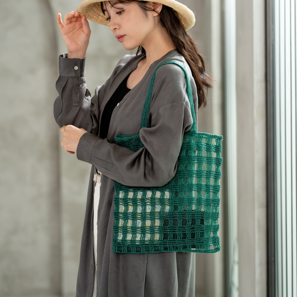 チェック柄のクロシェ編みが目を引くバッグは、軽量で水に強いポリエチレン素材を使用しています。透かし編みに合わせたチュールの裏地が、無造作に入れた小物類をキャッチしてくれるので、慌ててお出かけの日も安心してご使用いただけます。パキっとした色使いがコーディネートの差し色におススメ。お出かけから日常使いまで、幅広いシーンで活躍するアイテムです。 ポリエチレンは非常に軽く丈夫な素材です。吸水性が低く防水性に優れているため、濡れてもすぐに乾きます。ツルツルと滑らかな質感でしわになりにくいのも特徴の一つです。 >>ファッション