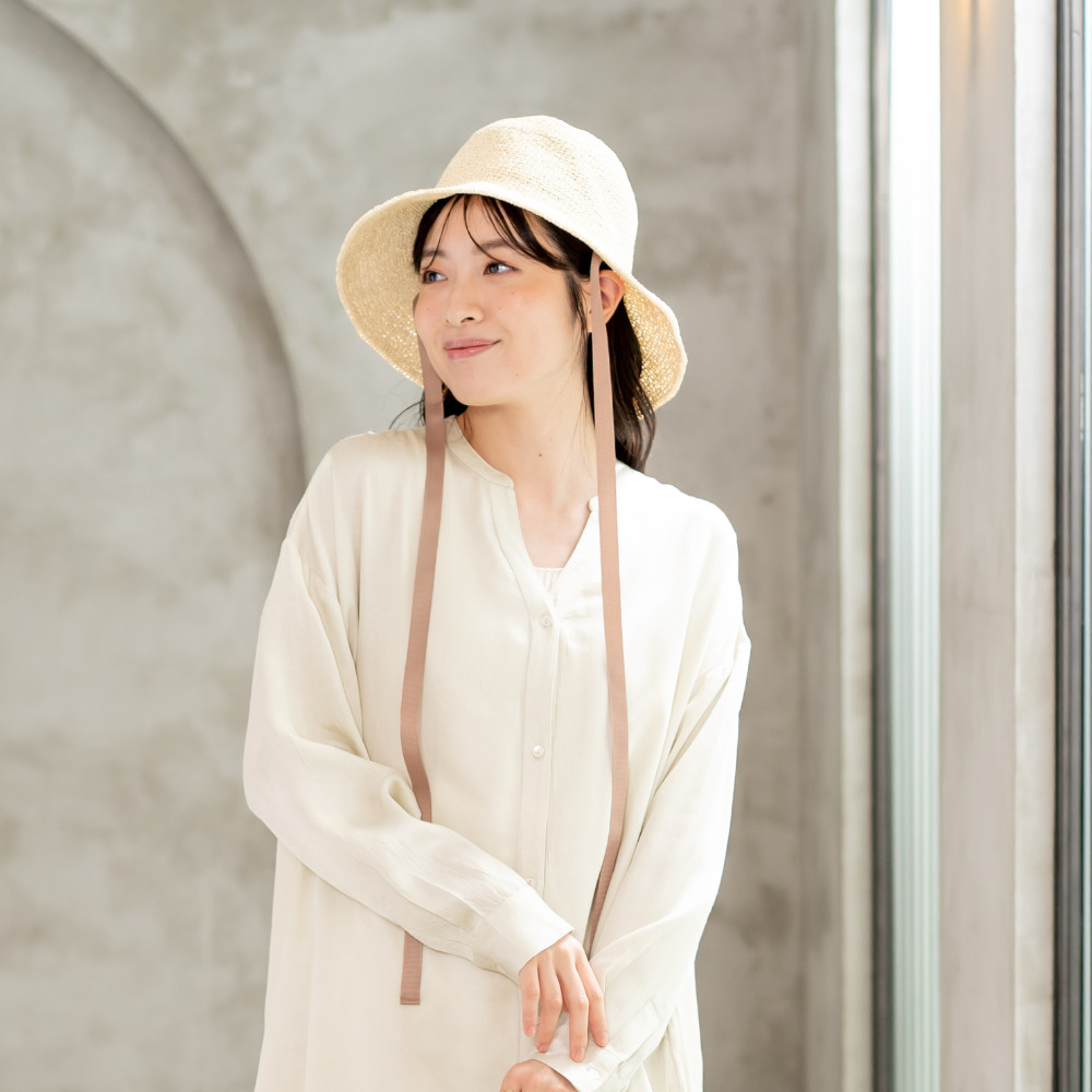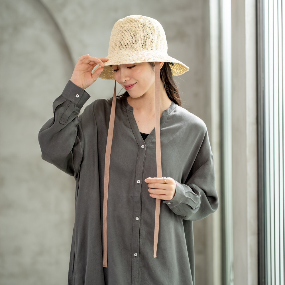 ペーパークロシェのハットはとても軽く、編み目から風が抜けて蒸れにくいのが特徴です。ブリム周囲にコードを編み込んでいるので、バッグに丸めて収納してもサッ簡単に形を整えることができます。顎紐がついているので、風の強い日や自転車に乗った時など、アクティブなシーンでも安心して着用していただけます。 ペーパー素材とは紙のことで、紙繊維を糸状に撚ったものです。撚ることで密度が高まり、十分な強度を確保することができます。軽くて丈夫な素材で、帽子やバッグなど様々なアイテムに使用されています。紙は空気を通しやすく、通気性にも優れています。染色もしやすく、天然素材では難しい豊富な色展開や発色が可能な事も特徴の一つです。 >>ファッション雑貨