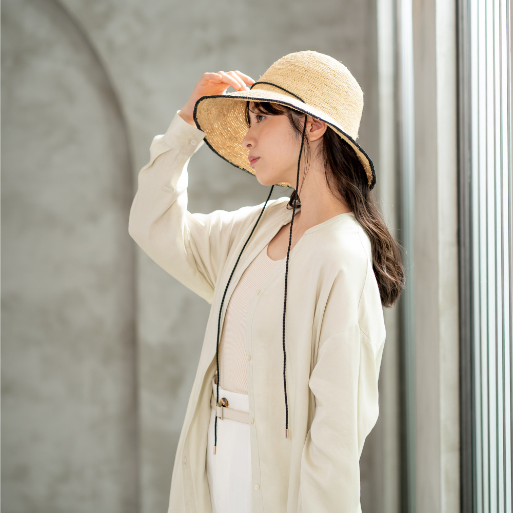 カジュアルになりがちなサマーハットを、大人のための上質なアイテムに仕上げました。細やかなクロシェ編みのラフィアは、使い込むほどにしなやかに、そして艶を増していきます。デザインのアクセントは、前後で幅を変えたエレガントなブリムと、全体を引き締めるPUのストリングと黒いライン。日差しがまぶしい時や首の日焼けが気になるときは、ブリムの向きを前後で変えて使用することができます。シンプルなスタイリングにプラスするだけで、品格のある大人の夏スタイルが完成します。 ラフィア椰子という植物の葉の部分を加工した天然素材です。ひとつひとつ職人たちによるハンドメイドで生産しています。ラフィアは軽くて柔らかく、通気性が良いため、夏場など暑い季節にも快適に着用できます。また繊維が長く、丈夫で耐久性が高いため、長期間使い続けることができます。ラフィアは、他の天然素材に比べて樹脂を含んでいるため、柔らかく使用していくうちに艶が出て、経年変化を楽しむことができます。 >>ファッション雑貨