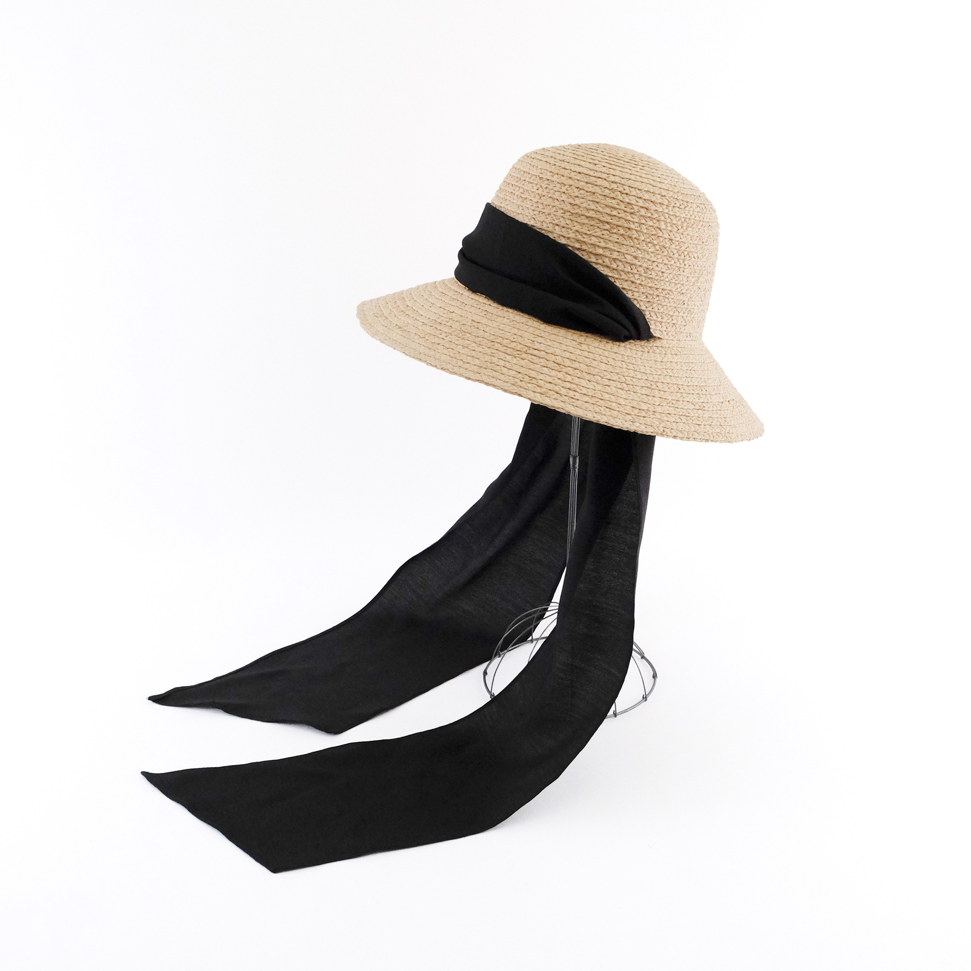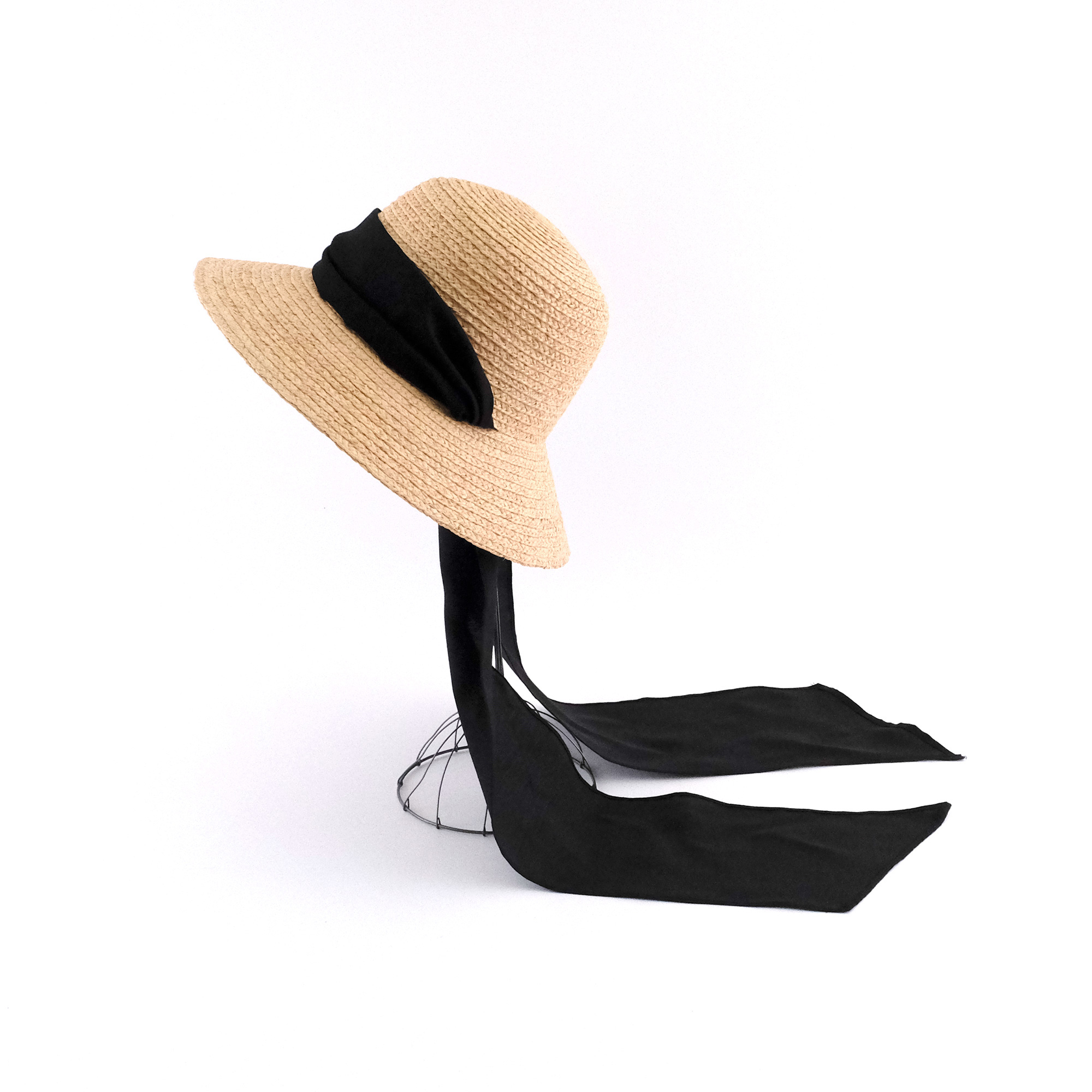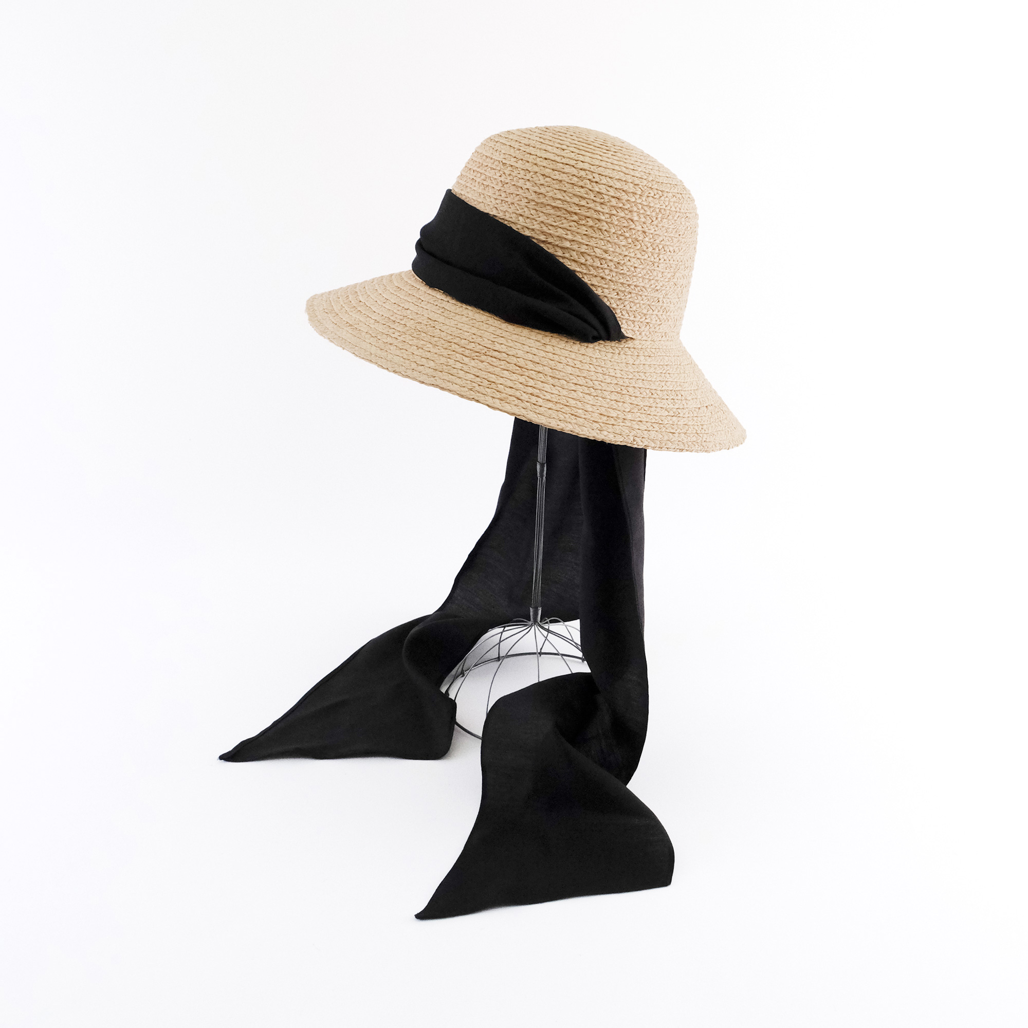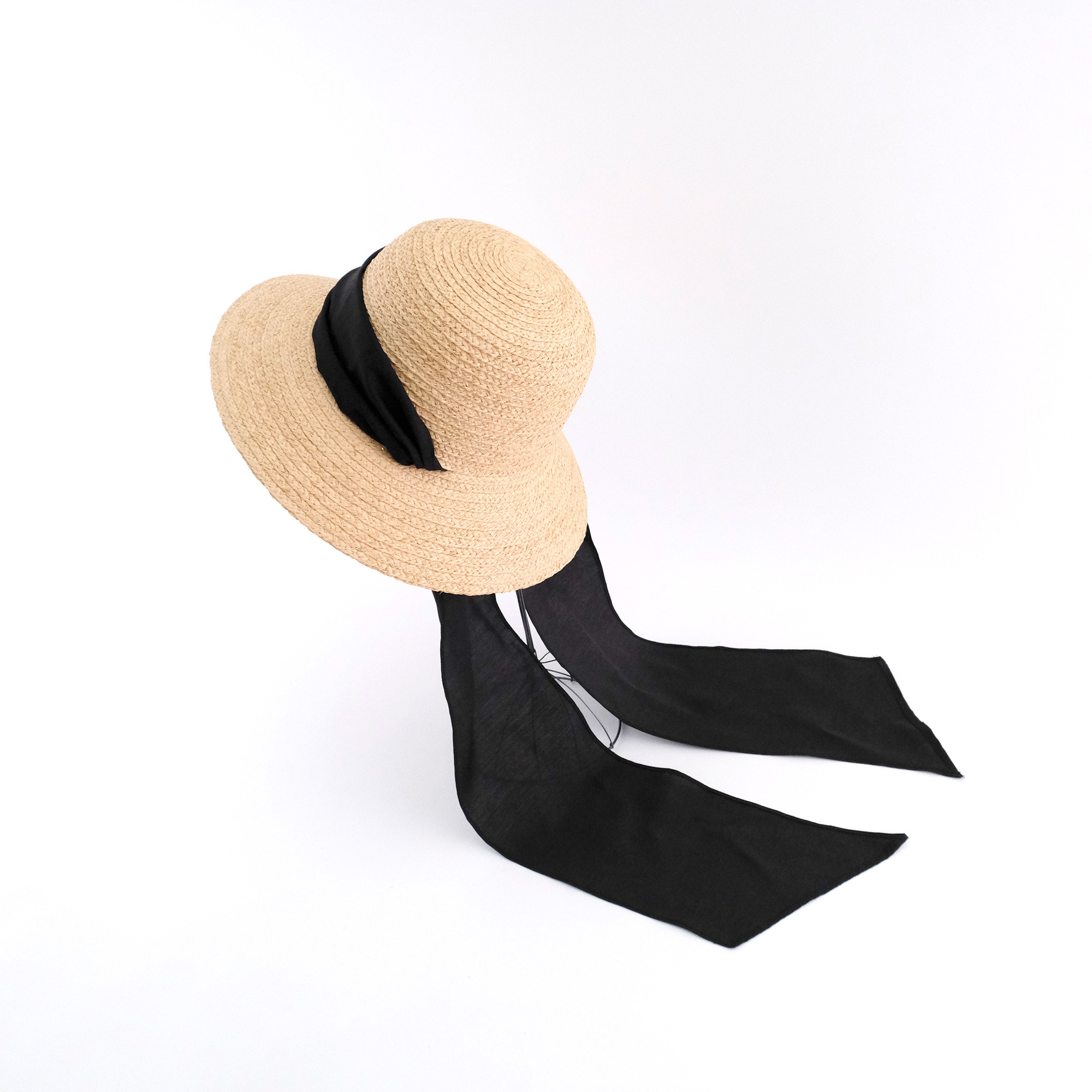 リボンスカーフが目を引くラフィアのブレードハット。リボンはサイドのスリットに通しているだけなので、手持ちのリボンやスカーフに差し替えることができます。前にたらしたり、後ろの首元で結んだりとアレンジをお楽しみいただけます。 ラフィア椰子という植物の葉の部分を加工した天然素材です。ひとつひとつ職人たちによるハンドメイドで生産しています。ラフィアは軽くて柔らかく、通気性が良いため、夏場など暑い季節にも快適に着用できます。また繊維が長く、丈夫で耐久性が高いため、長期間使い続けることができます。ラフィアは、他の天然素材に比べて樹脂を含んでいるため、柔らかく使用していくうちに艶が出て、経年変化を楽しむことができます。