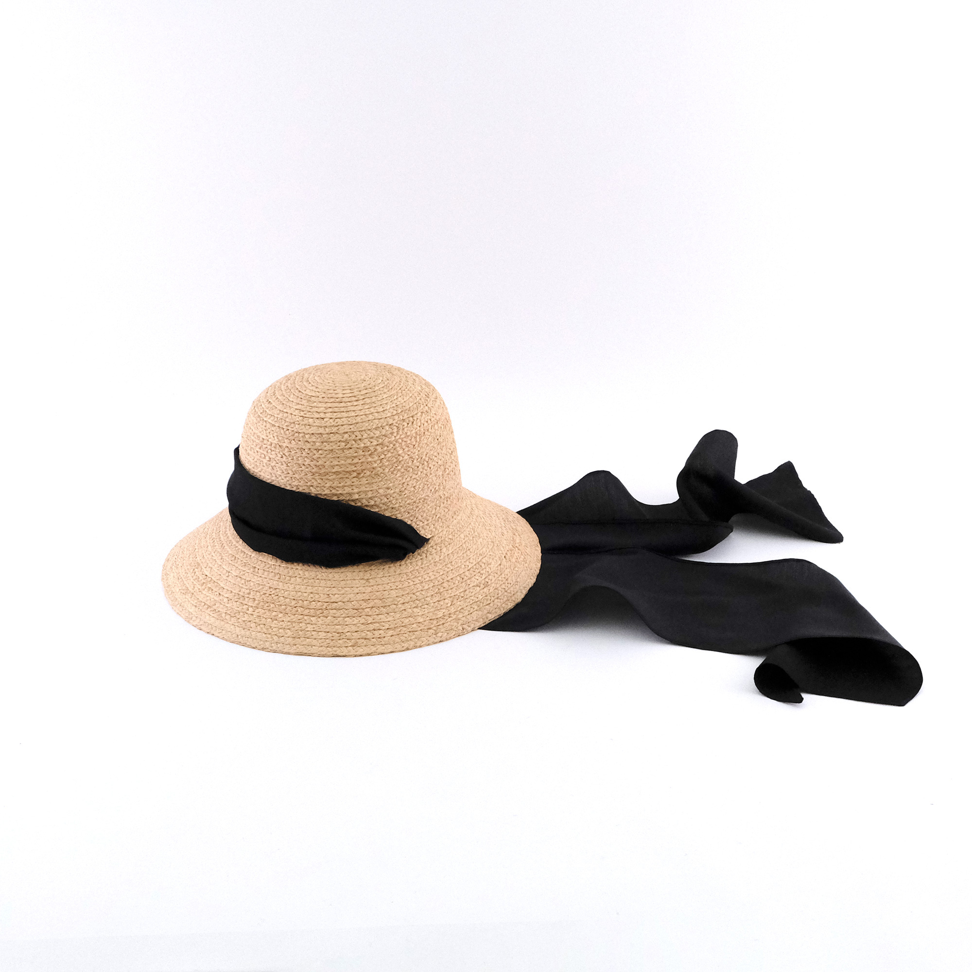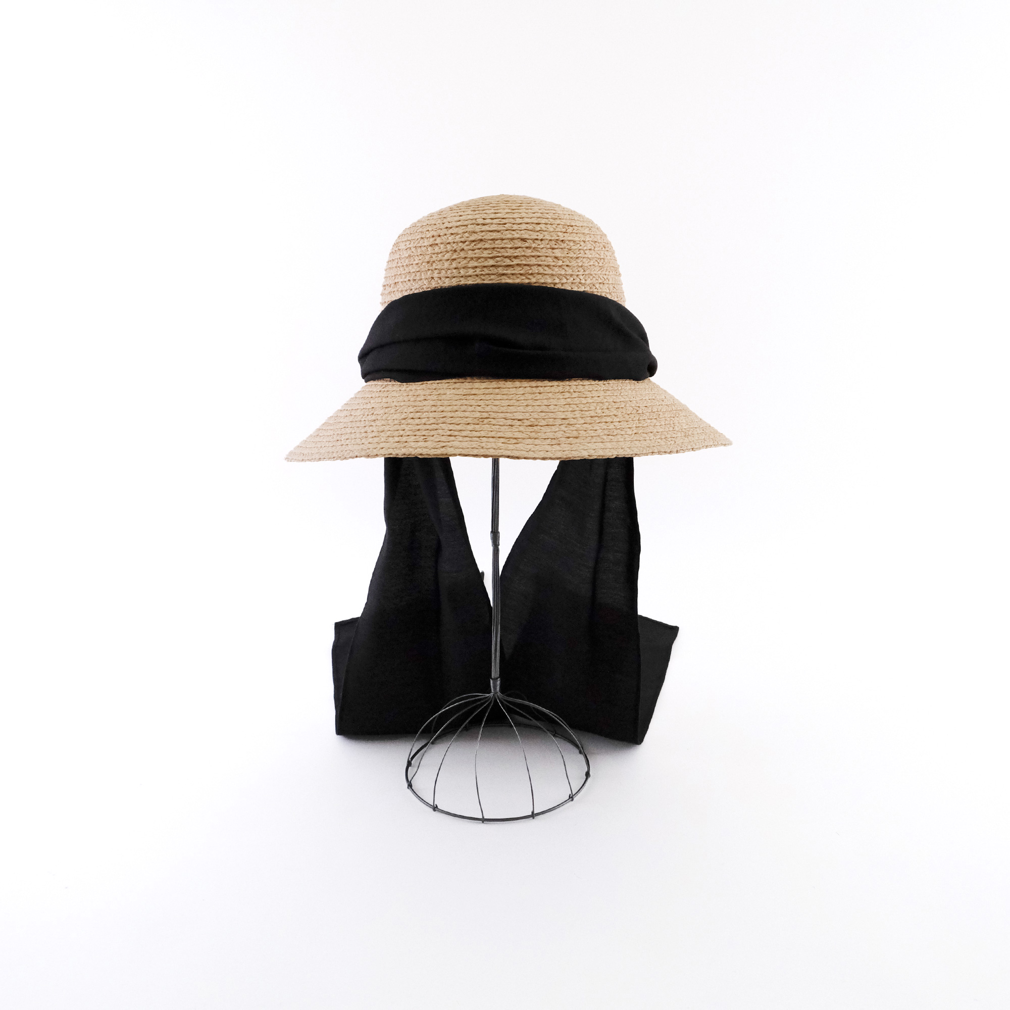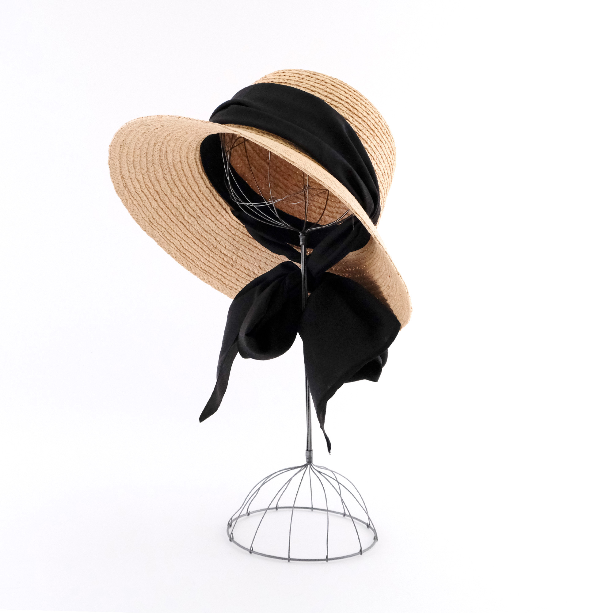 リボンスカーフが目を引くラフィアのブレードハット。リボンはサイドのスリットに通しているだけなので、手持ちのリボンやスカーフに差し替えることができます。前にたらしたり、後ろの首元で結んだりとアレンジをお楽しみいただけます。 ラフィア椰子という植物の葉の部分を加工した天然素材です。ひとつひとつ職人たちによるハンドメイドで生産しています。ラフィアは軽くて柔らかく、通気性が良いため、夏場など暑い季節にも快適に着用できます。また繊維が長く、丈夫で耐久性が高いため、長期間使い続けることができます。ラフィアは、他の天然素材に比べて樹脂を含んでいるため、柔らかく使用していくうちに艶が出て、経年変化を楽しむことができます。
