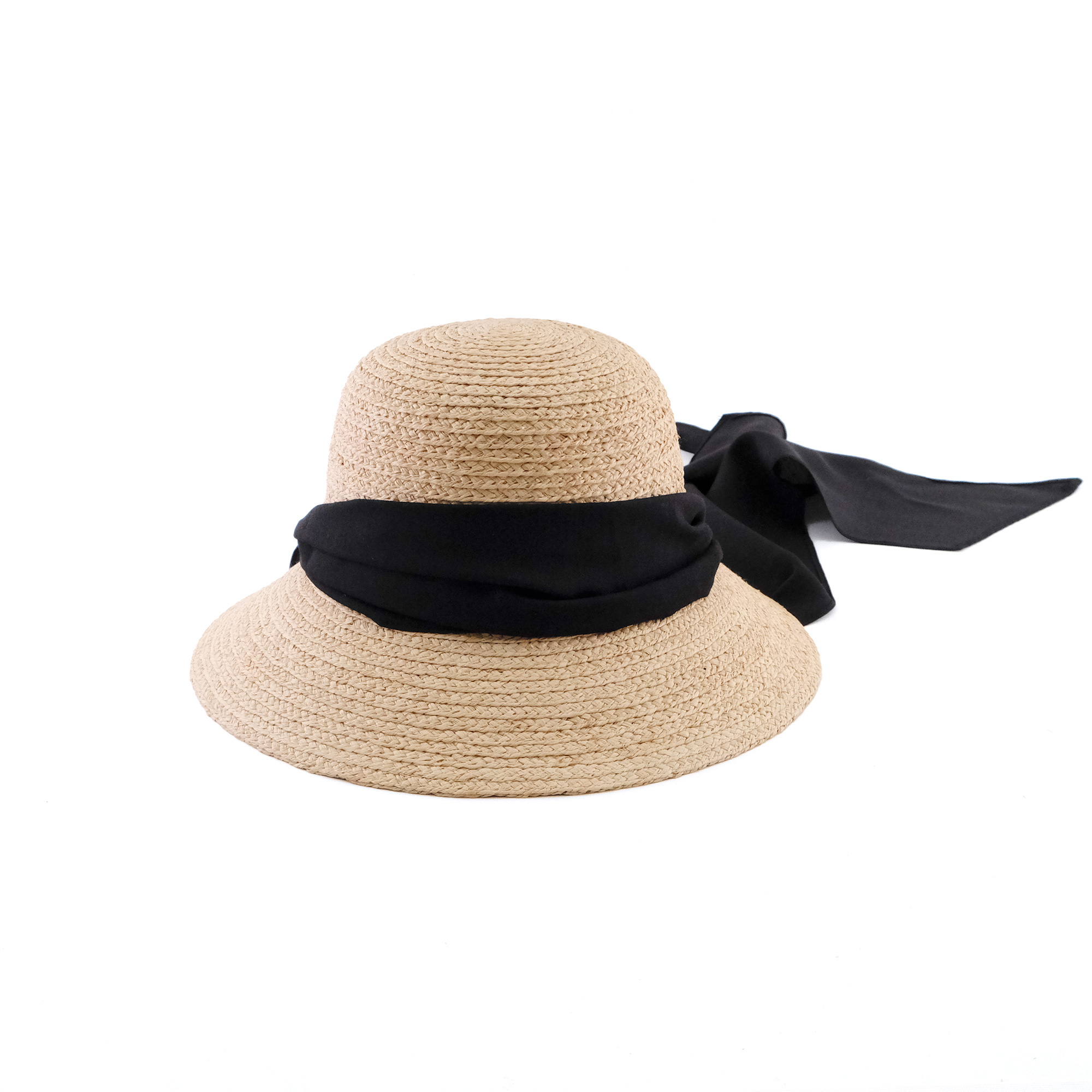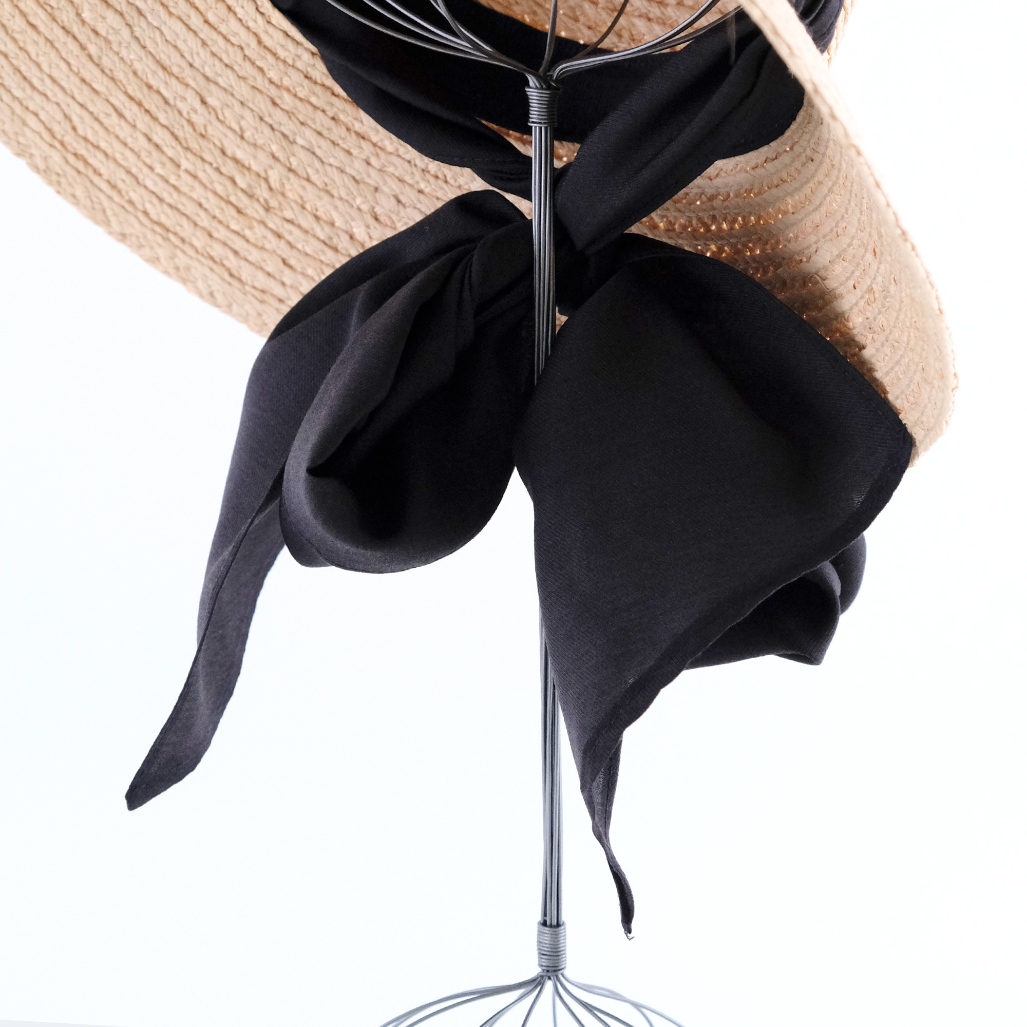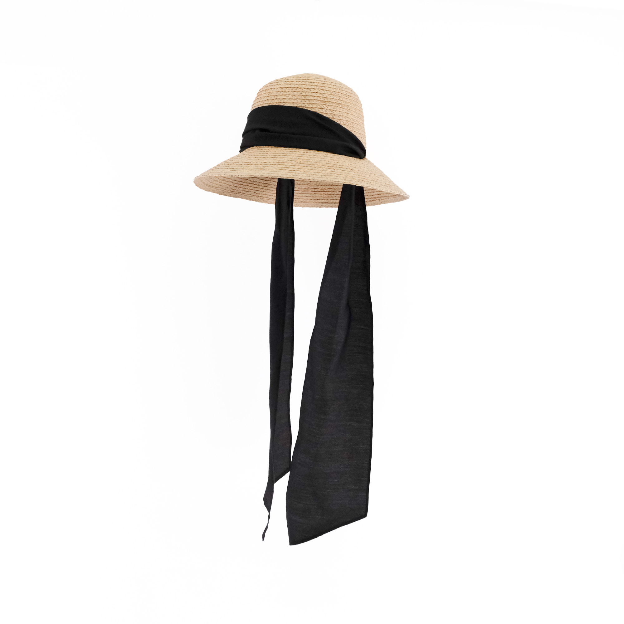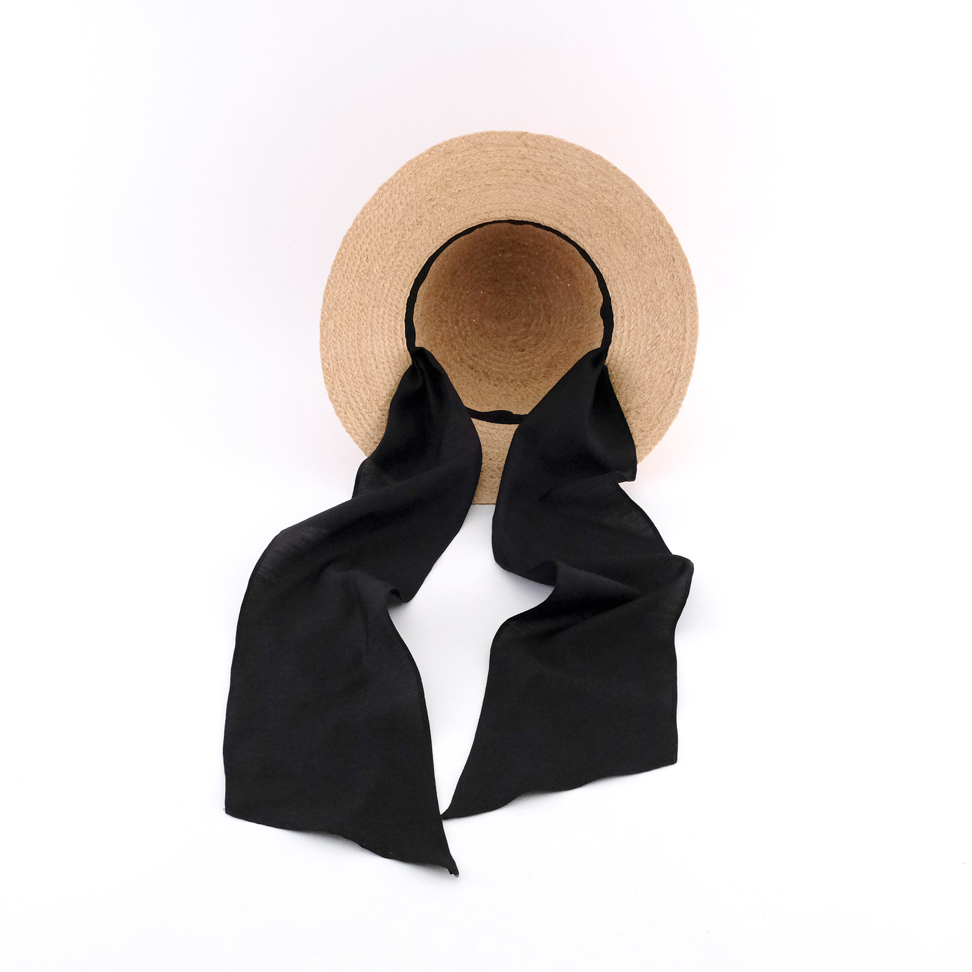 リボンスカーフが目を引くラフィアのブレードハット。リボンはサイドのスリットに通しているだけなので、手持ちのリボンやスカーフに差し替えることができます。前にたらしたり、後ろの首元で結んだりとアレンジをお楽しみいただけます。 ラフィア椰子という植物の葉の部分を加工した天然素材です。ひとつひとつ職人たちによるハンドメイドで生産しています。ラフィアは軽くて柔らかく、通気性が良いため、夏場など暑い季節にも快適に着用できます。また繊維が長く、丈夫で耐久性が高いため、長期間使い続けることができます。ラフィアは、他の天然素材に比べて樹脂を含んでいるため、柔らかく使用していくうちに艶が出て、経年変化を楽しむことができます。
