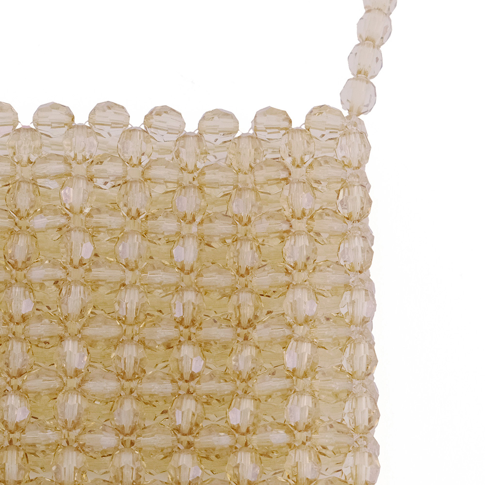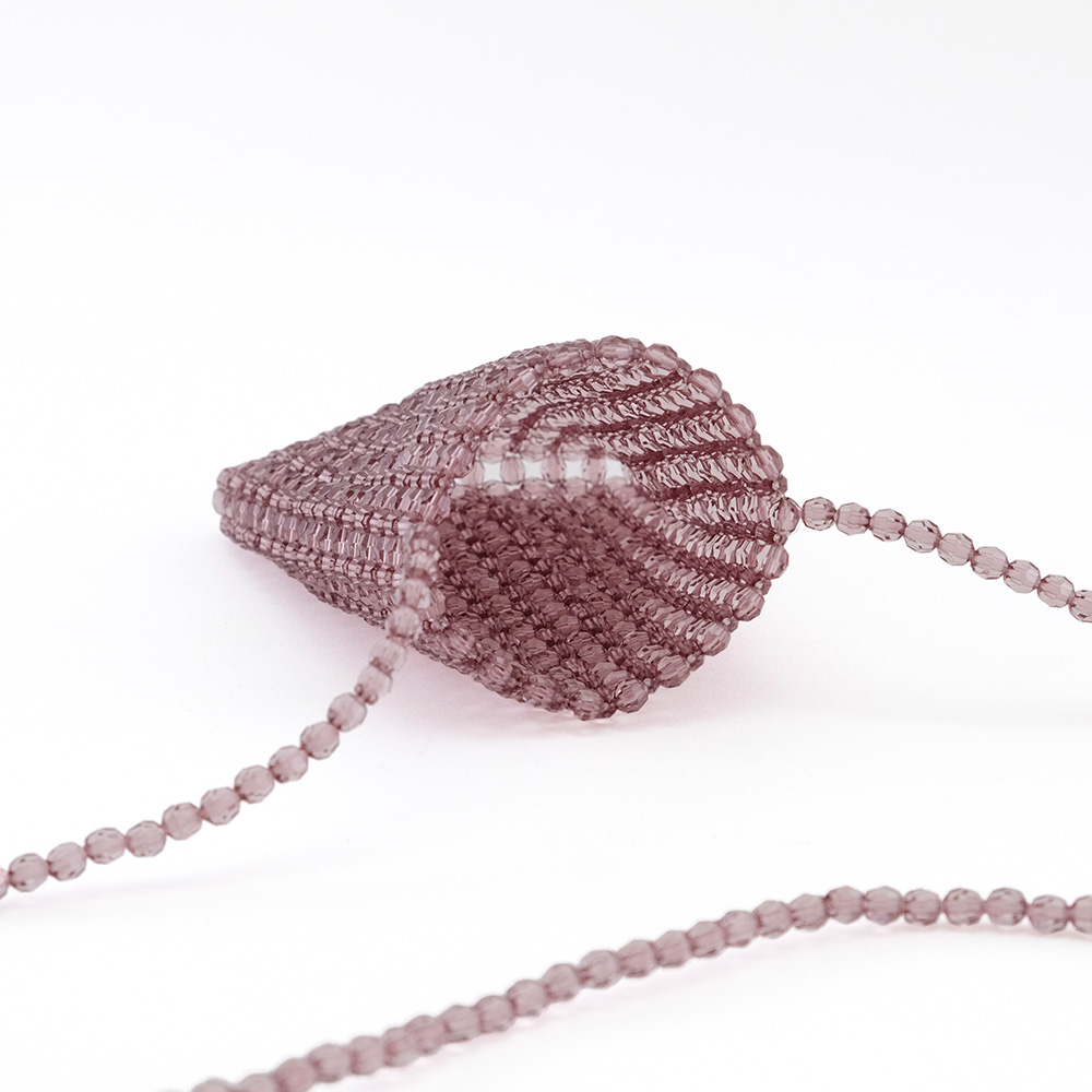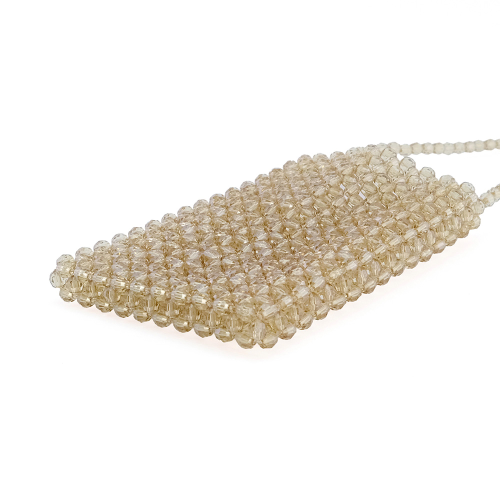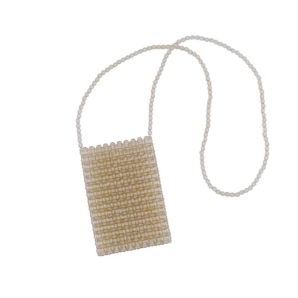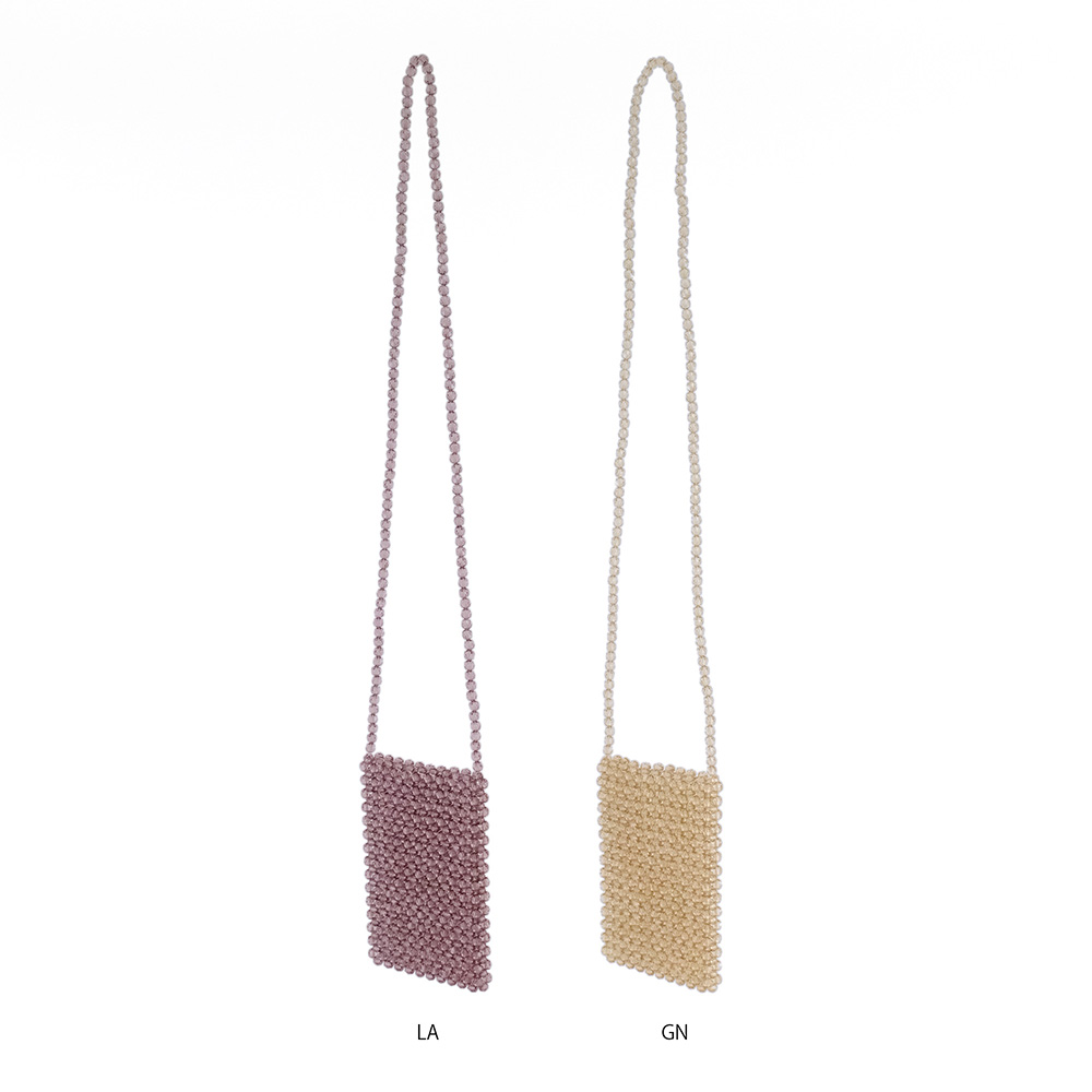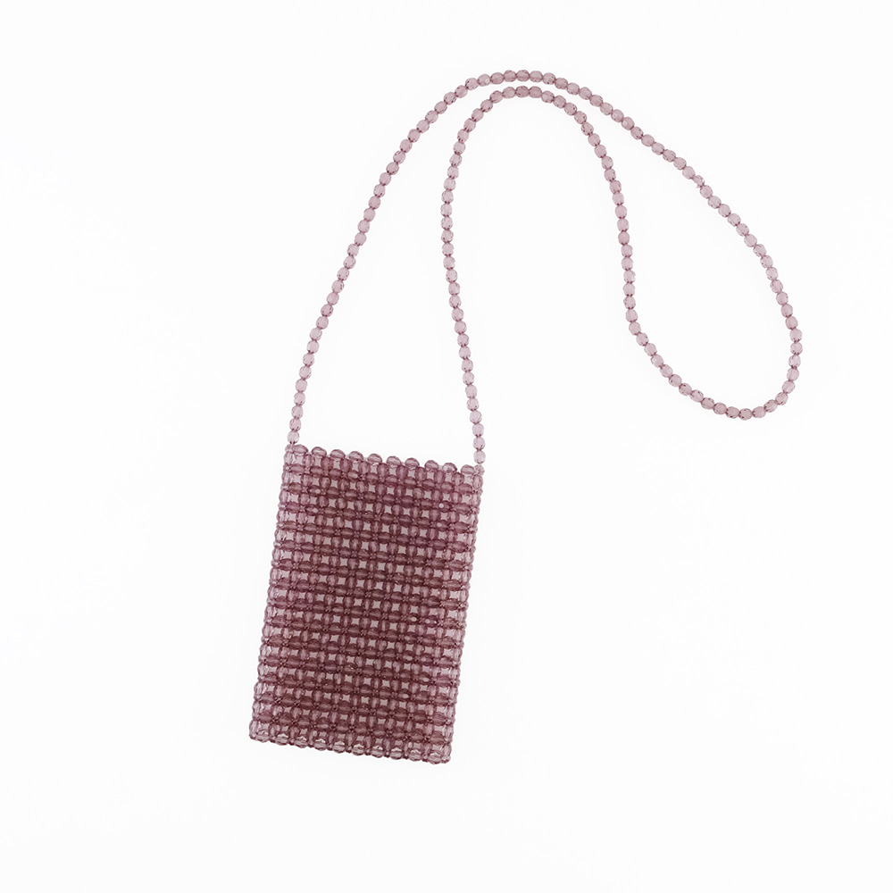 落ち着いた色合いの透明ビーズがキラキラと輝く、コーデのポイントとして楽しめるショルダー型のビーズポーチ。スマホがすっぽりと入るサイズ感で、リップなどの小物も空いたスペースに入ります。程よい透け感で、中に入れたアイテムでその日のカバンのカラーをお楽しみいただけます。 ラウンドカット型アクリルビーズは、ガラスビーズに比べて軽くて丈夫なのが特徴です。複数のカット面が光を反射するため、キラキラとした輝きを楽しめます。汚れてしまった場合は、柔らかい布で優しく拭き取ることで、いつまでも美しい輝きを保つことができます。