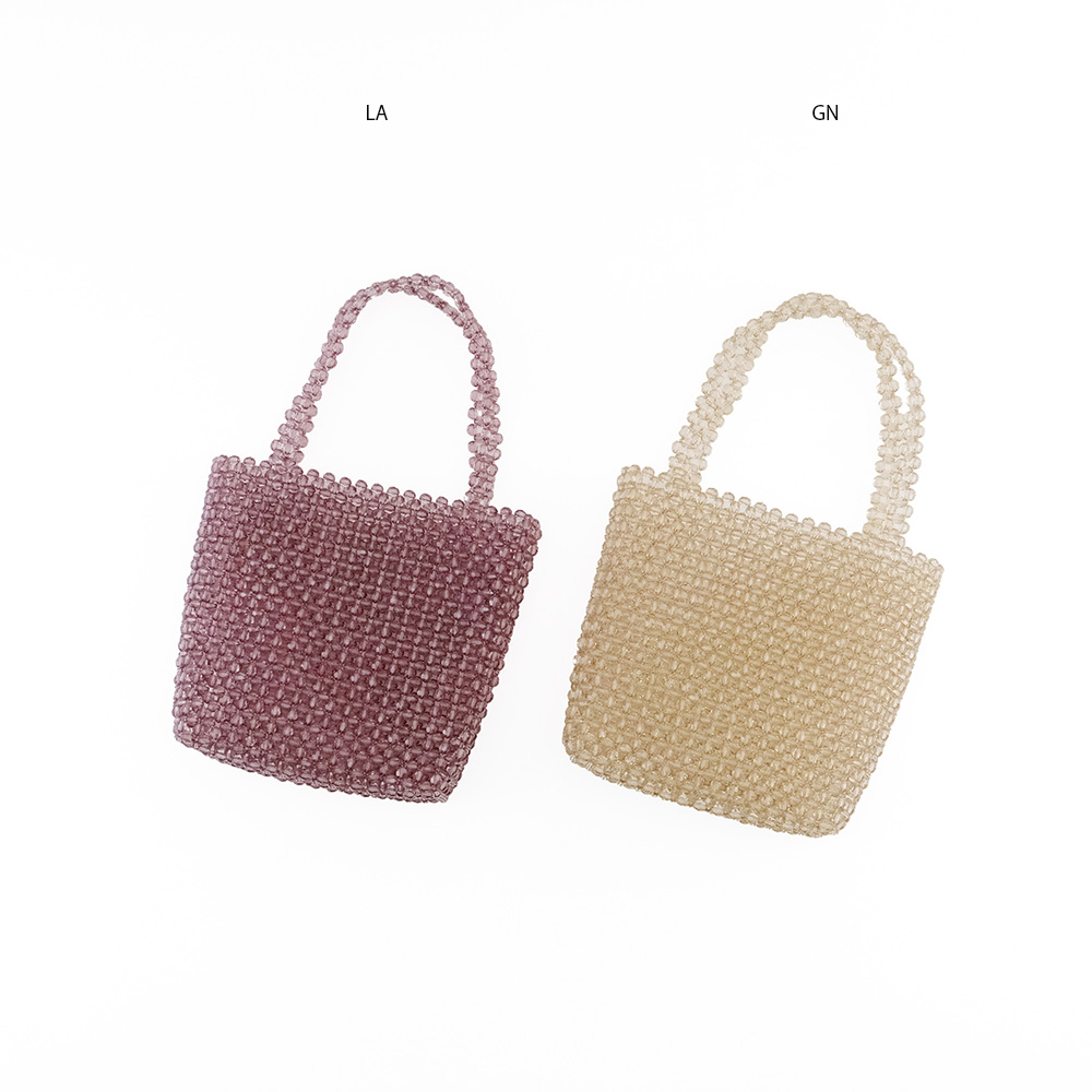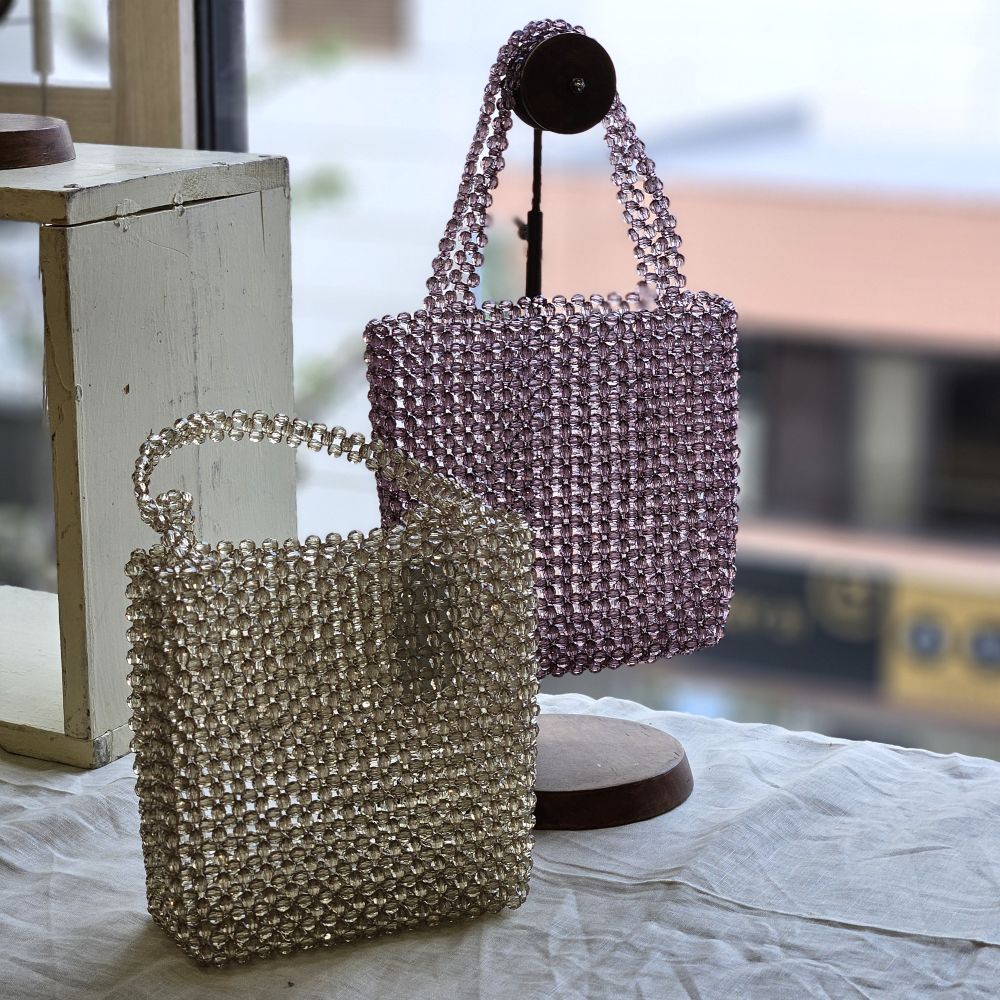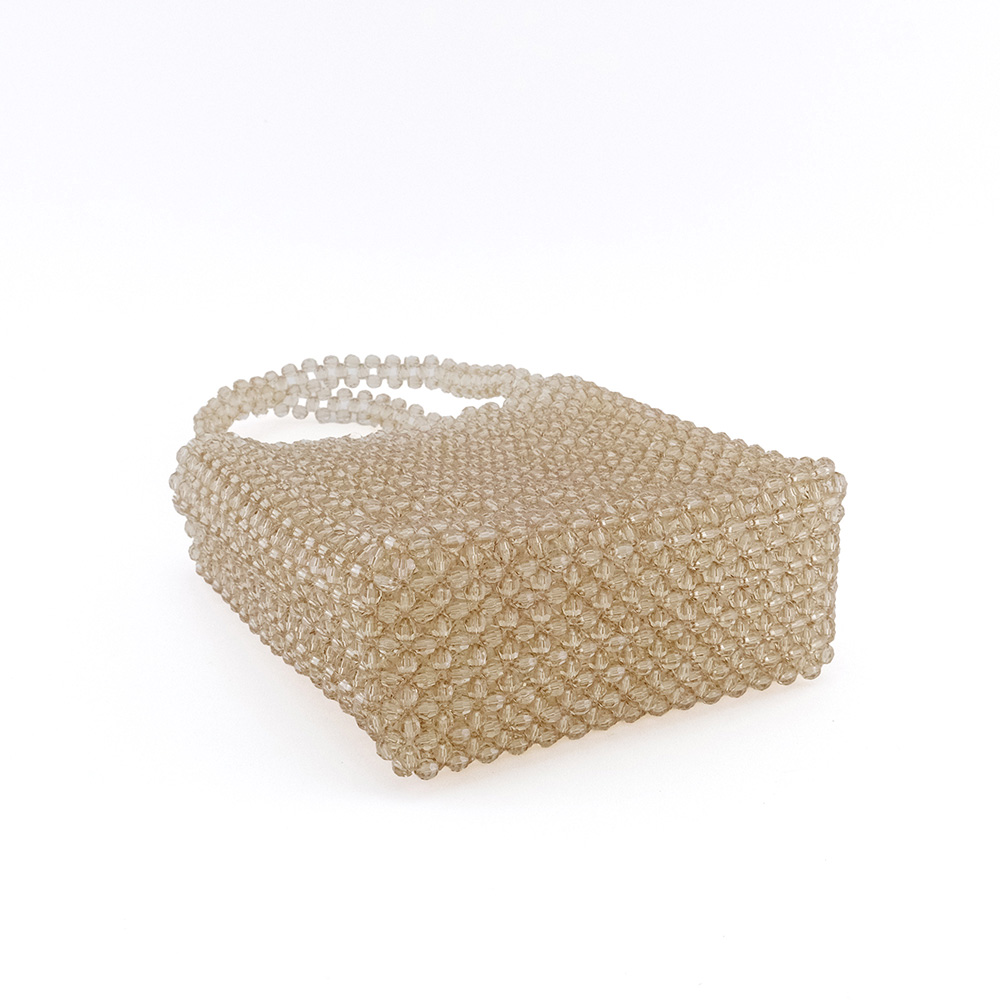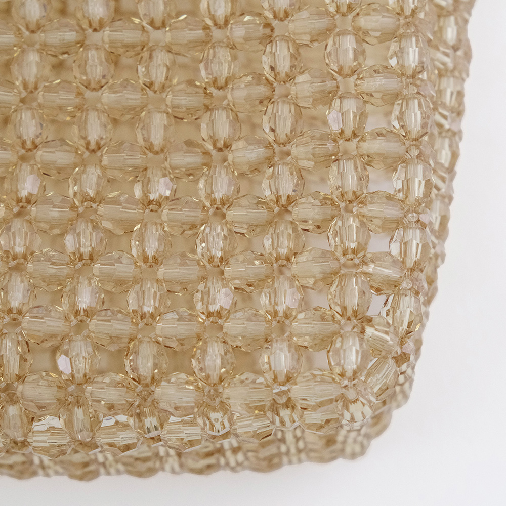 落ち着いた色合いの透明ビーズがキラキラと輝く、アクセサリー感覚で楽しめるビーズのハンドバッグ。しっかり自立するので、テーブルに置いても可愛いインテリアとして飾れます。程よい透け感で、中に入れたアイテムでその日のカバンのカラーをお楽しみいただけます。 ラウンドカット型アクリルビーズは、ガラスビーズに比べて軽くて丈夫なのが特徴です。複数のカット面が光を反射するため、キラキラとした輝きを楽しめます。汚れてしまった場合は、柔らかい布で優しく拭き取ることで、いつまでも美しい輝きを保つことができます。