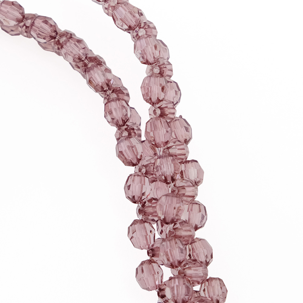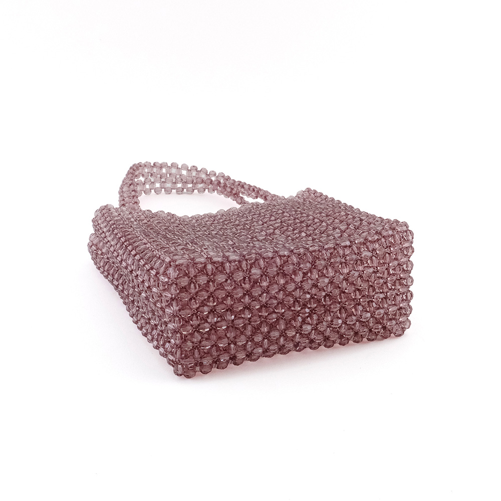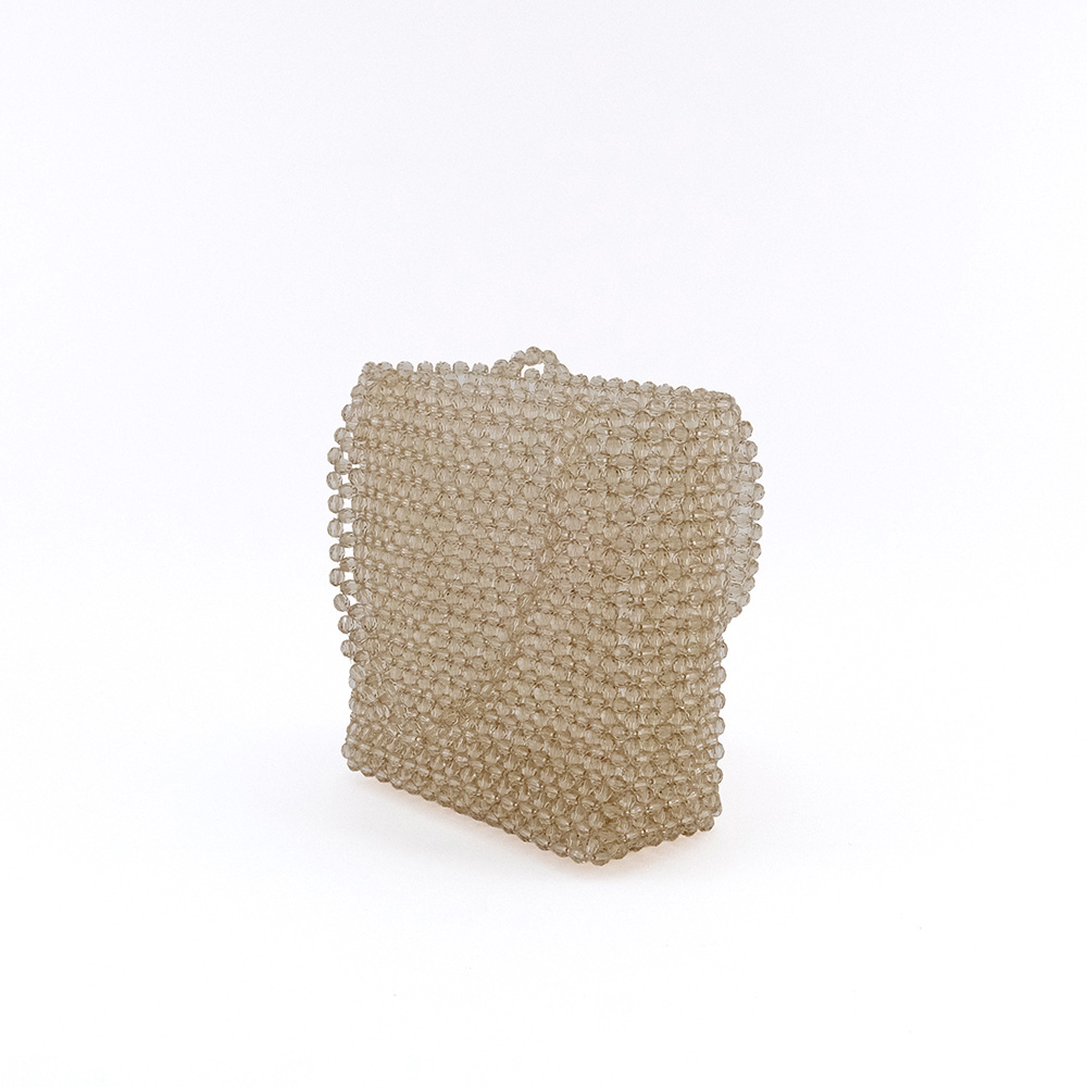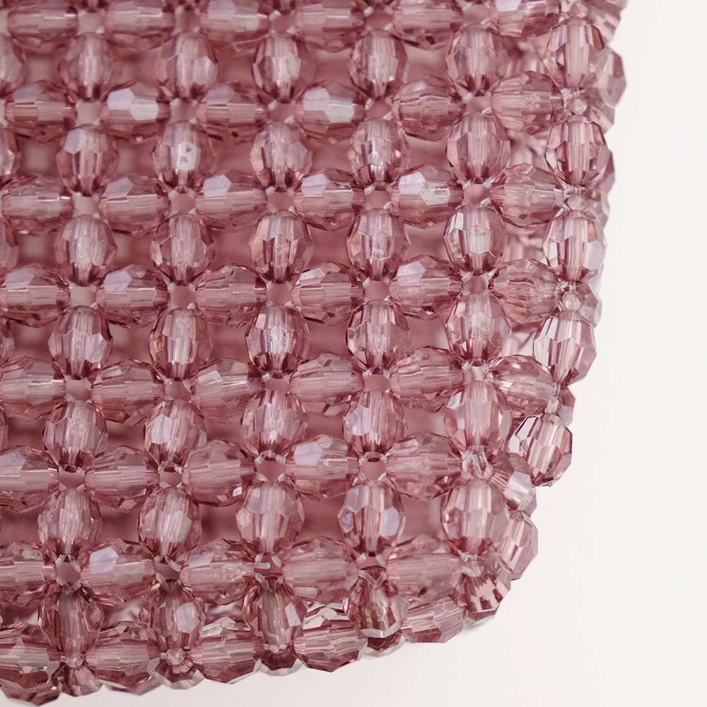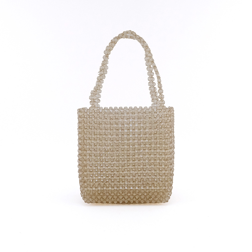 落ち着いた色合いの透明ビーズがキラキラと輝く、アクセサリー感覚で楽しめるビーズのハンドバッグ。しっかり自立するので、テーブルに置いても可愛いインテリアとして飾れます。程よい透け感で、中に入れたアイテムでその日のカバンのカラーをお楽しみいただけます。 ラウンドカット型アクリルビーズは、ガラスビーズに比べて軽くて丈夫なのが特徴です。複数のカット面が光を反射するため、キラキラとした輝きを楽しめます。汚れてしまった場合は、柔らかい布で優しく拭き取ることで、いつまでも美しい輝きを保つことができます。