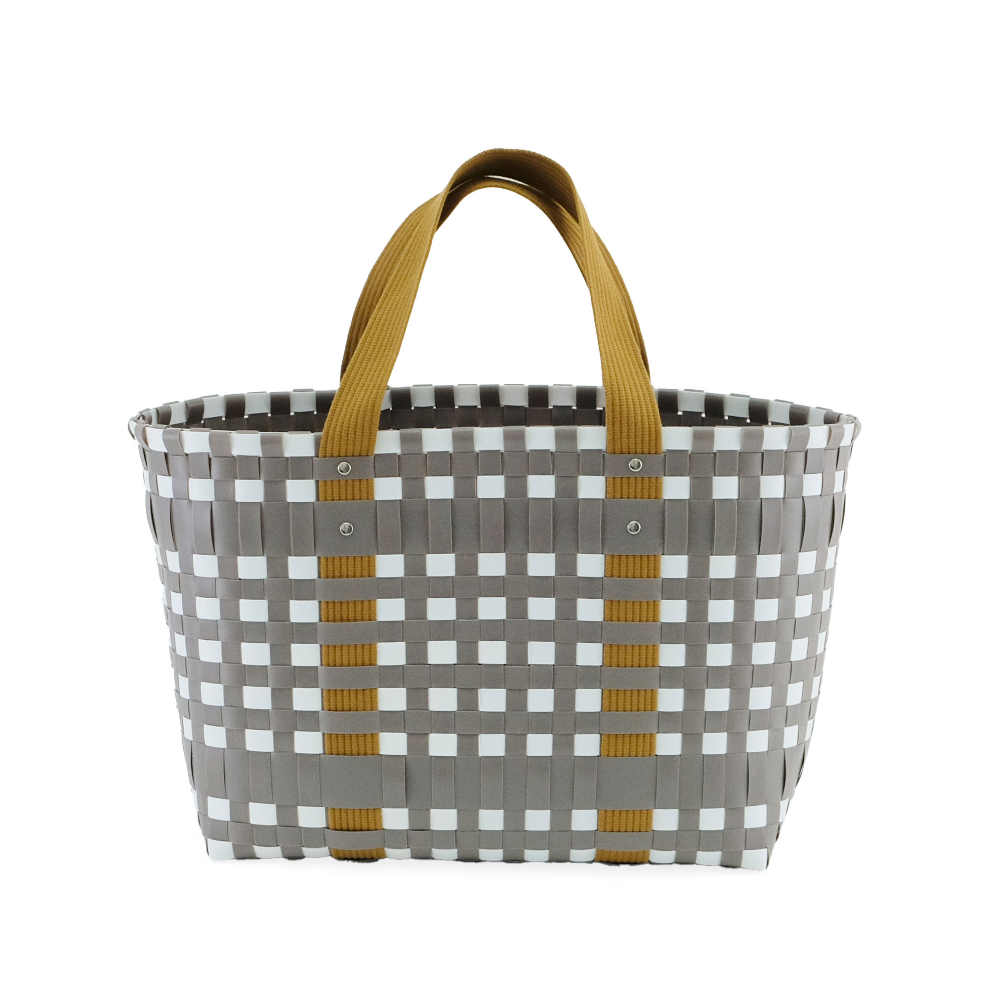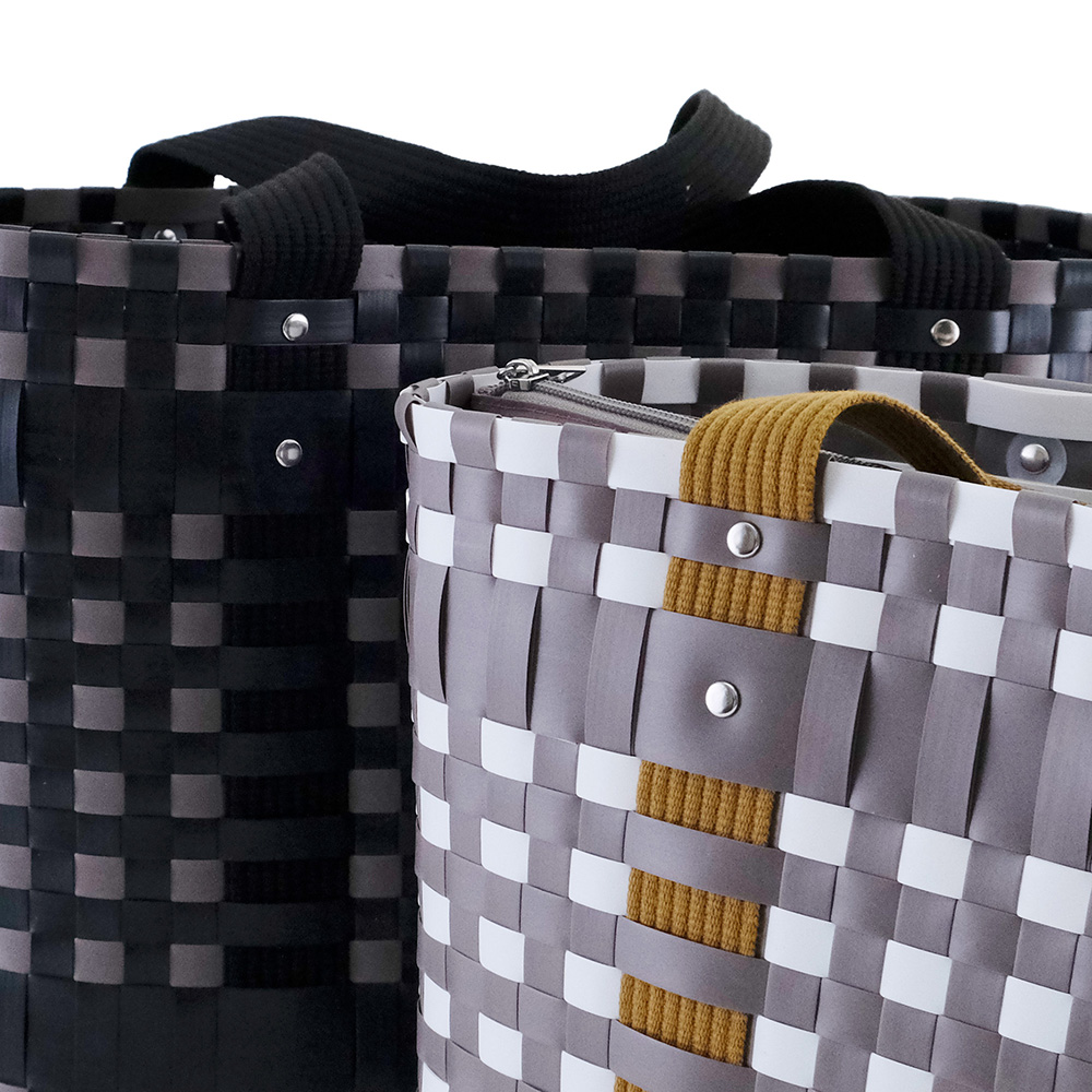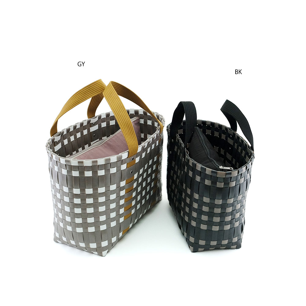 スタイリッシュなブロックチェックのバッグは、ほどよい光沢と丈夫さが魅力のPPブレードで仕上げました。水に強く汚れてもさっと拭けるから、デイリーユースはもちろん、ビーチやレジャーシーンにもぴったり。持ち手には柔らかいテープを採用し、重い荷物も肩や手に負担をかけずに持ち運べます。肩掛けできるLサイズは、ピクニックや週末の買い物に大活躍。一回り小さいSサイズはハンドバッグとして、近所への買い物やランチにちょうど良いサイズです。セパレートで使えるポーチは、内側に保冷素材を使用。保冷剤を入れれば、お弁当や飲み物、お菓子など、冷たい状態をキープしたいものを持ち運ぶのに便利です。 使用素材であるポリプロピレンは、丈夫で水に強く、軽くて、耐久性に優れ伸び縮みしにくい素材で型崩れしにくいのが特徴です。また吸水性・吸湿性が低く速乾性や耐候性に優れており、劣化しにくいという特徴もあります。 >>ファッション