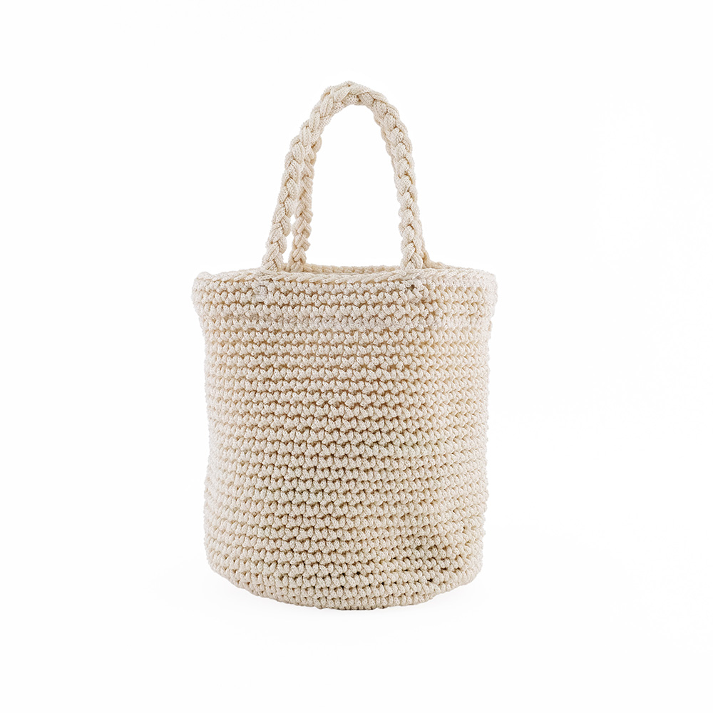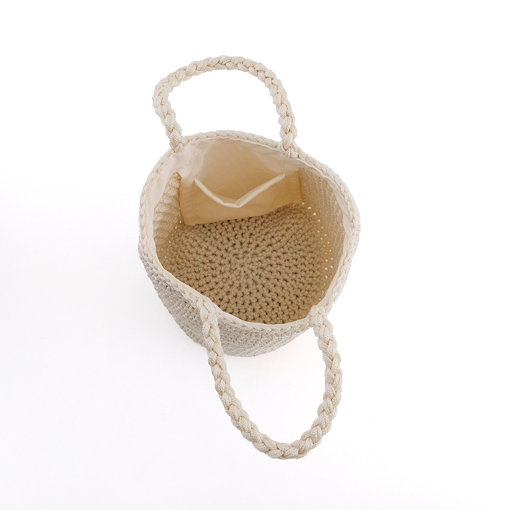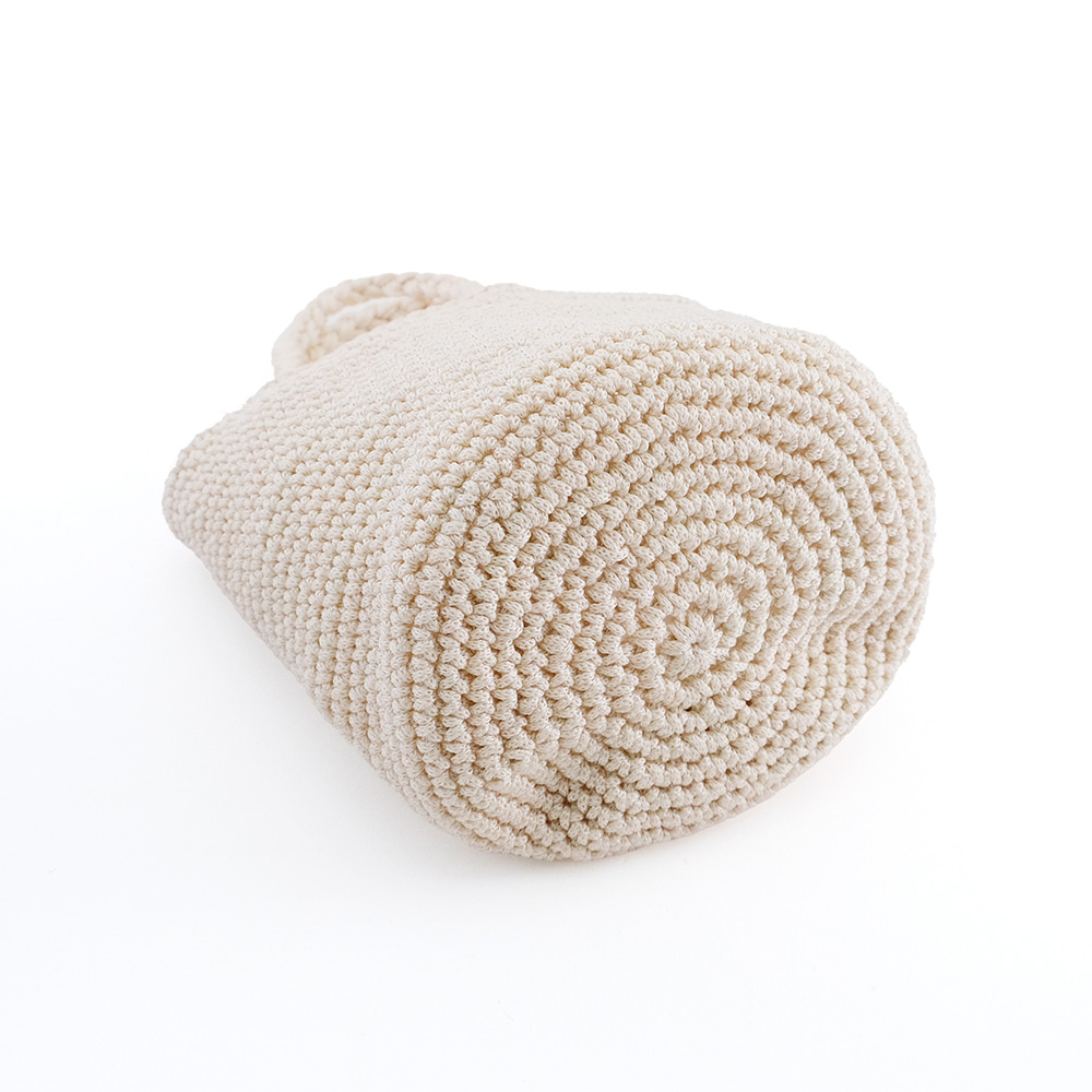 柔らかく膨らみのあるポリエステルヤーンを丁寧にクロシェ編みで仕上げたラウンドミニバッグ。素材の軽さを活かすため、裏地の使用を減らしてハンギングポケットでシンプルに仕上げました。少しばかり光沢のある素材は年齢の幅を選ばず、自分らしくアレンジができるベーシックなシルエットが特徴です。 使用素材であるポリプロピレンは、丈夫で水に強く、軽くて、耐久性に優れ伸び縮みしにくい素材で型崩れしにくいのが特徴です。また吸水性・吸湿性が低く速乾性や耐候性に優れており、劣化しにくいという特徴もあります。