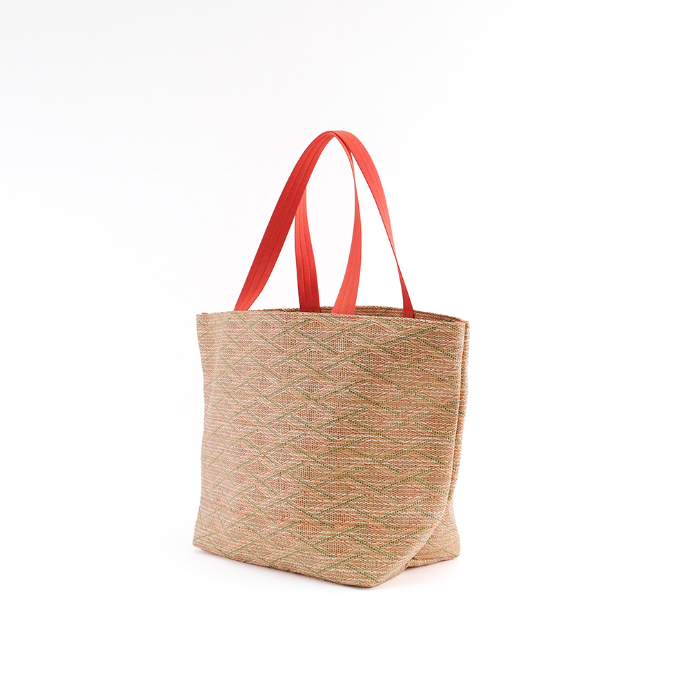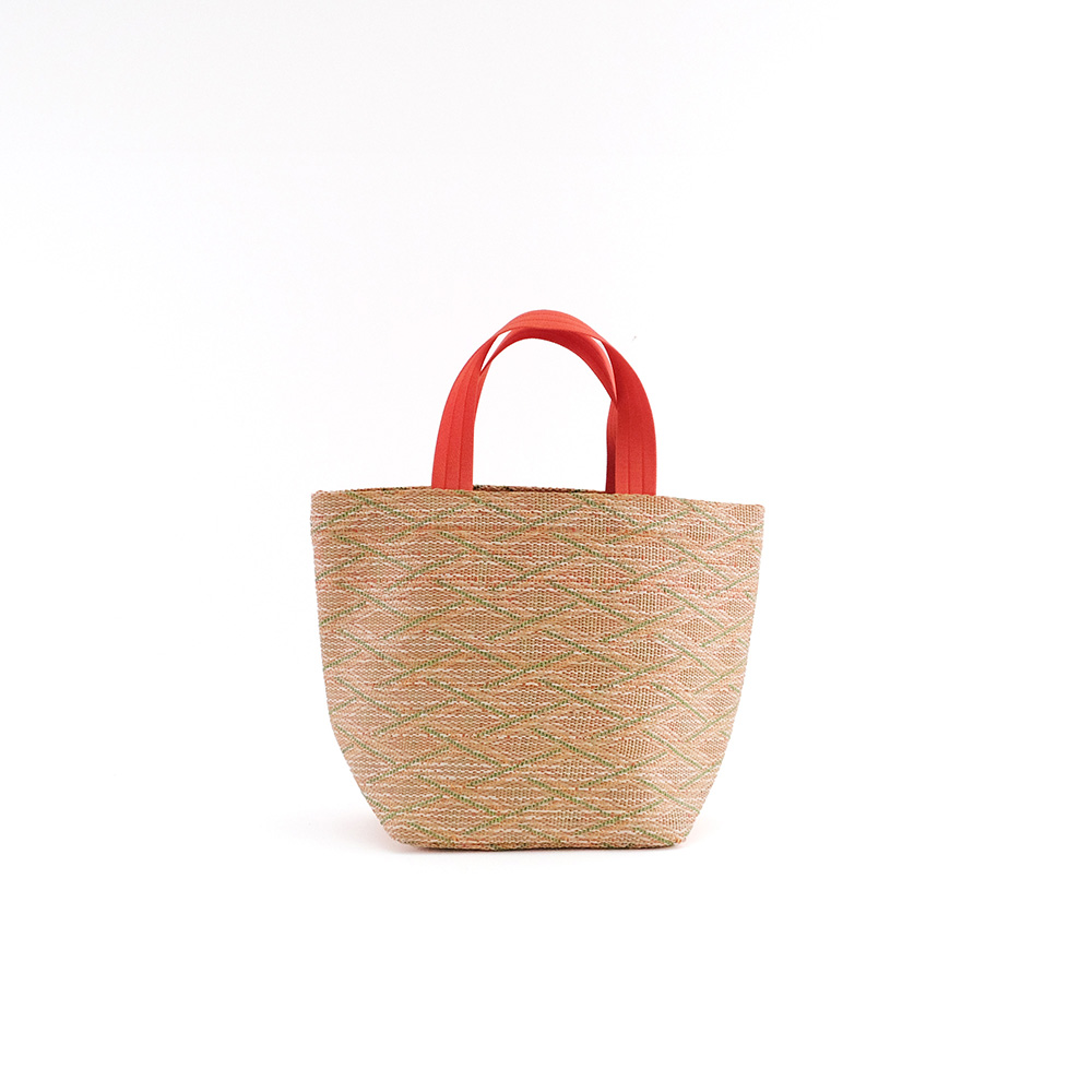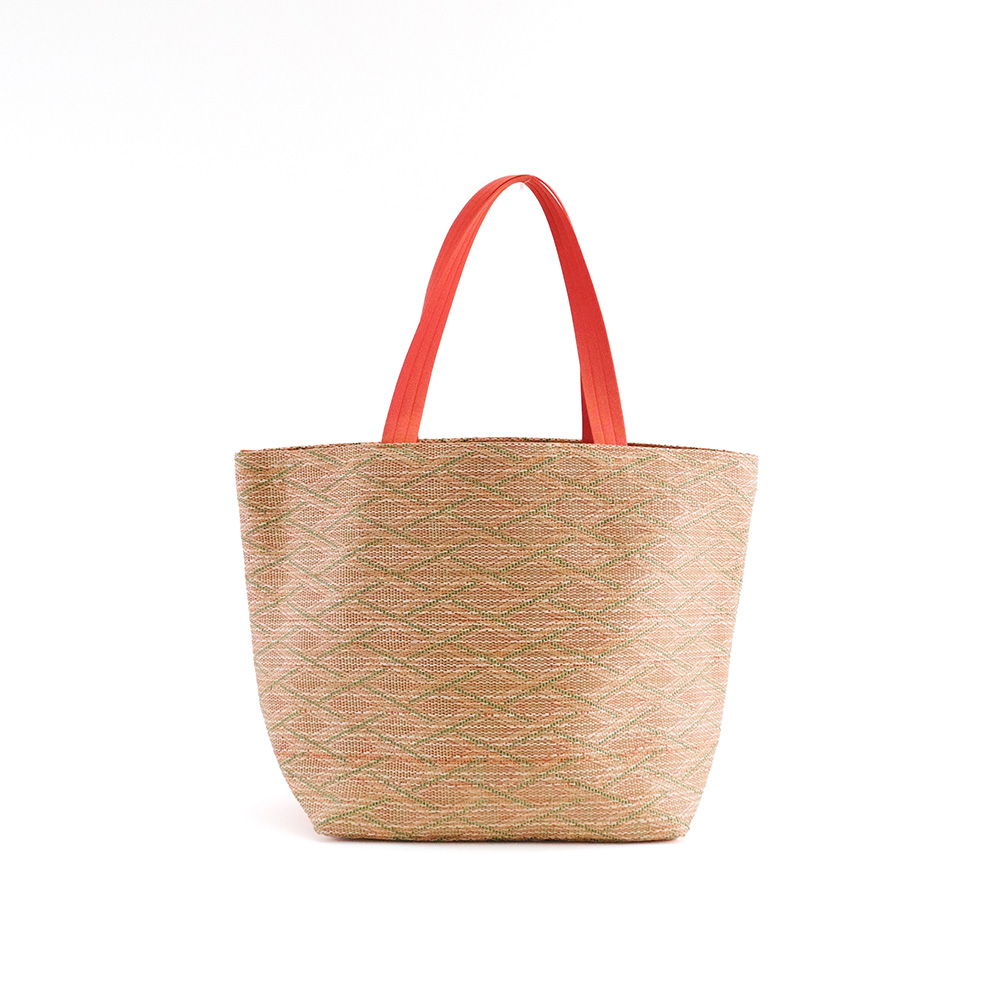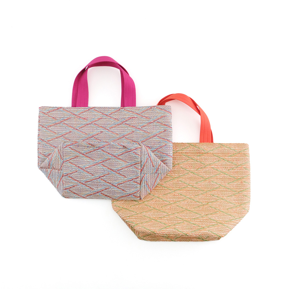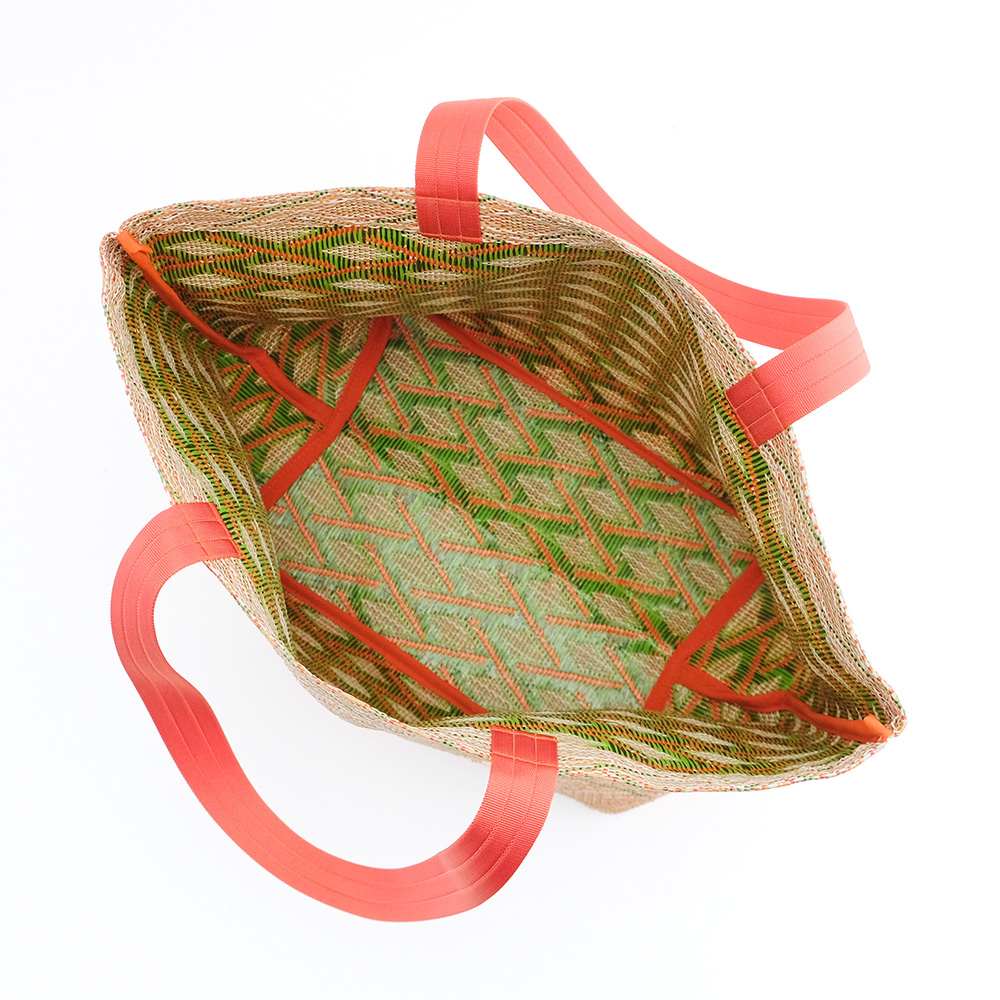 古い織機を用いて、細いポリプロピレン素材を丁寧に編み上げたシートを使ったバッグ。ポリプロピレンは軽くて丈夫なうえ、水や汚れに強く、丸ごと洗えるので日常使いはもちろん、アウトドアやレジャーシーンでも気兼ねなく活躍します。荷物をしっかり収納できるサイズ感ながら軽量で持ち運びもラクなのも魅力。 広い公園やビーチなどのレジャーシーンでも映えるデザインにするため、鮮やかなカラーリングの本体に合わせて、持ち手も鮮やかにしました。自然の中で持っていても気分が上がる華やかさがあり、ピクニックやキャンプ、旅行先などで活躍します。シンプルながら存在感のあるデザインは、ファッションのアクセントにもなり、幅広いシーンでお使いいただけます。 使用素材であるポリプロピレンは、丈夫で水に強く、軽くて、耐久性に優れ伸び縮みしにくい素材で型崩れしにくいのが特徴です。また吸水性・吸湿性が低く速乾性や耐候性に優れており、劣化しにくいという特徴もあります。