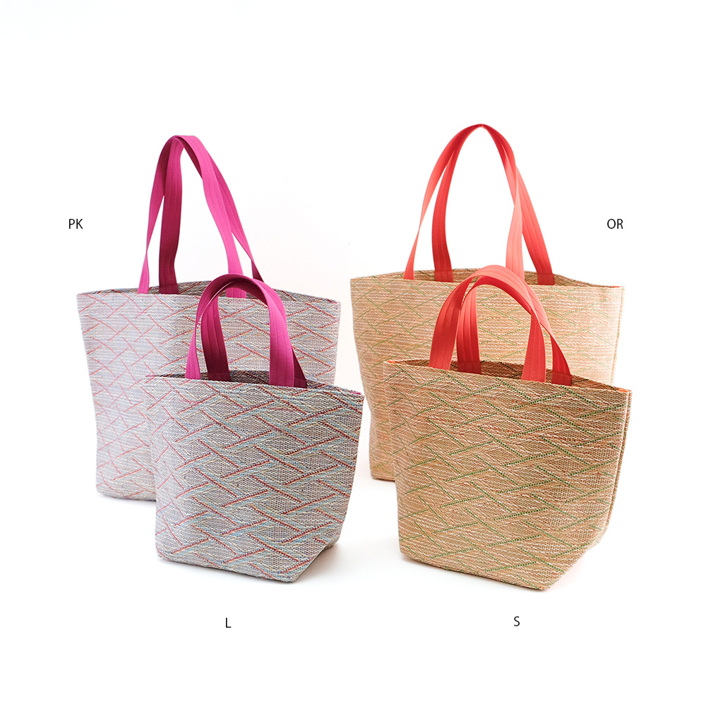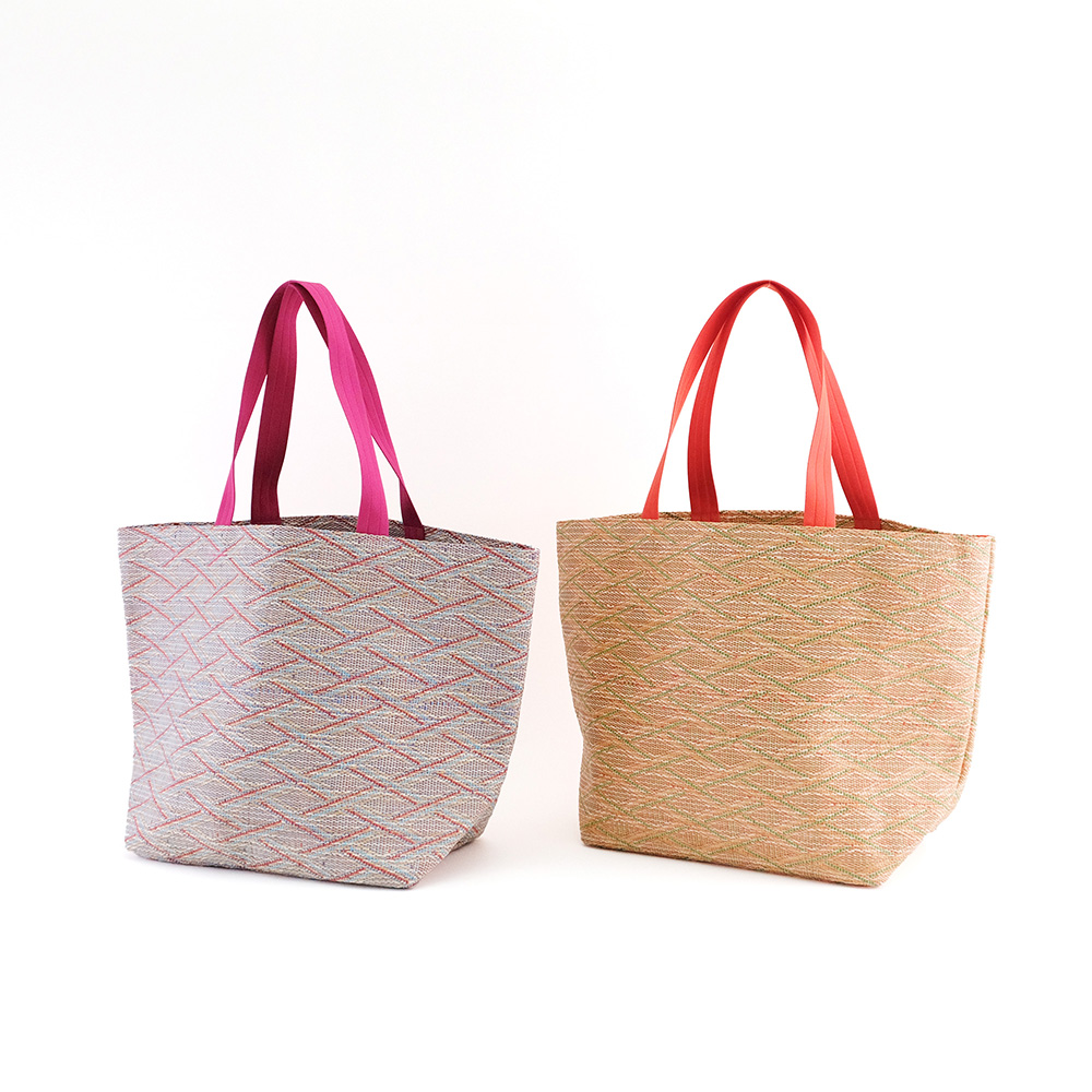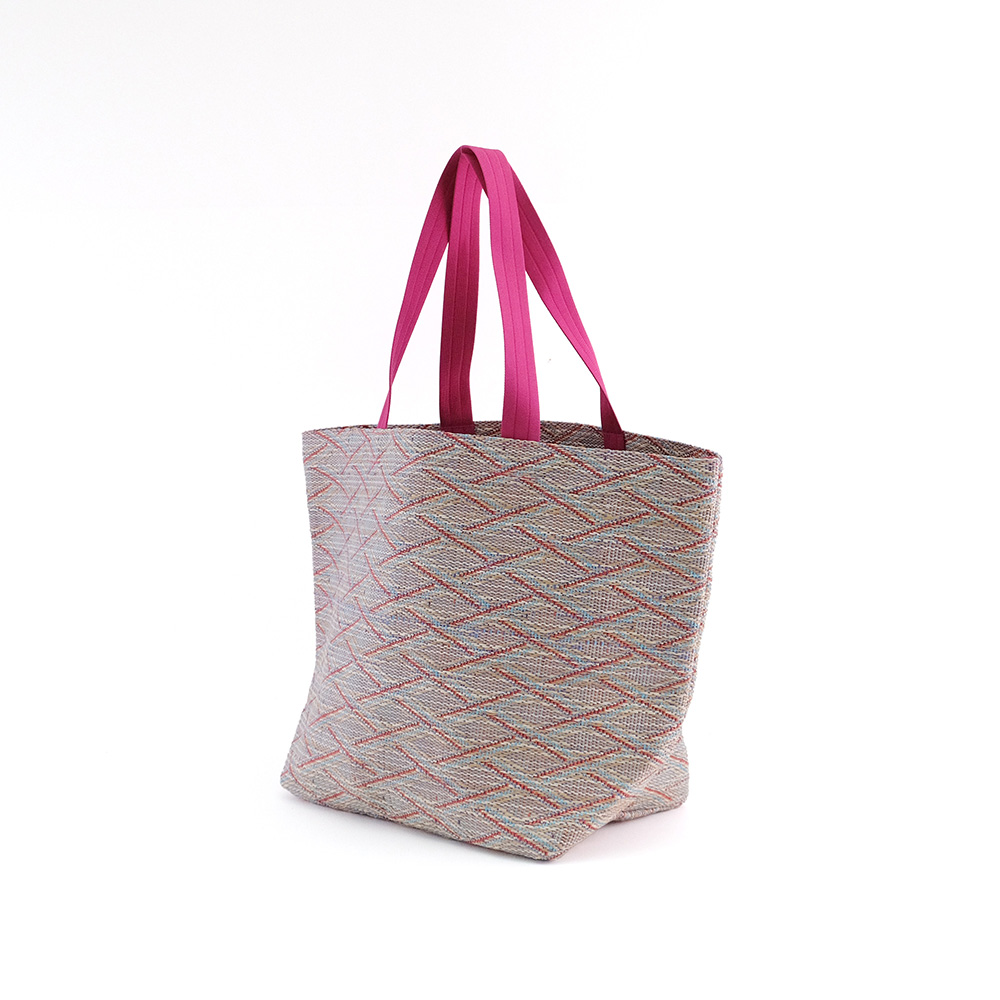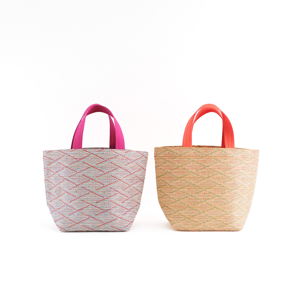古い織機を用いて、細いポリプロピレン素材を丁寧に編み上げたシートを使ったバッグ。ポリプロピレンは軽くて丈夫なうえ、水や汚れに強く、丸ごと洗えるので日常使いはもちろん、アウトドアやレジャーシーンでも気兼ねなく活躍します。荷物をしっかり収納できるサイズ感ながら軽量で持ち運びもラクなのも魅力。 広い公園やビーチなどのレジャーシーンでも映えるデザインにするため、鮮やかなカラーリングの本体に合わせて、持ち手も鮮やかにしました。自然の中で持っていても気分が上がる華やかさがあり、ピクニックやキャンプ、旅行先などで活躍します。シンプルながら存在感のあるデザインは、ファッションのアクセントにもなり、幅広いシーンでお使いいただけます。 使用素材であるポリプロピレンは、丈夫で水に強く、軽くて、耐久性に優れ伸び縮みしにくい素材で型崩れしにくいのが特徴です。また吸水性・吸湿性が低く速乾性や耐候性に優れており、劣化しにくいという特徴もあります。