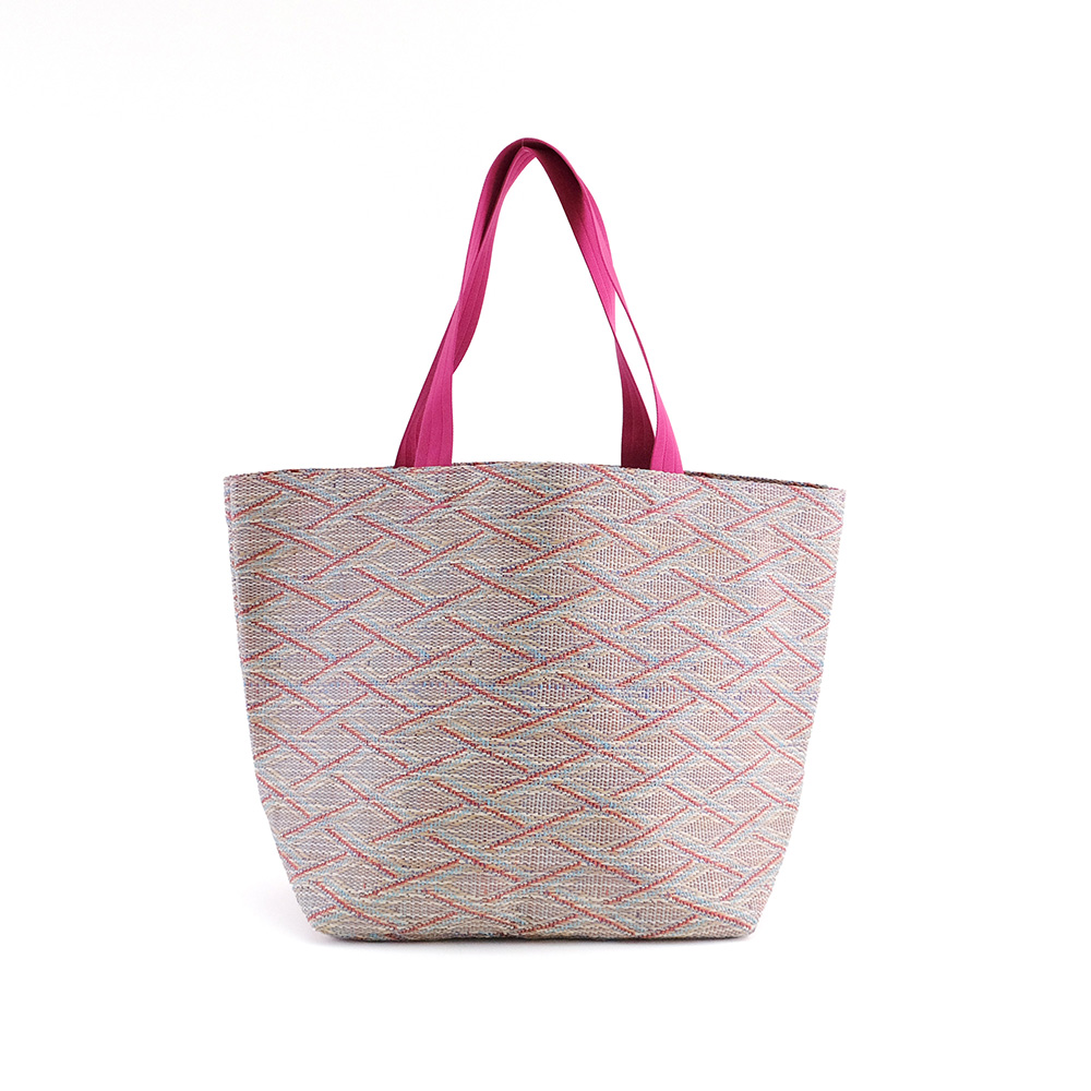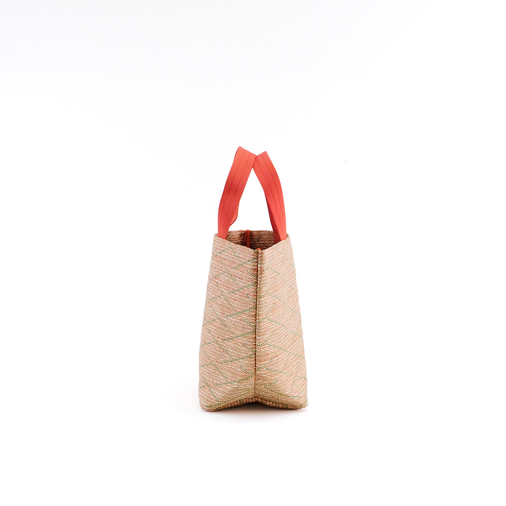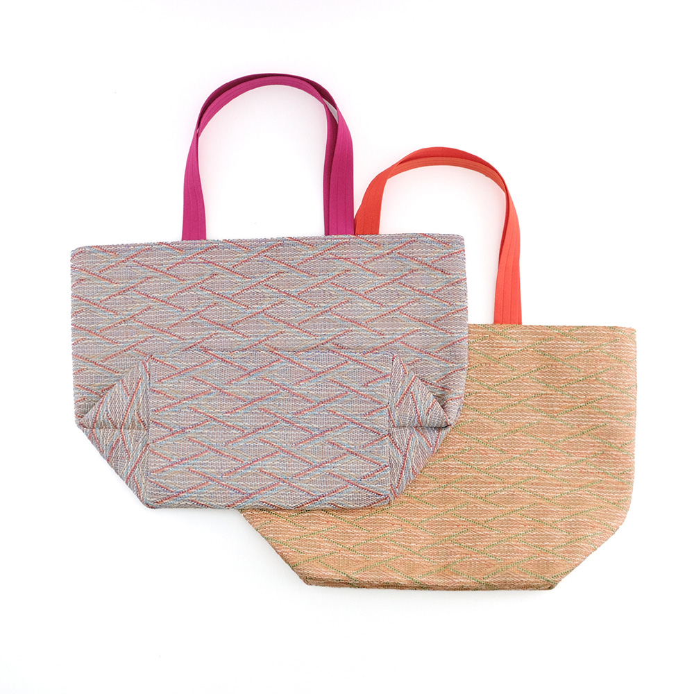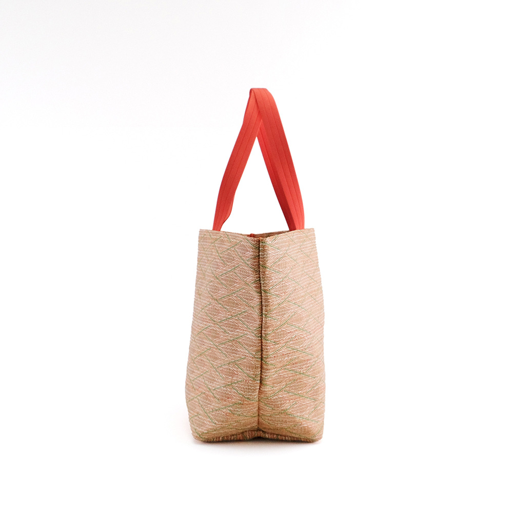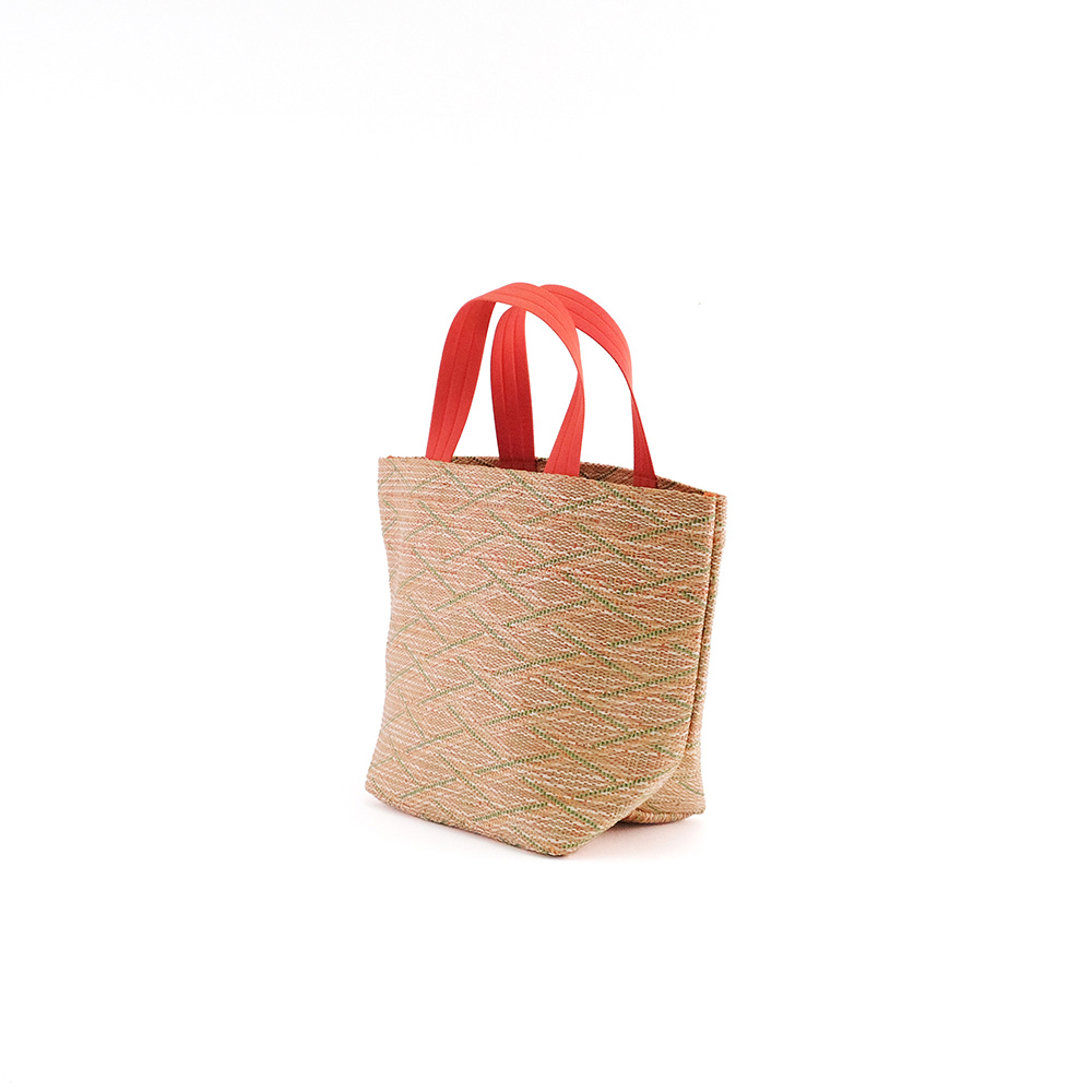 古い織機を用いて、細いポリプロピレン素材を丁寧に編み上げたシートを使ったバッグ。ポリプロピレンは軽くて丈夫なうえ、水や汚れに強く、丸ごと洗えるので日常使いはもちろん、アウトドアやレジャーシーンでも気兼ねなく活躍します。荷物をしっかり収納できるサイズ感ながら軽量で持ち運びもラクなのも魅力。 広い公園やビーチなどのレジャーシーンでも映えるデザインにするため、鮮やかなカラーリングの本体に合わせて、持ち手も鮮やかにしました。自然の中で持っていても気分が上がる華やかさがあり、ピクニックやキャンプ、旅行先などで活躍します。シンプルながら存在感のあるデザインは、ファッションのアクセントにもなり、幅広いシーンでお使いいただけます。 使用素材であるポリプロピレンは、丈夫で水に強く、軽くて、耐久性に優れ伸び縮みしにくい素材で型崩れしにくいのが特徴です。また吸水性・吸湿性が低く速乾性や耐候性に優れており、劣化しにくいという特徴もあります。