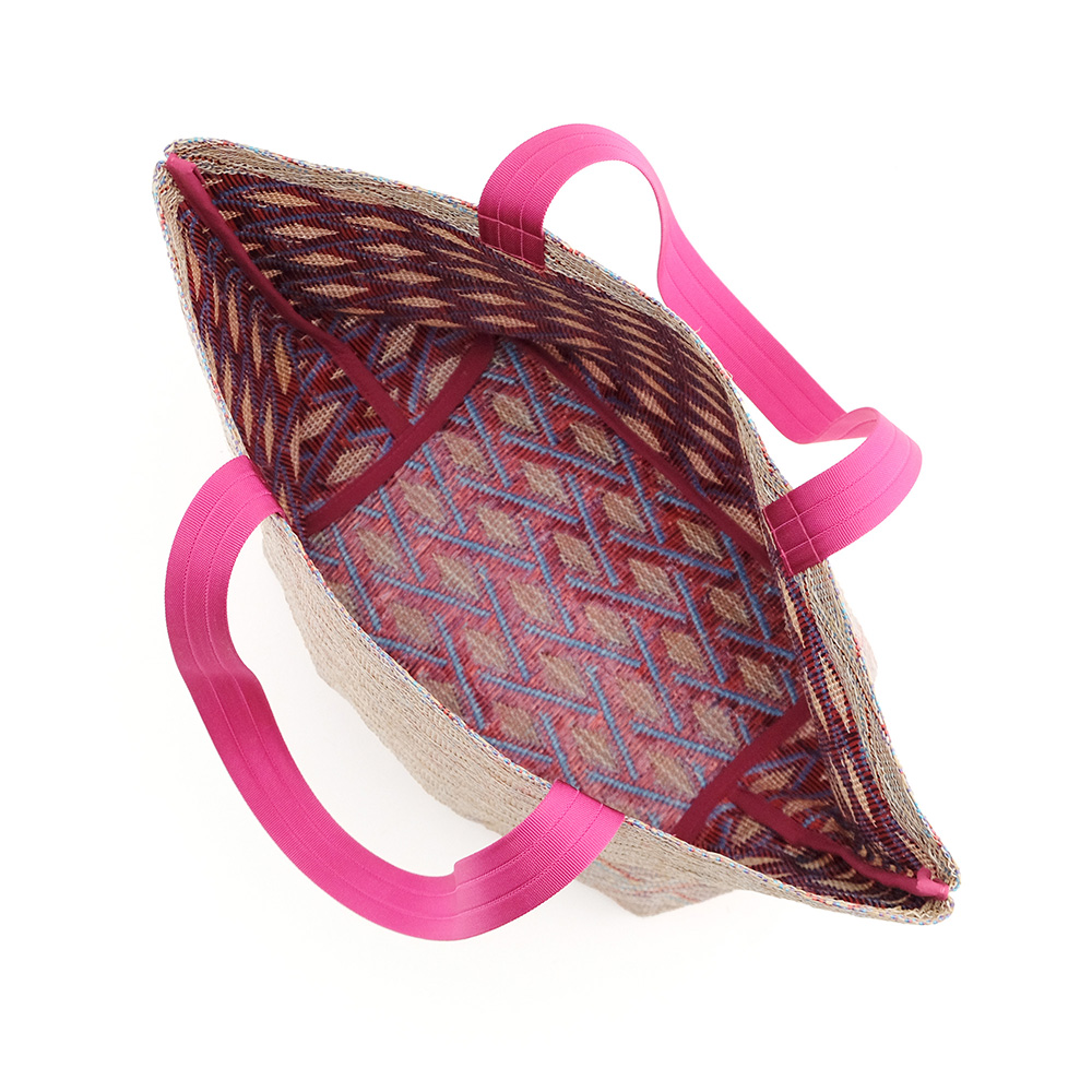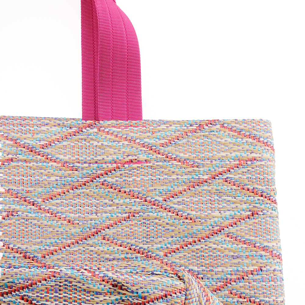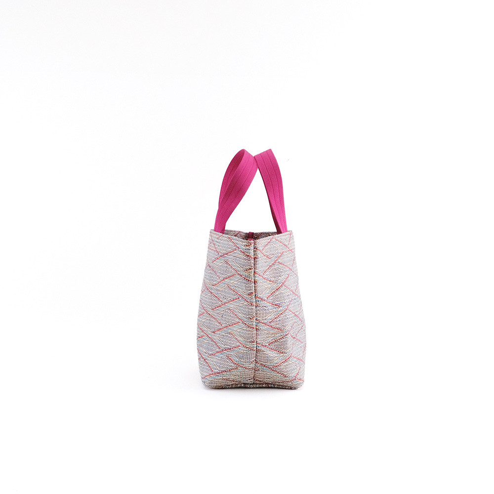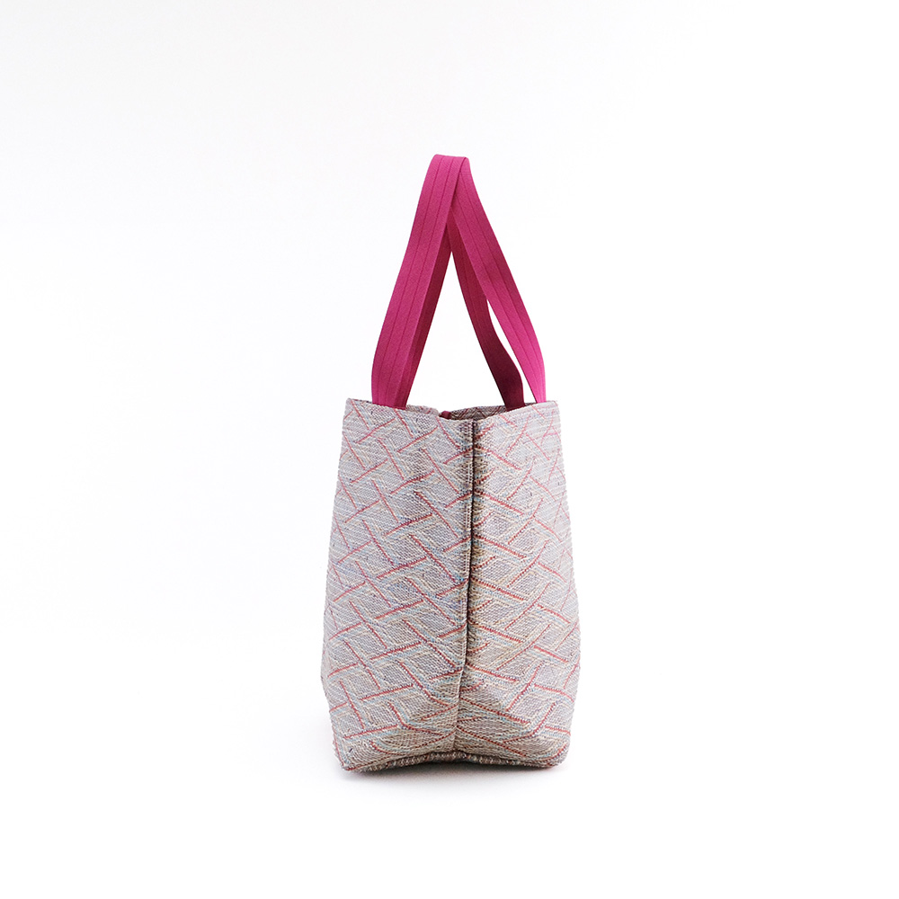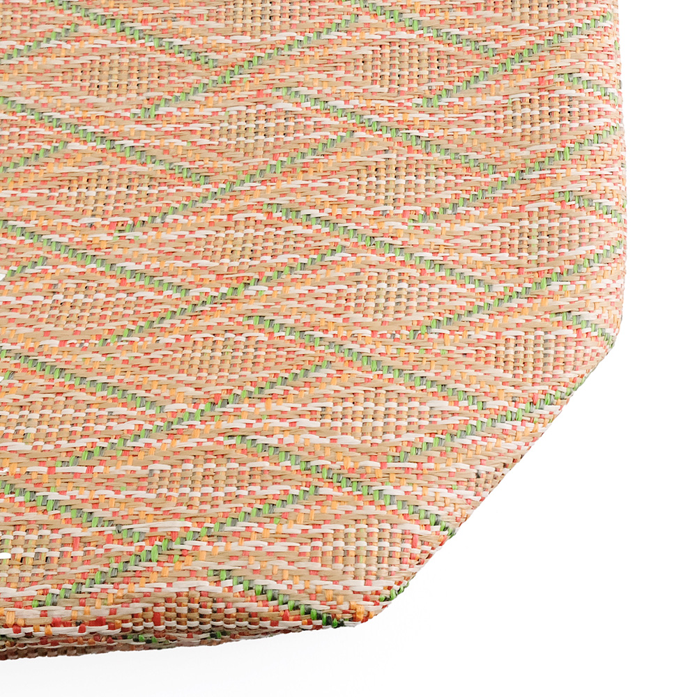 古い織機を用いて、細いポリプロピレン素材を丁寧に編み上げたシートを使ったバッグ。ポリプロピレンは軽くて丈夫なうえ、水や汚れに強く、丸ごと洗えるので日常使いはもちろん、アウトドアやレジャーシーンでも気兼ねなく活躍します。荷物をしっかり収納できるサイズ感ながら軽量で持ち運びもラクなのも魅力。 広い公園やビーチなどのレジャーシーンでも映えるデザインにするため、鮮やかなカラーリングの本体に合わせて、持ち手も鮮やかにしました。自然の中で持っていても気分が上がる華やかさがあり、ピクニックやキャンプ、旅行先などで活躍します。シンプルながら存在感のあるデザインは、ファッションのアクセントにもなり、幅広いシーンでお使いいただけます。 使用素材であるポリプロピレンは、丈夫で水に強く、軽くて、耐久性に優れ伸び縮みしにくい素材で型崩れしにくいのが特徴です。また吸水性・吸湿性が低く速乾性や耐候性に優れており、劣化しにくいという特徴もあります。