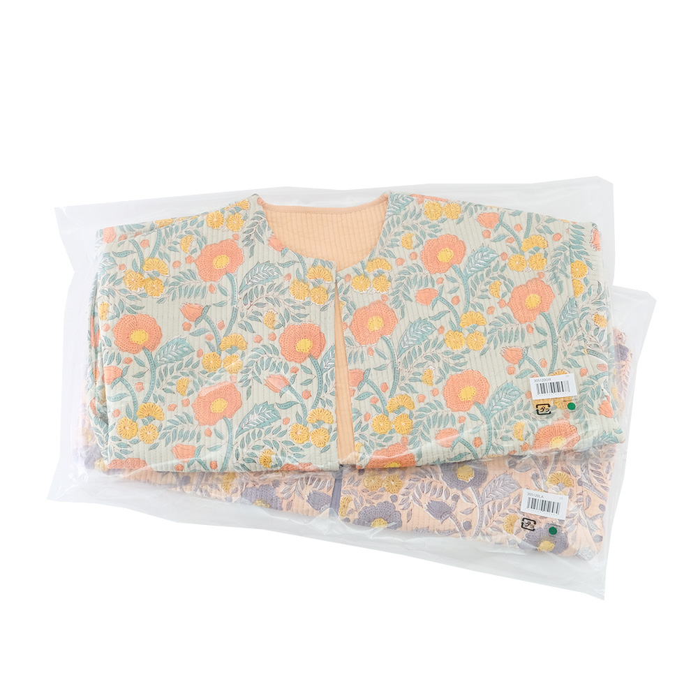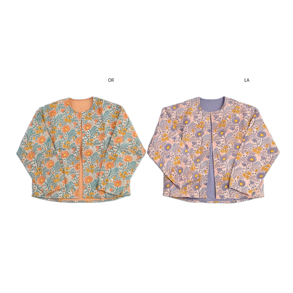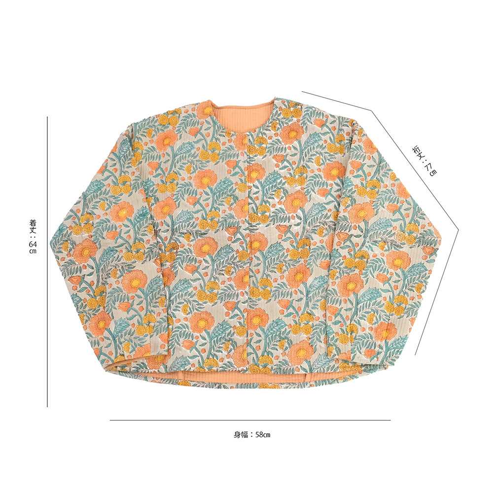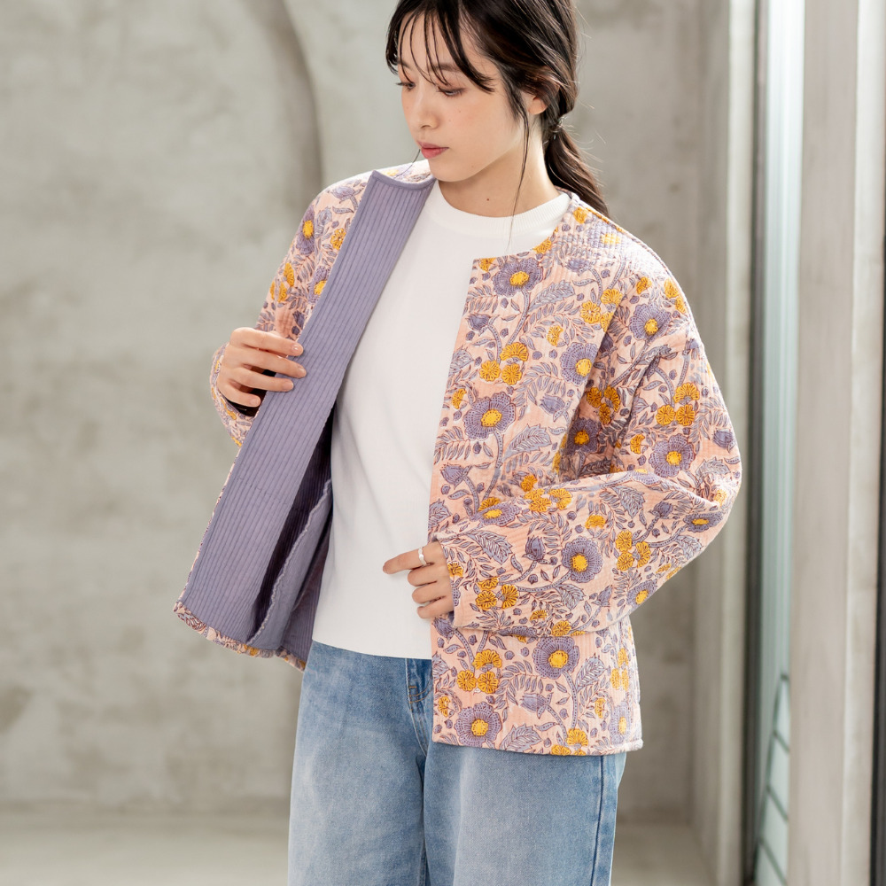 ふわりと羽織れる薄手のコットンキルトは、肌寒さが残る春先に大活躍。おうちでのリラックスタイムから、ちょっとそこまでのお出かけまで、どんなシーンも華やかに彩る一枚です。全面に散りばめられた、華やかなポピー柄のブロックプリントが最大の魅力。いつものコーディネートにこの一着をプラスするだけで、まるで花束を纏ったかのように、顔まわりを明るく、女性らしく演出します。気分やシーンに合わせて、さまざまな着こなしを楽しんでいただけます。 ■シリーズ商品はこちら ■ルームウェアはこちら ブロックプリントとは、木彫り版でハンコを押すように1柄ずつ1色ずつプリントされたものです。まず、アウトラインとなる柄のスタンプを押していき、その後色を乗せていきます。使われている色の数だけ作業は複雑になっていきます。全て手作業の為、染ムラやスタンプの境目などが少し出ていますが、それがブロックプリントの良さでもあり、風合いとなっております。 >>ファッション