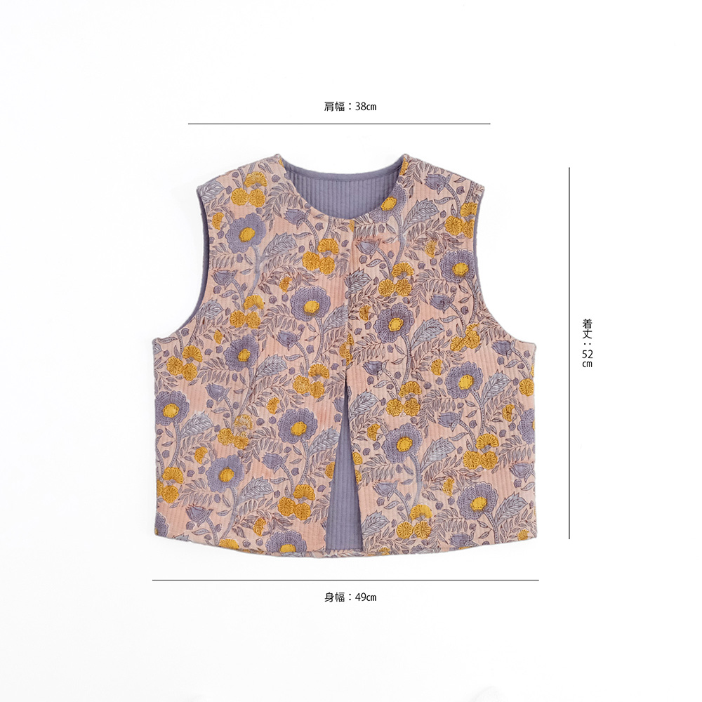 少しミニマルな薄手のキルトベストは、肌寒さが残る春先のレイヤードスタイルに取り入れたいアイテムです。おうちでのリラックスタイムから、ちょっとそこまでのお出かけまで、どんなシーンも華やかに彩る一枚です。全面に散りばめられた、華やかなポピー柄のブロックプリントが最大の魅力。いつものコーディネートにこの一着をプラスするだけで、まるで花束を纏ったかのように、顔まわりを明るく、女性らしく演出します。気分やシーンに合わせて、さまざまな着こなしを楽しんでいただけます。 ■シリーズ商品はこちら ■ルームウェアはこちら ブロックプリントとは、木彫り版でハンコを押すように1柄ずつ1色ずつプリントされたものです。まず、アウトラインとなる柄のスタンプを押していき、その後色を乗せていきます。使われている色の数だけ作業は複雑になっていきます。全て手作業の為、染ムラやスタンプの境目などが少し出ていますが、それがブロックプリントの良さでもあり、風合いとなっております。 >>ファッション