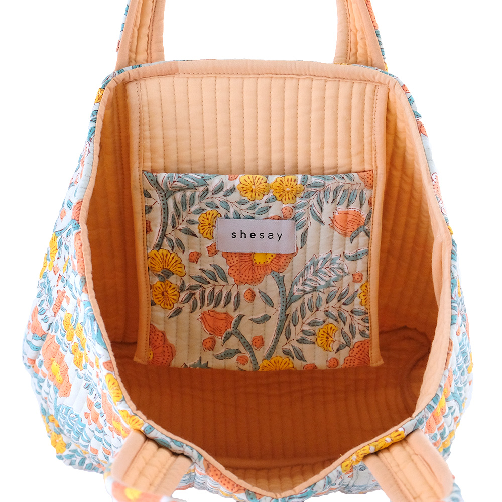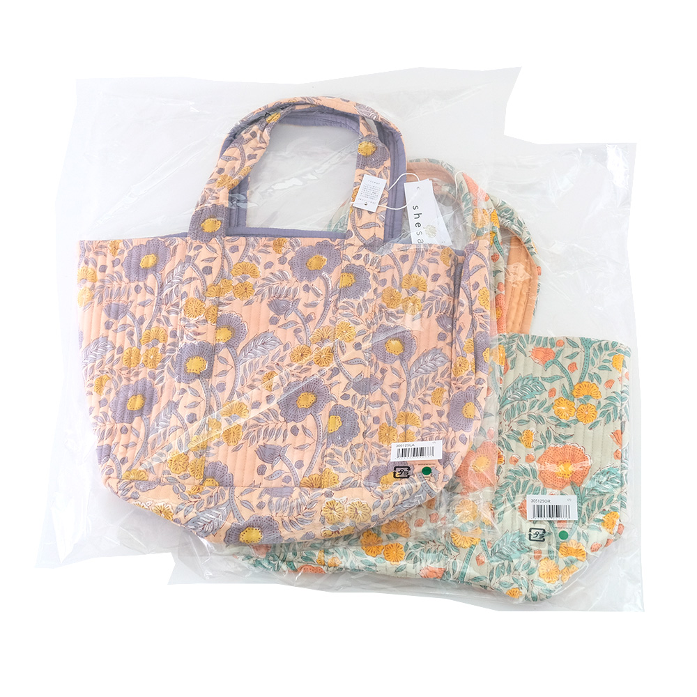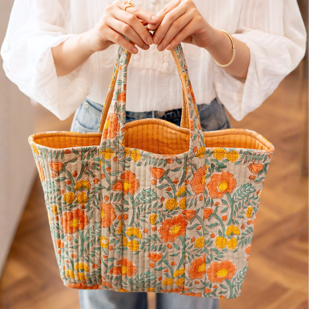 軽やかで心地よい肌触りの薄綿キルトが、毎日の装いにそっと寄り添うトートバッグ。インドの伝統的なブロックプリントで描かれた華やかなポピー柄が、持つ人の心を弾ませコーディネートに彩りを添えます。たっぷりとしたA4サイズ対応の収納力で、荷物が多い日でも安心。さらに、綿入りのふっくらとしたハンドルが肩への負担を軽減してくれるので、お出かけがもっと身軽で快適になります。 ■シリーズ商品はこちら ブロックプリントとは、木彫り版でハンコを押すように1柄ずつ1色ずつプリントされたものです。まず、アウトラインとなる柄のスタンプを押していき、その後色を乗せていきます。使われている色の数だけ作業は複雑になっていきます。全て手作業の為、染ムラやスタンプの境目などが少し出ていますが、それがブロックプリントの良さでもあり、風合いとなっております。 >>ファッション