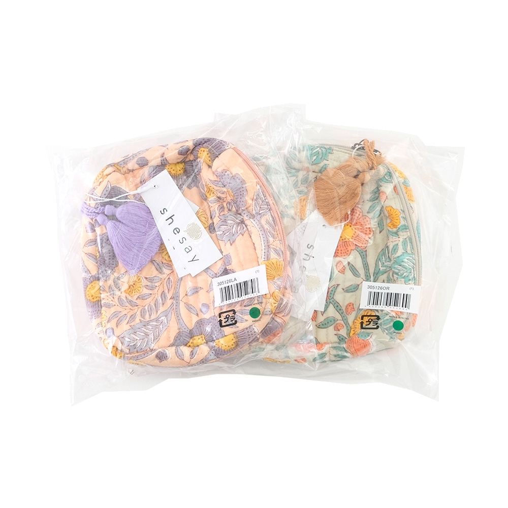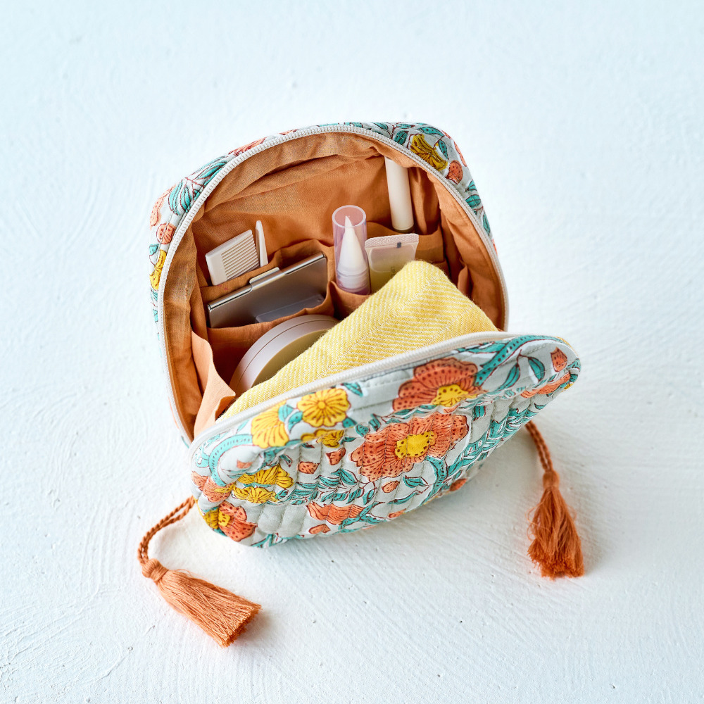 華やかなポピー柄のキルトのポーチは、大きく開くオープンファスナーが使いやすさの鍵。中身が一目瞭然なので、探しているコスメや小物がすぐに取り出せます。内側にはたくさんのポケットと仕切りを完備。細かなコスメからブラシまで、アイテムごとに整理整頓できるので、バッグの中はいつもすっきり。取り出すたびに気分が上がる可愛らしさと機能性を兼ねそろえたアイテムです。 ■シリーズ商品はこちら ■キルティングポーチはこちら ブロックプリントとは、木彫り版でハンコを押すように1柄ずつ1色ずつプリントされたものです。まず、アウトラインとなる柄のスタンプを押していき、その後色を乗せていきます。使われている色の数だけ作業は複雑になっていきます。全て手作業の為、染ムラやスタンプの境目などが少し出ていますが、それがブロックプリントの良さでもあり、風合いとなっております。 >>ファッション