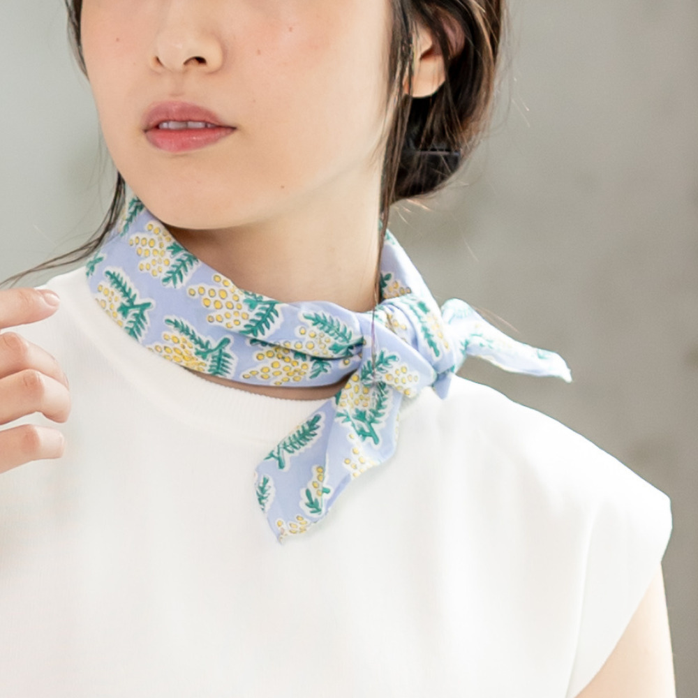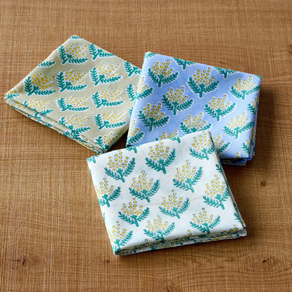 3月8日は女性の社会参画を願う日である「国際女性デー」イタリアでは「ミモザの日」とも呼ばれています。夫から妻へ、子供からお母さんへだけでなく、更には女性同士でもミモザを贈り合うのだそう。国ごとに異なるミモザの花言葉。イタリアでは「感謝」、日本は「優雅」「友情」、フランスでは「感受性」「思いやり」などがあります。そんなミモザ柄のハンカチ、自分用にはもちろん、日頃の感謝を伝えるちょっとしたプレゼントにもおすすめです。 ブロックプリントとは、木彫り版でハンコを押すように1柄ずつ1色ずつプリントされたものです。まず、アウトラインとなる柄のスタンプを押していき、その後色を乗せていきます。使われている色の数だけ作業は複雑になっていきます。全て手作業の為、染ムラやスタンプの境目などが少し出ていますが、それがブロックプリントの良さでもあり、風合いとなっております。 >>ファッション雑貨