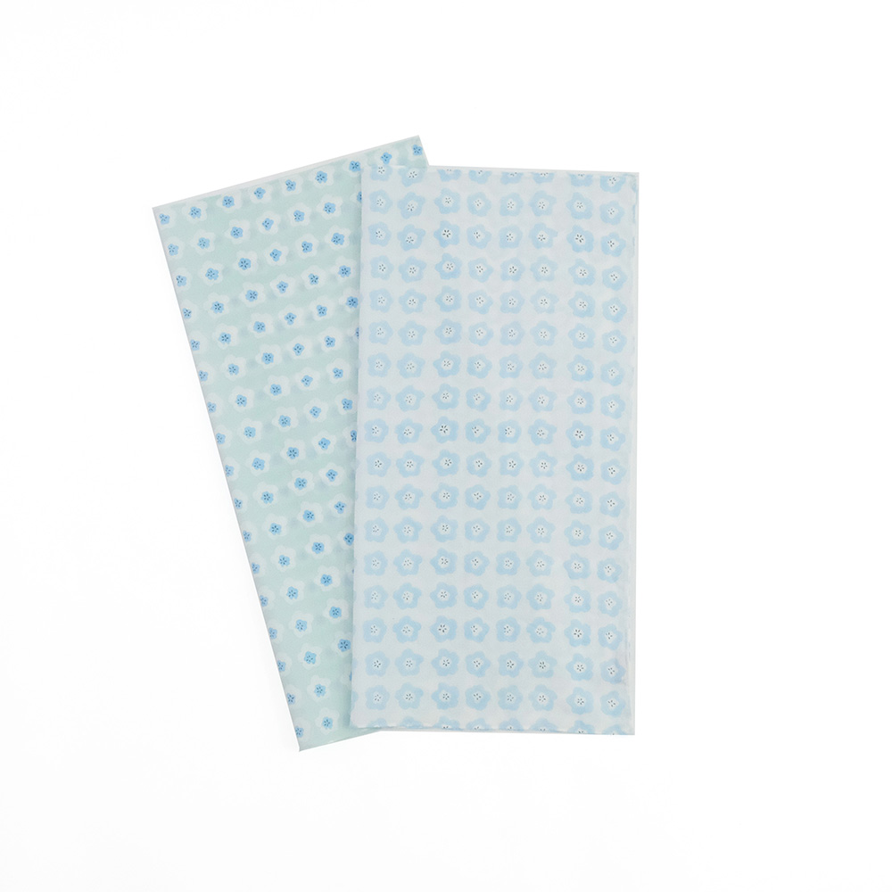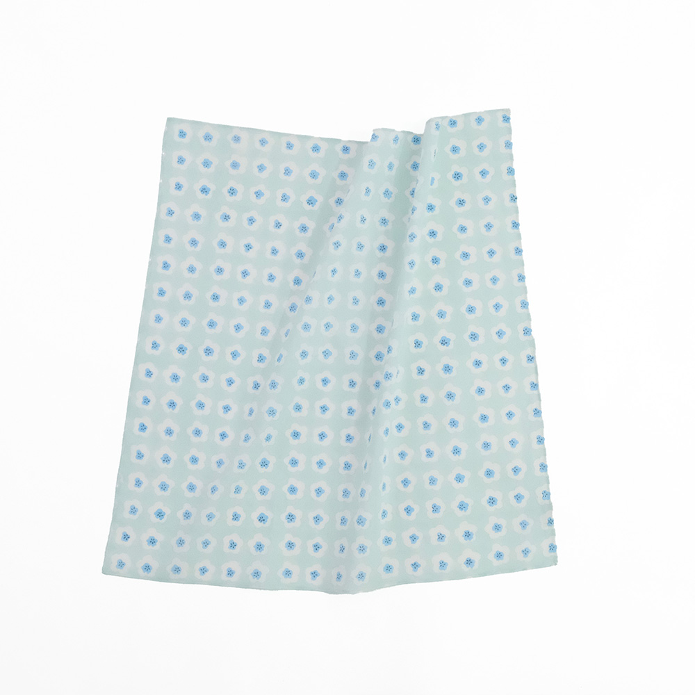 4月中旬?5月上旬頃が見ごろの季節のネモフィラの丘をイメージしたハンカチです。小さな花々が風に揺れる穏やかな光景を、インドの伝統技法「ブロックプリント」で表現しました。職人がひとつひとつ木版を押して描く模様は、わずかな揺らぎや色の重なりが魅力。機械印刷にはない温かみが、ネモフィラの可憐さと自然の豊かさを感じさせてくれます。青く澄んだ花色から、「純粋さ」や「優しさ」をイメージさせる花言葉が多い花で、ギフトにもおすすめの柄です。手に取るたびに、心に広がる青空と花畑の風景をお楽しみください。 ブロックプリントとは、木彫り版でハンコを押すように1柄ずつ1色ずつプリントされたものです。まず、アウトラインとなる柄のスタンプを押していき、その後色を乗せていきます。使われている色の数だけ作業は複雑になっていきます。全て手作業の為、染ムラやスタンプの境目などが少し出ていますが、それがブロックプリントの良さでもあり、風合いとなっております。