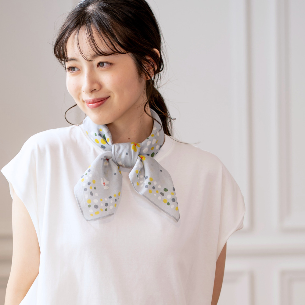 シックな色合いに、まるで小鳥が羽ばたくかのような可憐な花モチーフと、人気のランダムドットを組み合わせた大人のためのスカーフ。シンプルな装いにプラスするだけで、ぐっと華やかな印象になります。首元に巻いてアクセントにするのはもちろん、日よけや冷え対策にも。カジュアルにもきれいめにも合わせやすいデザインで、いつもの着こなしをクラスアップしてくれるアイテムです。 綿は肌触りが柔らかく、吸水性が高く、通気性があります。また、絹は肌に優しく、滑らかで軽い質感があります。これら綿と絹を混紡した素材は、着心地が快適で高級感のある質感があります。 >>ファッション雑貨