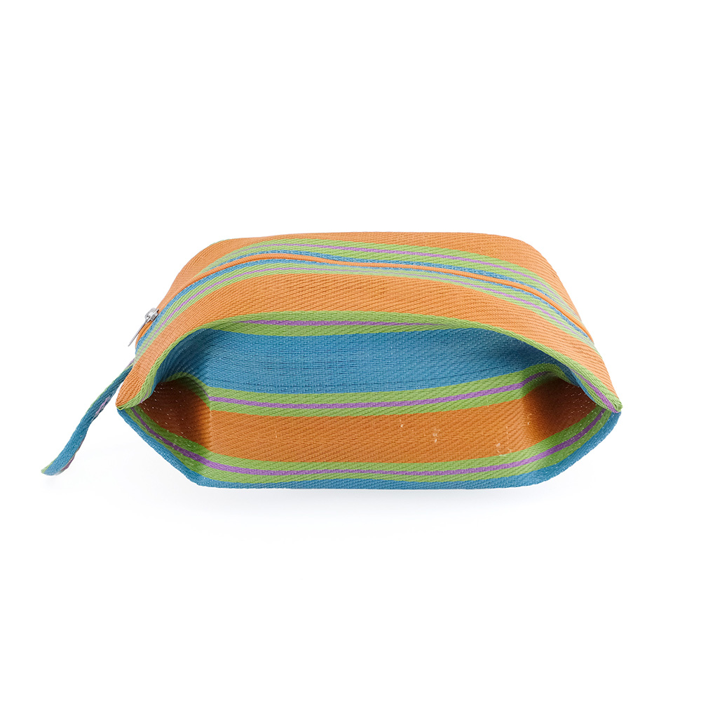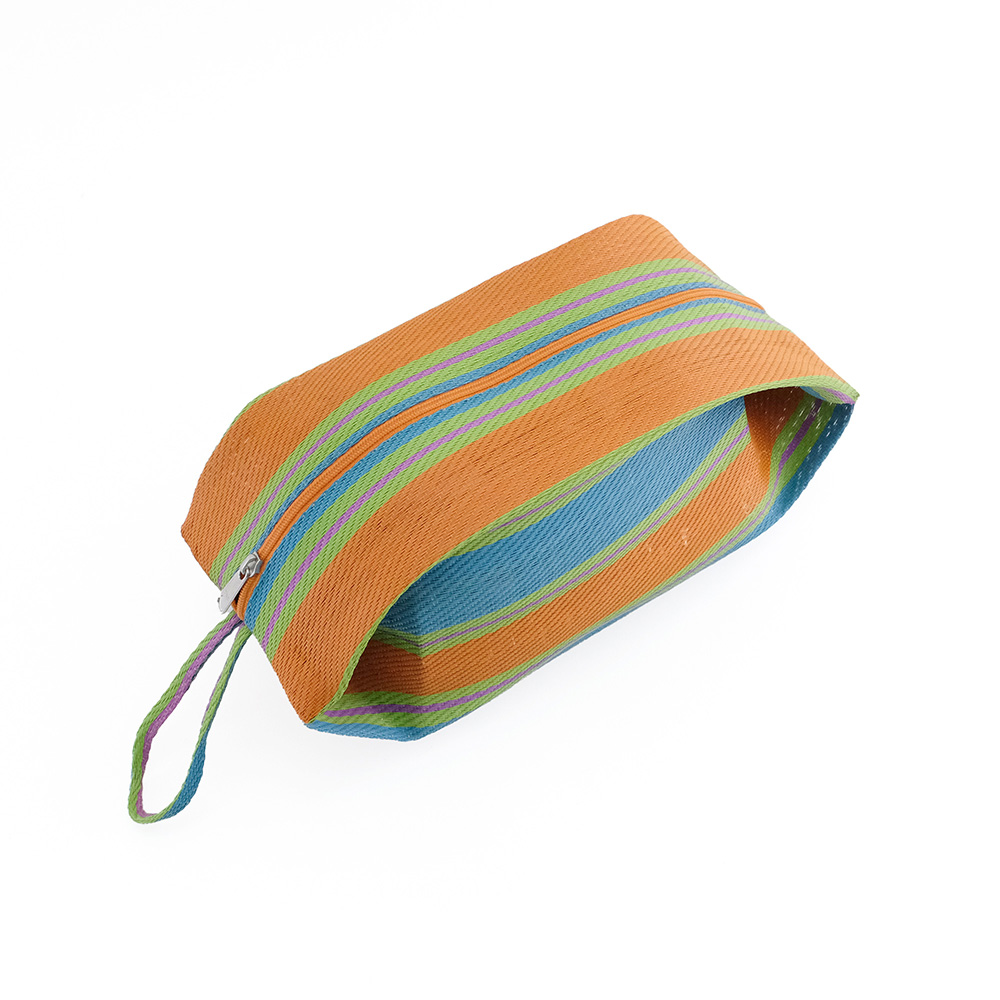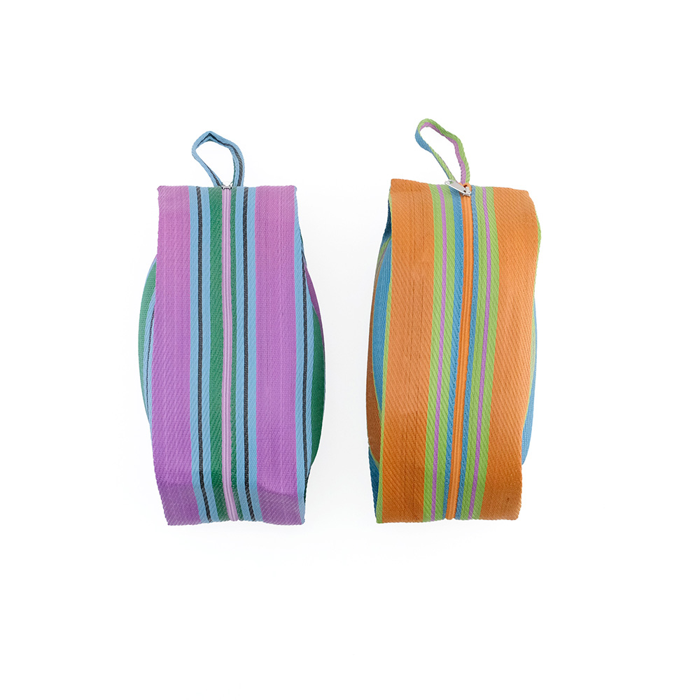 廃棄されたペットボトルやポリ袋を再利用して作られた、リサイクル素材を使用したストライプ柄のポーチ。インドでは市場や日常の運搬に使われるほど丈夫で、重い荷物にも安心して使える耐久性があります。レジャーや旅行、アウトドアなど荷物が増えるシーンで、細々とした小物をすっきりまとめられる便利なサイズ感。カラフルなストライプ柄がバッグの中でも目を引き、探しやすく取り出しやすいのも魅力です。同じ生地で仕立てたバッグとお揃いで使えば、統一感のあるコーディネートが楽しめます。 廃棄されたペットボトルやポリ袋を再利用して作られた、リサイクル素材を使用しています。石油由来のプラスチックの消費量を抑え、限りある資源を大切にする、環境に優しい製品です。