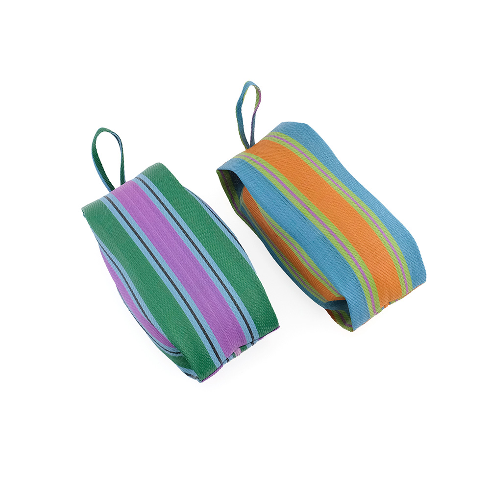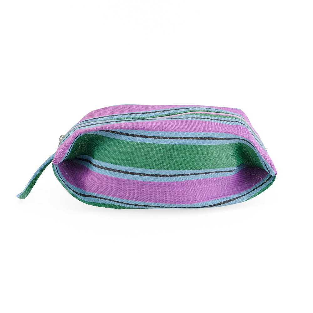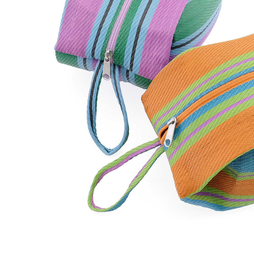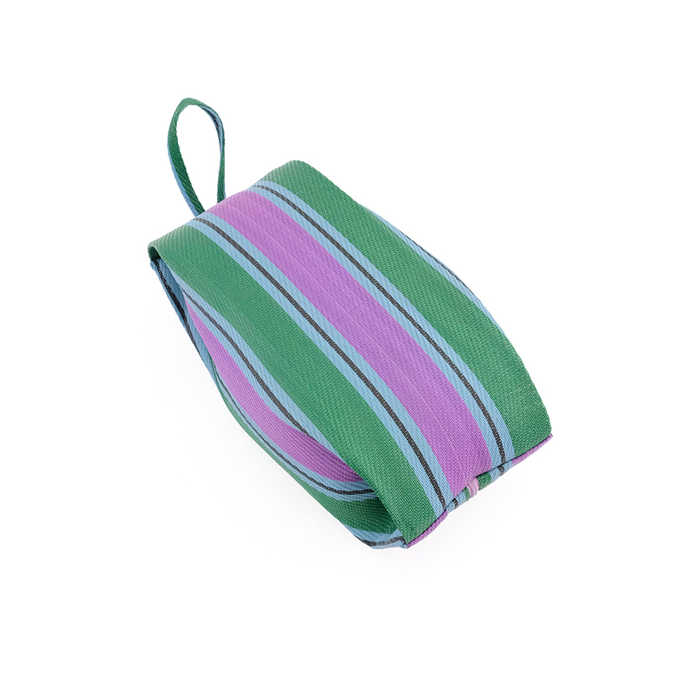 廃棄されたペットボトルやポリ袋を再利用して作られた、リサイクル素材を使用したストライプ柄のポーチ。インドでは市場や日常の運搬に使われるほど丈夫で、重い荷物にも安心して使える耐久性があります。レジャーや旅行、アウトドアなど荷物が増えるシーンで、細々とした小物をすっきりまとめられる便利なサイズ感。カラフルなストライプ柄がバッグの中でも目を引き、探しやすく取り出しやすいのも魅力です。同じ生地で仕立てたバッグとお揃いで使えば、統一感のあるコーディネートが楽しめます。 廃棄されたペットボトルやポリ袋を再利用して作られた、リサイクル素材を使用しています。石油由来のプラスチックの消費量を抑え、限りある資源を大切にする、環境に優しい製品です。