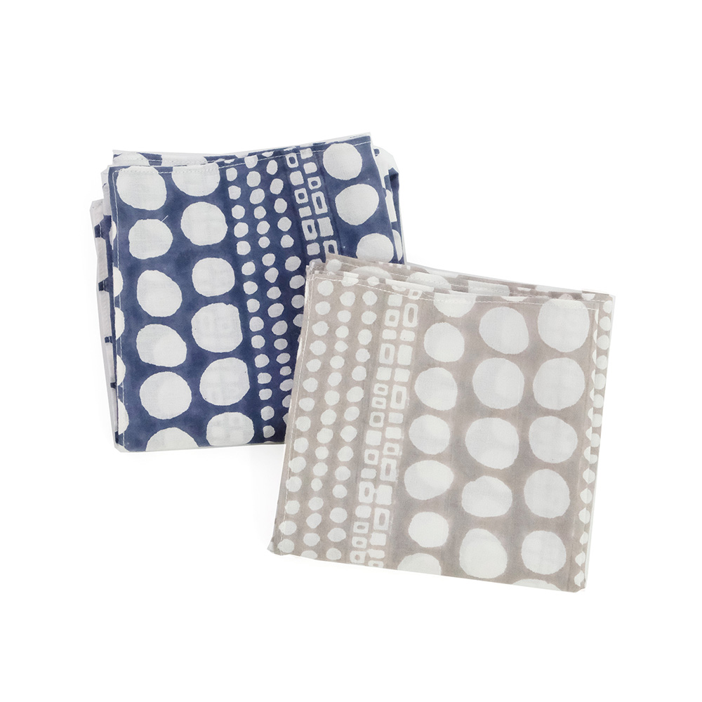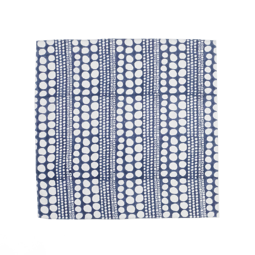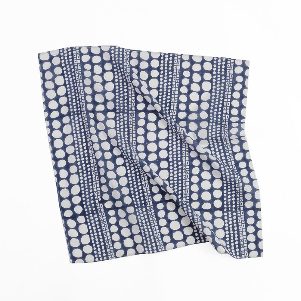 人気のドット柄と、四角のような幾何学モチーフを組み合わせた、カジュアルでありながら落ち着いた印象に仕上げたブロックプリントのハンカチ。ひとつひとつ職人の手で版を押して仕上げられた模様は、手仕事ならではの温かみを感じさせます。落ち着いた色合いでユニセックスに使いやすく、普段使いのハンカチとしてはもちろん、お弁当包みやちょっとしたギフトにもぴったり。落ち着いたトーンの配色はユニセックスでお使いいただける、日常にそっと寄り添う一枚です。 ブロックプリントとは、木彫り版でハンコを押すように1柄ずつ1色ずつプリントされたものです。まず、アウトラインとなる柄のスタンプを押していき、その後色を乗せていきます。使われている色の数だけ作業は複雑になっていきます。全て手作業の為、染ムラやスタンプの境目などが少し出ていますが、それがブロックプリントの良さでもあり、風合いとなっております。
