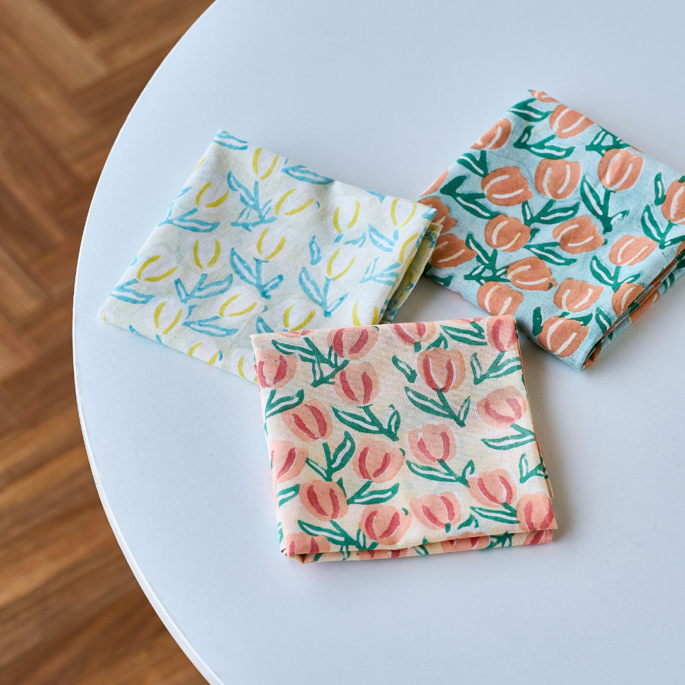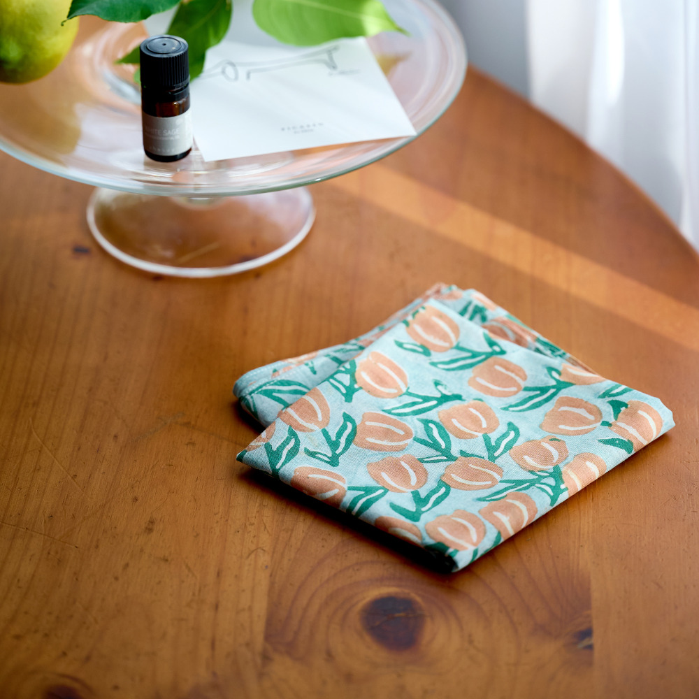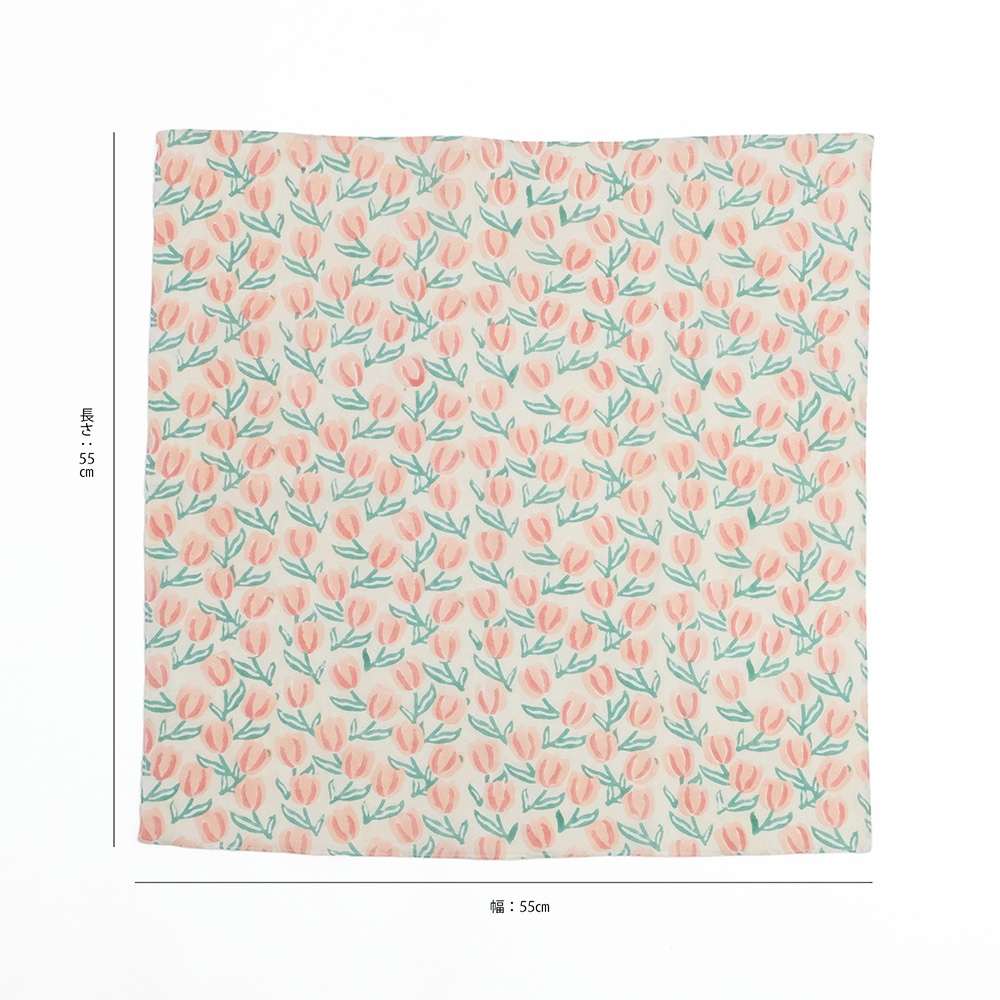 可愛らしいチューリップが一面いっぱいに広がるお花畑をモチーフにしたブロックプリントのハンカチ。大きく咲いた花が風に揺られてこれから始まる季節のわくわく感を演出してくれます。普段使いのハンカチとしてはもちろん、お弁当包みにしてピクニックで広げたり、贈り物としてもぴったり。 ブロックプリントとは、木彫り版でハンコを押すように1柄ずつ1色ずつプリントされたものです。まず、アウトラインとなる柄のスタンプを押していき、その後色を乗せていきます。使われている色の数だけ作業は複雑になっていきます。全て手作業の為、染ムラやスタンプの境目などが少し出ていますが、それがブロックプリントの良さでもあり、風合いとなっております。 >>ファッション雑貨