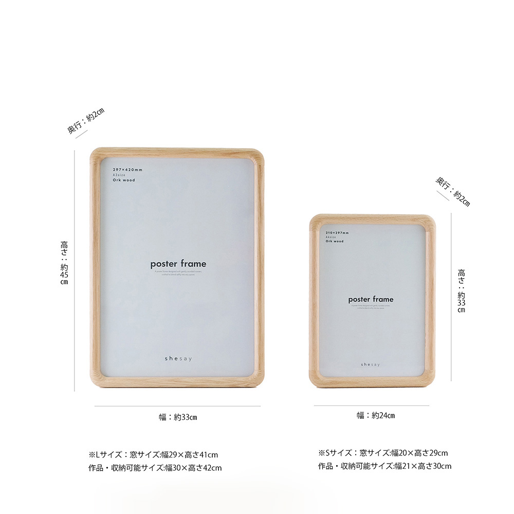 (窓サイズ:幅29×高さ41cm・作品・収納可能サイズ:幅30×高さ42m) S:約 幅24×奥行2×高さ33cm(窓サイズ:幅20×高さ29cm・作品・収納可能サイズ:幅21×高さ30cm) |