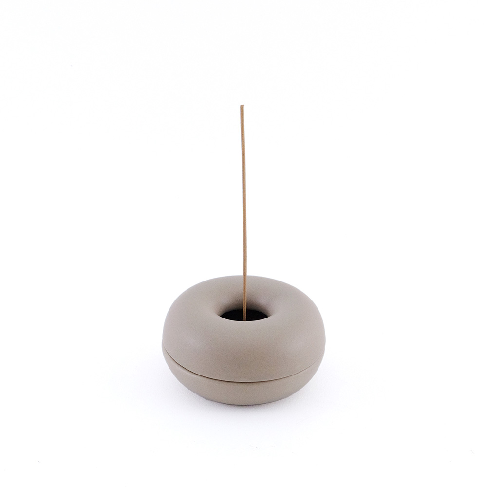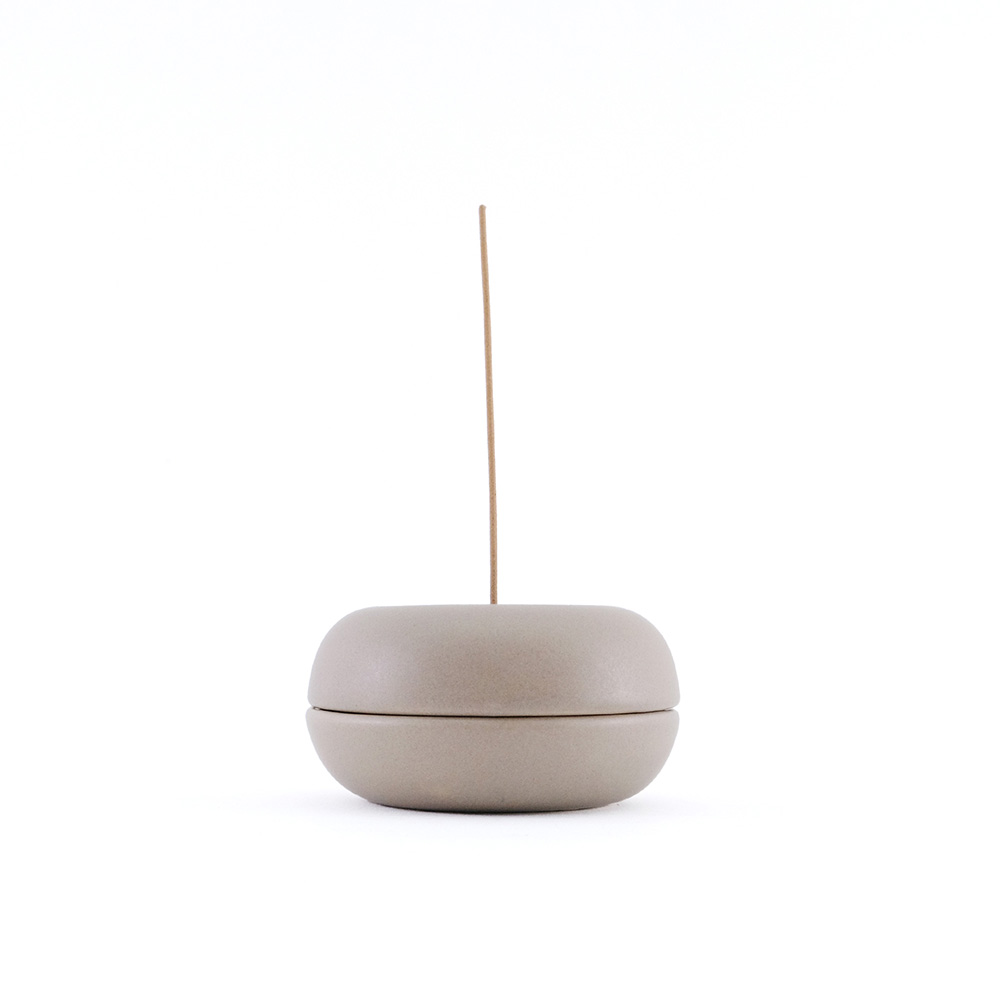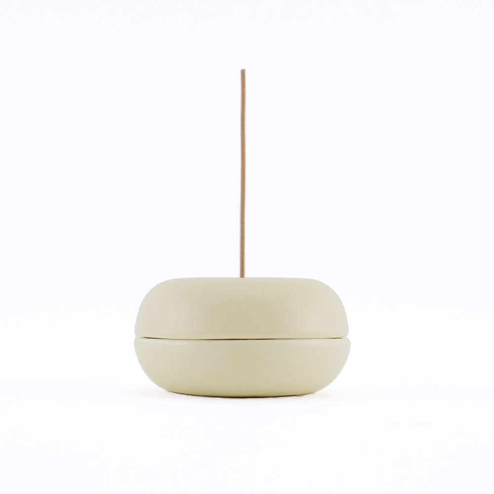 まるでベーグルの様なまるまるとしたフォルムが個性的なお香立て。落ちた灰が内側にたまる構造のため、外から見えにくく、まとめて捨てられるのでお手入れも簡単です。お香のある生活を、より気軽に楽しんでいただけます。蓋を外してすっきりとした見た目でも使えるので、気分で使い分けてお楽しみください。 半磁器(ストーンウェア)とは、素焼きのようなマットで素朴なテクスチャが特徴で、陶器の柔らかくあたたかみのある印象はそのままに、磁器よりも耐久性が高く、割れにくい素材です。