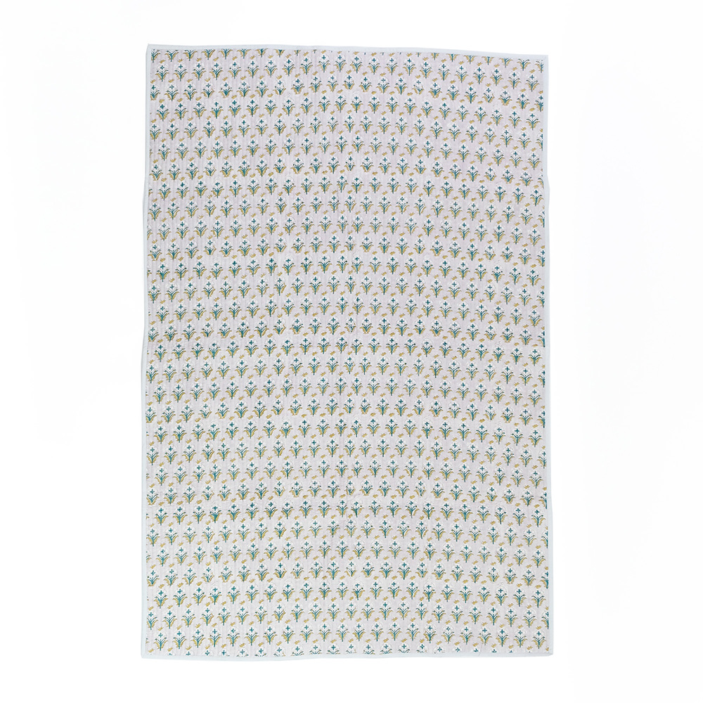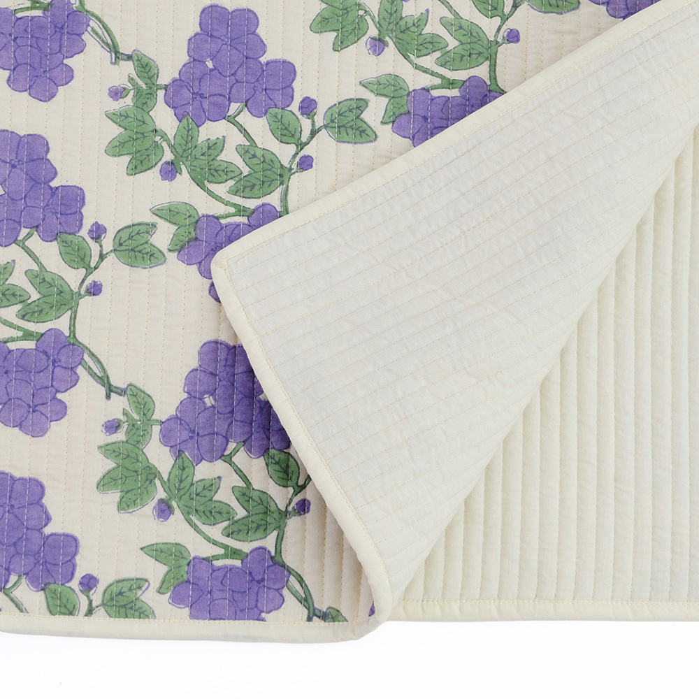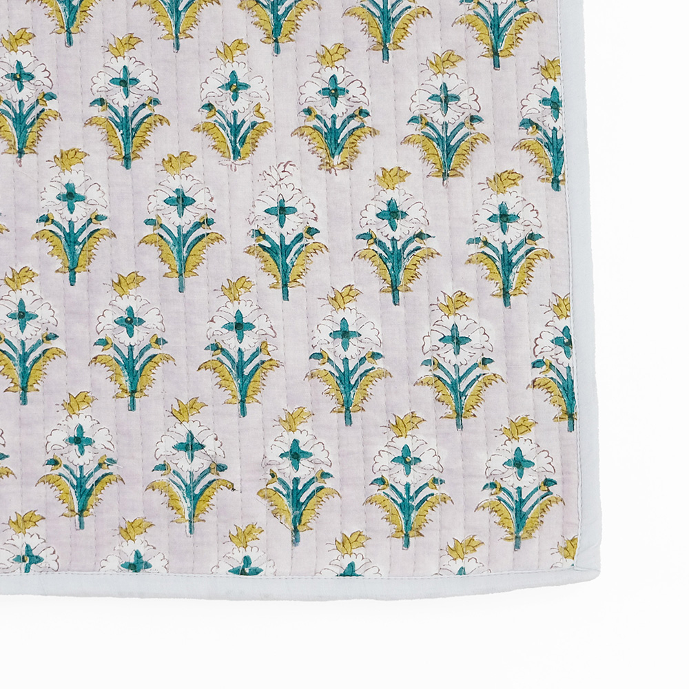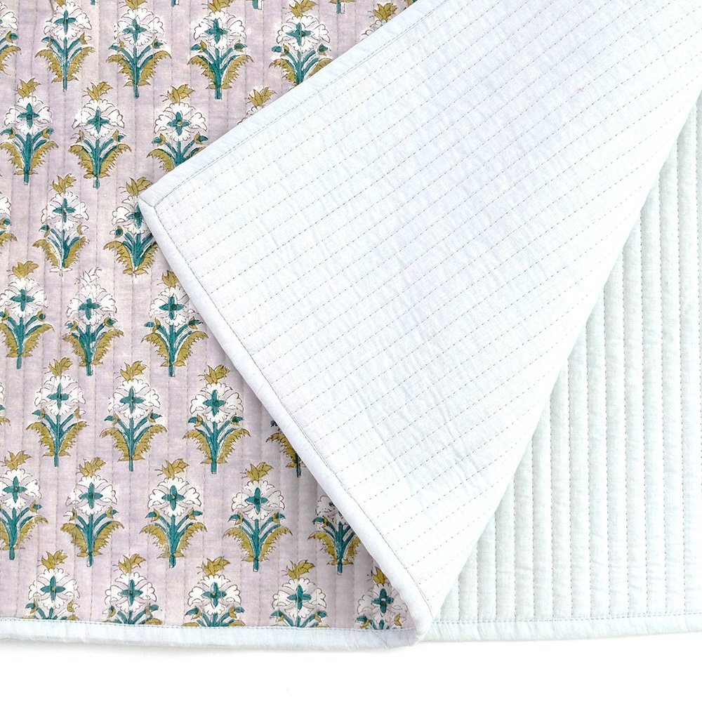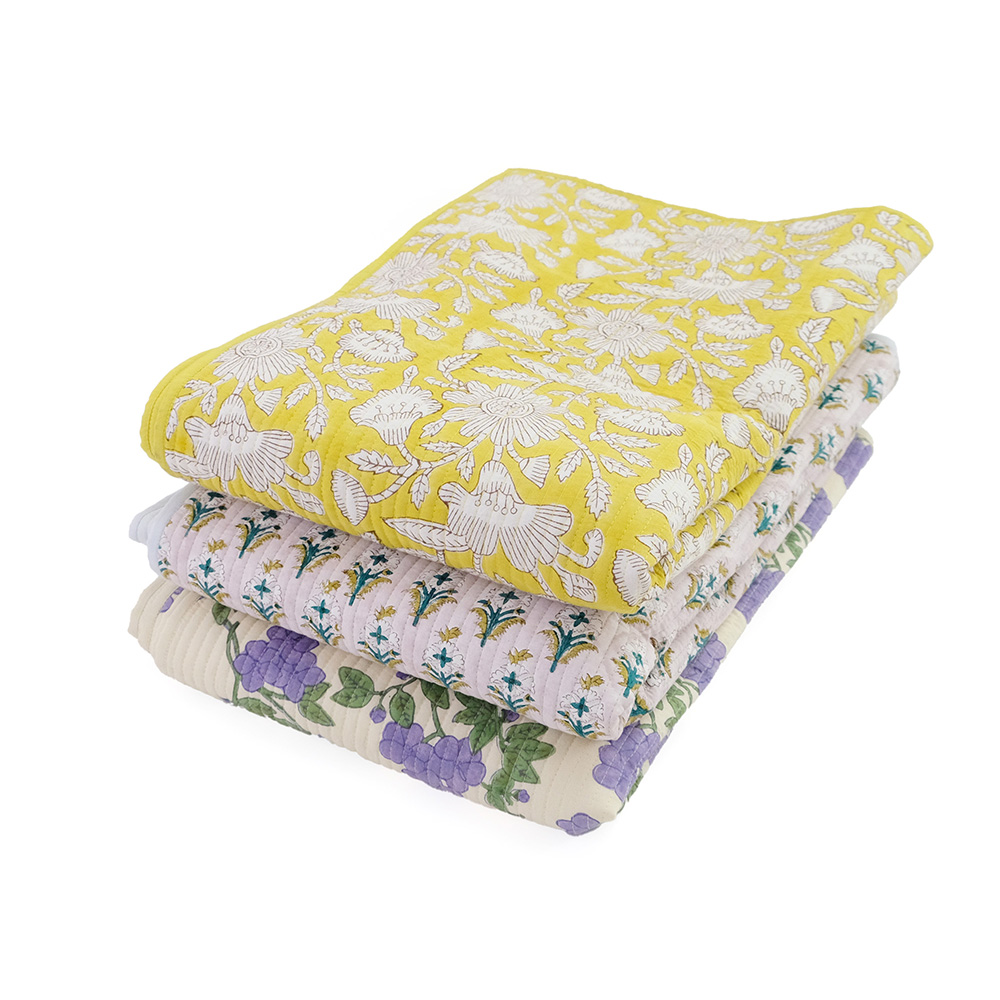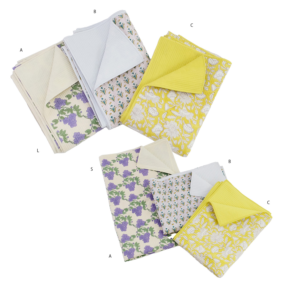 職人の手でひとつひとつ丁寧に施されたブロックプリントに、立体感のあるキルトステッチが心地よいキルトマットは、薄手なので夏の肌掛け代わりに使ったり、ソファやベッドのマルチカバーとしてもおススメです。リビングに安らぎと彩りを添える贅沢なアイテムです。 ブロックプリントとは、木彫り版でハンコを押すように1柄ずつ1色ずつプリントされたものです。まず、アウトラインとなる柄のスタンプを押していき、その後色を乗せていきます。使われている色の数だけ作業は複雑になっていきます。全て手作業の為、染ムラやスタンプの境目などが少し出ていますが、それがブロックプリントの良さでもあり、風合いとなっております。