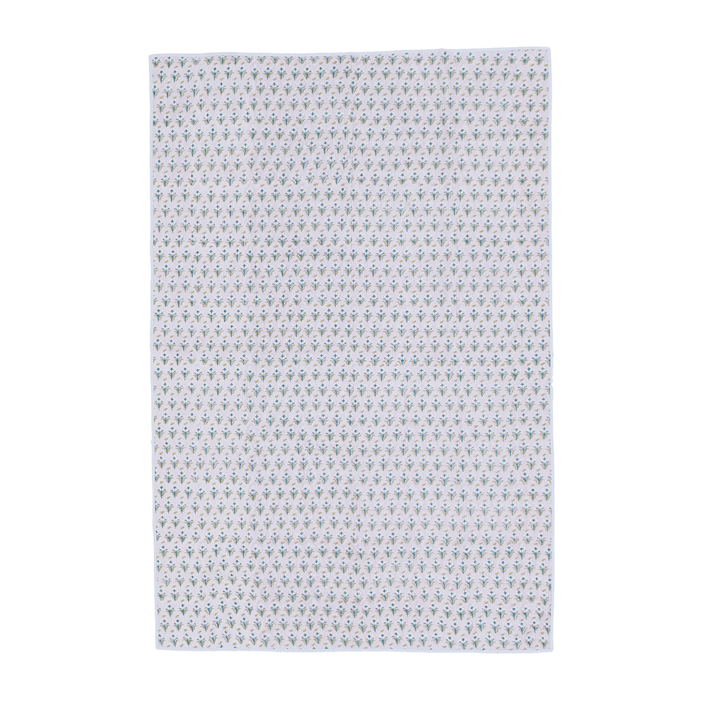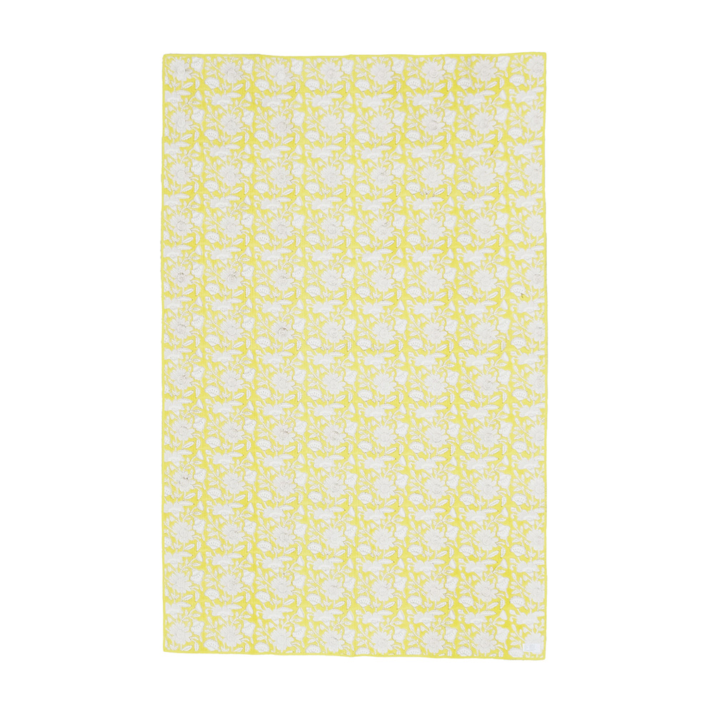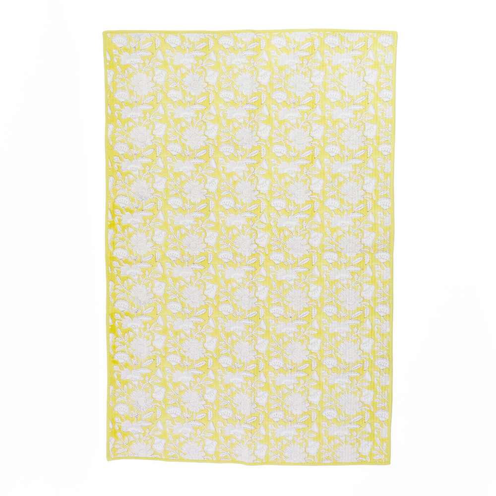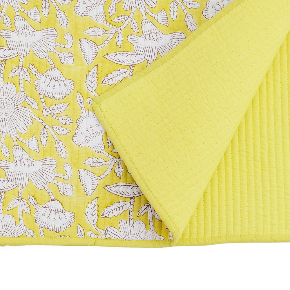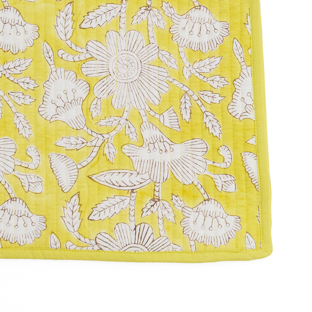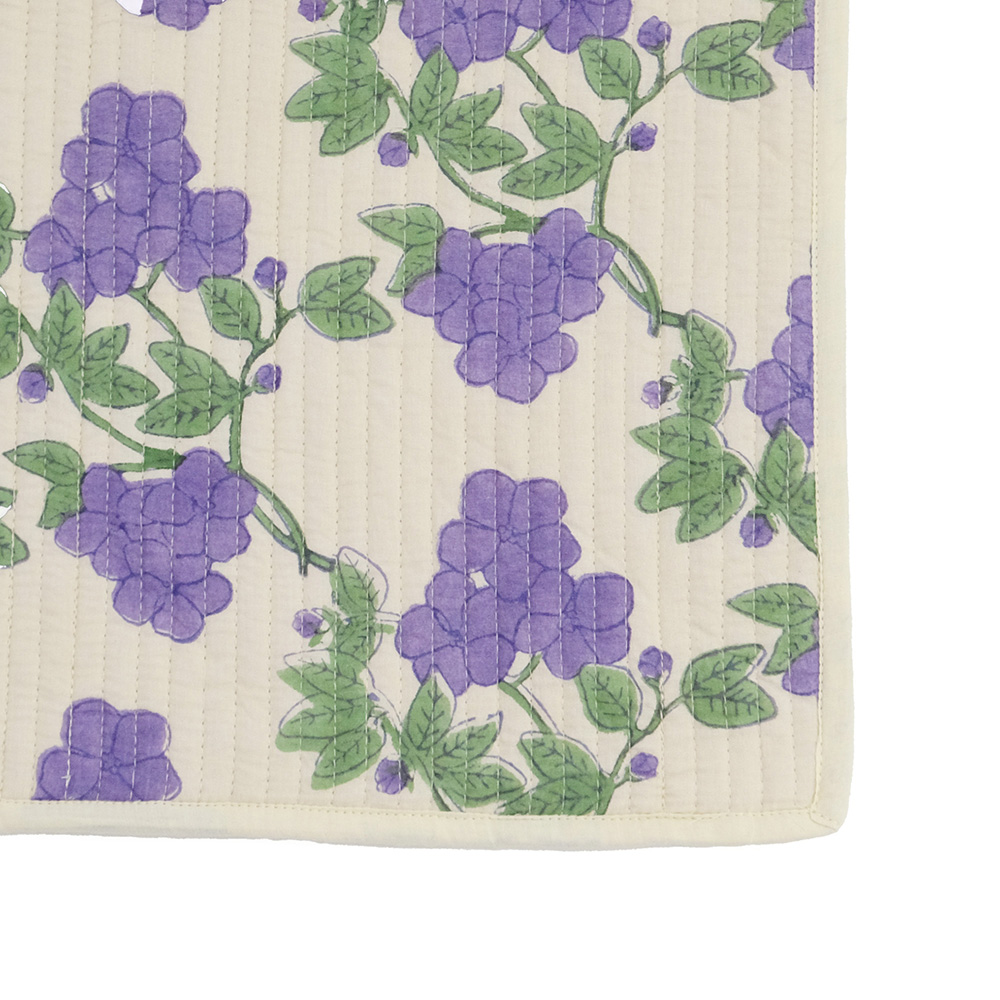職人の手でひとつひとつ丁寧に施されたブロックプリントに、立体感のあるキルトステッチが心地よいキルトマットは、薄手なので夏の肌掛け代わりに使ったり、ソファやベッドのマルチカバーとしてもおススメです。リビングに安らぎと彩りを添える贅沢なアイテムです。 ブロックプリントとは、木彫り版でハンコを押すように1柄ずつ1色ずつプリントされたものです。まず、アウトラインとなる柄のスタンプを押していき、その後色を乗せていきます。使われている色の数だけ作業は複雑になっていきます。全て手作業の為、染ムラやスタンプの境目などが少し出ていますが、それがブロックプリントの良さでもあり、風合いとなっております。