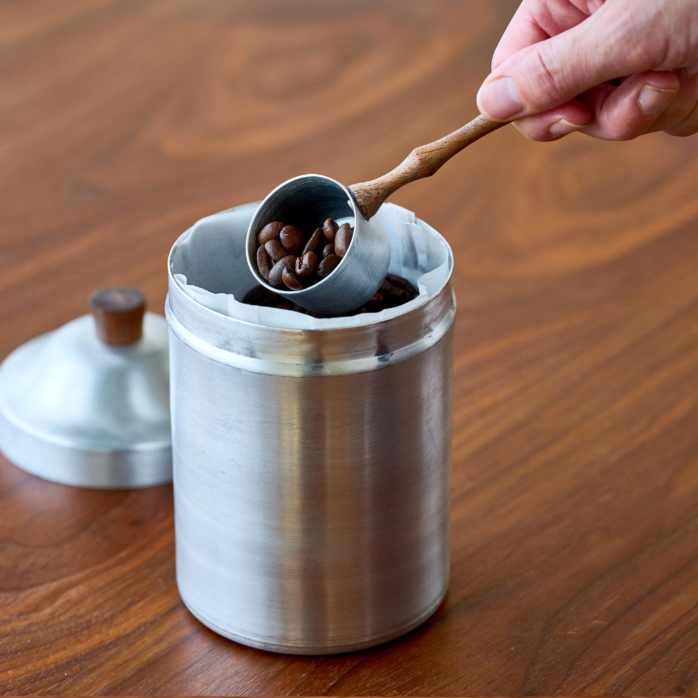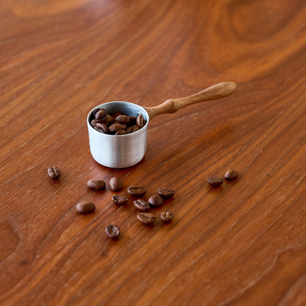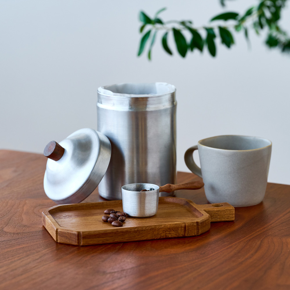 アルミと木の組み合わせで作られた計量スプーンです。豆の状態で10g、挽いた粉の状態で11g計測でき、毎日のコーヒータイムに最適なサイズ設計になっています。持ち手には木製カトラリーと同じデザインをあしらい、アルミキャニスターと合わせて、統一感のあるコーディネートでお使いいただけます。ナチュラルで温かみのあるウッドと、シンプルで丈夫なアルミの組み合わせは、使うたびに手に馴染み、長く愛用できるデザインです。コーヒーの計量だけでなく、シリーズアイテムとのセットでギフトにもおすすめのアイテムです。 ■カトラリー関連はこちら ■アカシアウッドのアイテムはこちら ■アルミのアイテムはこちら アルミニウム(アルミ)は、軽くて丈夫で熱や電気を伝えやすい、製品の加工がしやすく、使い終わった後のリサイクルも容易で優れた特徴を多く持つ金属です。その丈夫な素材から自動車やパソコンなどの部品、航空機の機体などにも使われています。 >>食器・キッチン