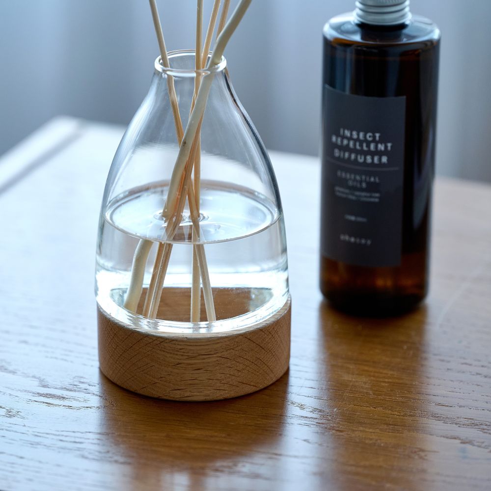 香りで空間を快適にするディフューザーと、美しいフラワーベースのセットです。セットには、ディフューザー本体、ディフューザーを飾れるフラワーベース、ラタンとウィローのリードが含まれています。使用しているエッセンシャルオイルは天然植物由来。古くから虫よけとして活用されてきた忌避作用を持つ香りを中心に、すっきりとした心地よい香りにブレンドしました。天然成分なので、安心して室内でお使いいただけます。フラワーベースはリューズガラスとウッドの組み合わせで、ガラス部分と土台のウッドは簡単に取り外し可能。水替えやお手入れも手軽です。ウッドベースには美しい木目が特徴のオーク材を使用しており、ナチュラルで上品な雰囲気がインテリアと自然に調和します。香りで虫を寄せ付けにくくしながら、優しい香りに包まれた心地よい空間づくりをお楽しみいただけるアイテムです。 ■ディフューザー一覧はこちら ■「虫除け」アイテムのシリーズはこちら ■エッセンシャルオイルはこちら >>生活雑貨・日用品