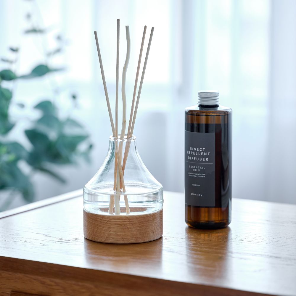 香りで空間を快適にするディフューザーと、美しいフラワーベースのセットです。セットには、ディフューザー本体、ディフューザーを飾れるフラワーベース、ラタンとウィローのリードが含まれています。使用しているエッセンシャルオイルは天然植物由来。古くから虫よけとして活用されてきた忌避作用を持つ香りを中心に、すっきりとした心地よい香りにブレンドしました。天然成分なので、安心して室内でお使いいただけます。フラワーベースはリューズガラスとウッドの組み合わせで、ガラス部分と土台のウッドは簡単に取り外し可能。水替えやお手入れも手軽です。ウッドベースには美しい木目が特徴のオーク材を使用しており、ナチュラルで上品な雰囲気がインテリアと自然に調和します。香りで虫を寄せ付けにくくしながら、優しい香りに包まれた心地よい空間づくりをお楽しみいただけるアイテムです。 ■ディフューザー一覧はこちら ■「虫除け」アイテムのシリーズはこちら ■エッセンシャルオイルはこちら >>生活雑貨・日用品