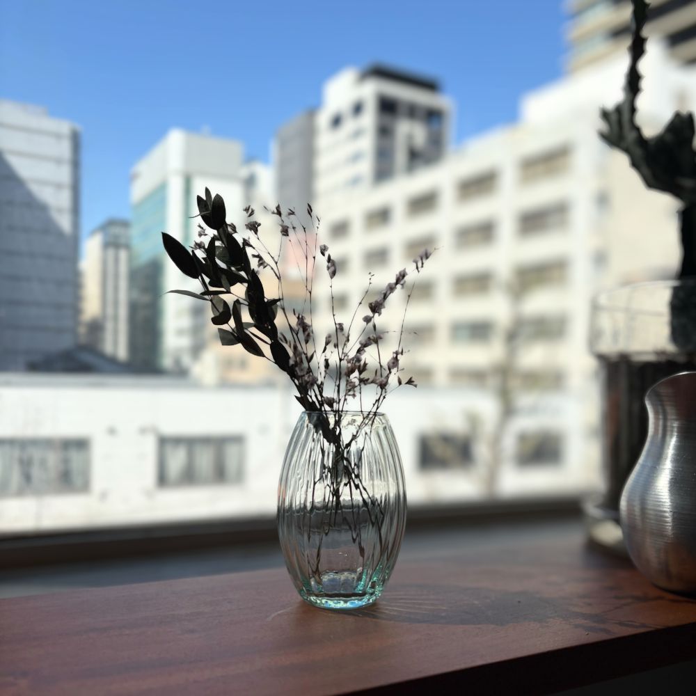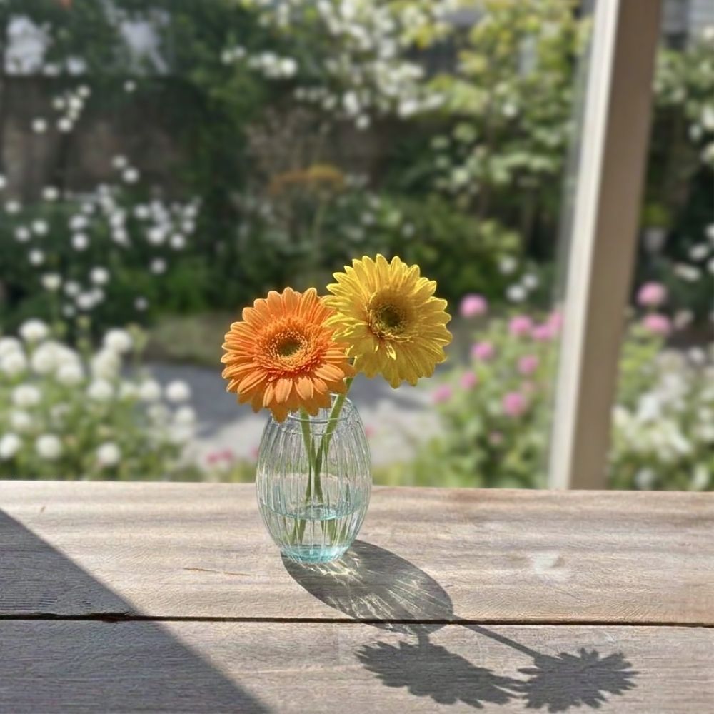 フランス語で名づけたシトロン(レモン)という名前の通り、コロンとした木の実のような形が愛らしいフラワーベース。小ぶりサイズで、カウンターや窓辺にそっと彩りを添えてくれます。 ▼旧品番(ベトナム産)は完売しました リューズガラスとは、再利用されたガラスのことをいいます。一般的には「リサイクルガラス」や「再生ガラス」とも呼ばれ、一度は捨てられたり不要になったガラスをリサイクルして使っています。そのためリューズガラスは、環境にやさしいサスティナブル( Sustainable =持続可能)な社会への取り組みとしても注目されています。リューズガラス製品は、ひとつひとつが職人たちの手によるハンドメイド。炉(ろ)で溶かしたガラスを竿(さお)ですくい取り、型の中で息を吹き込みながら作る「型吹き成形」という技法で作られていますので、たとえ同じ型のシリーズであっても、全く同じ仕上がりになるということはありません。ハンドメイドならではの、ガラス表面に生まれるわずかな“しわ”や小さな気泡、繊細な表情の違いなどをお楽しみいただけると思います。さらにリューズガラスの風合いは、無機質な印象になりがちなガラス製品に独特のあたたかみや素朴さをもたらしてくれます。吹きガラスならではの、やや薄くて軽い作りも魅力のひとつです。ガラスの流れや小さな気泡、口の部分に盛り上がった箇所などがあったりしますが、これは吹き竿からガラスをカットした後、熱処理した時にガラスが流れて出来るもので、これもまた吹きガラスの特徴です。 *リューズガラスは再生ガラスを使用した当社商標登録商品です。 >>インテリアグリーン・ガーデン
