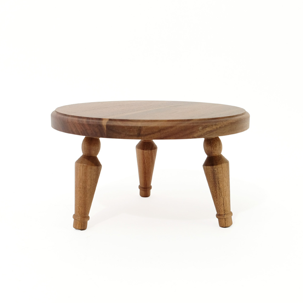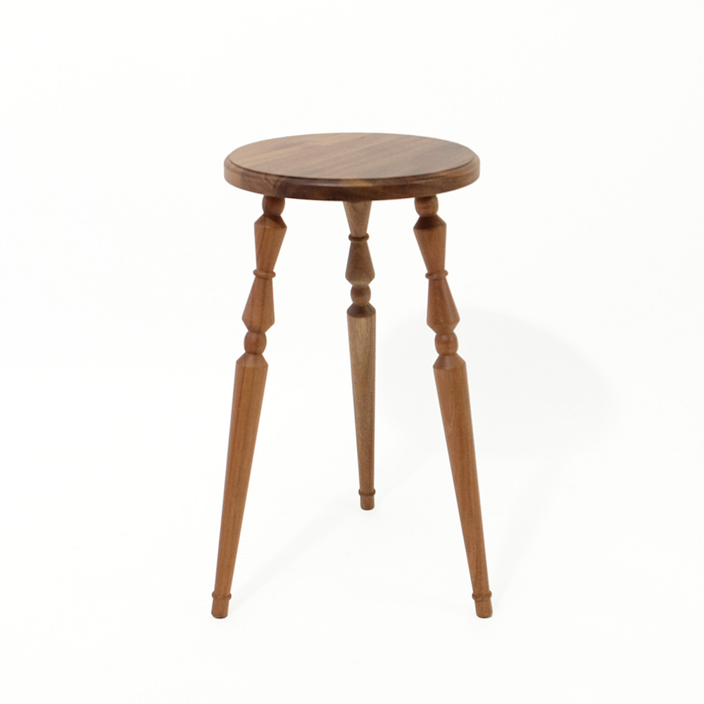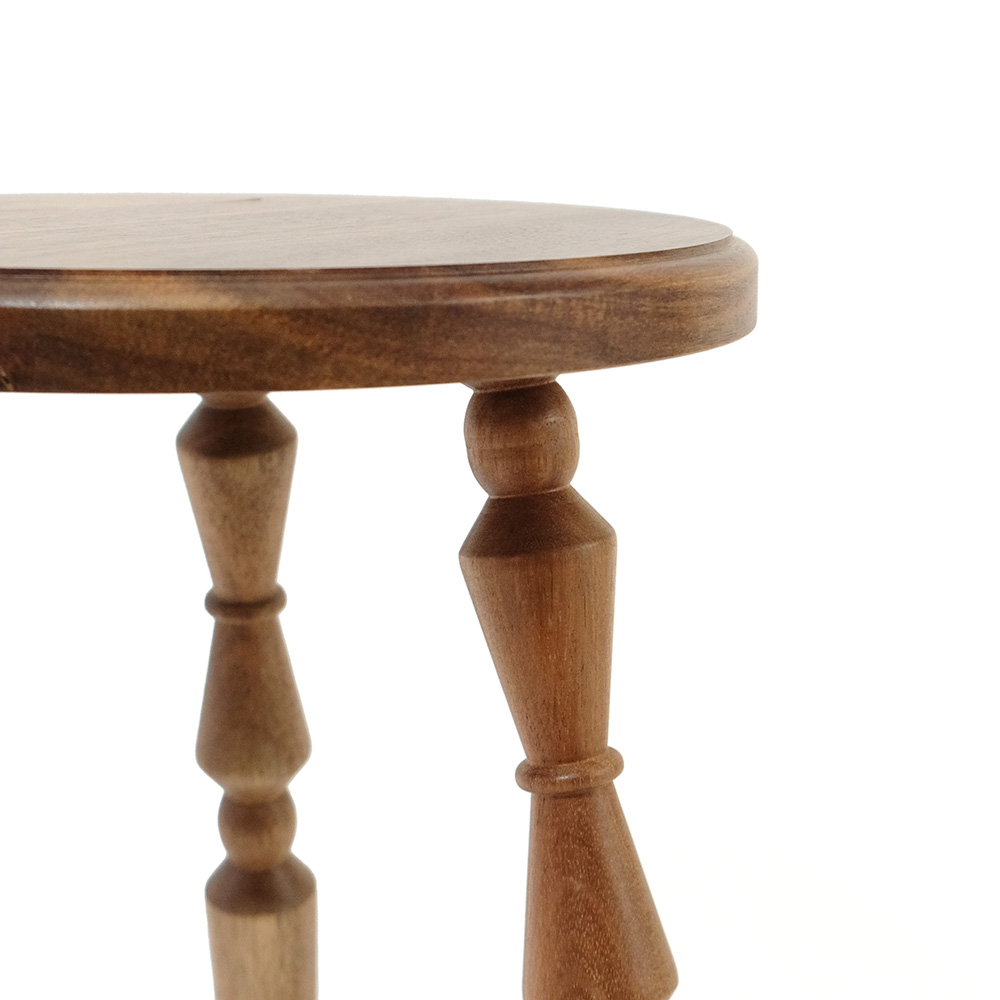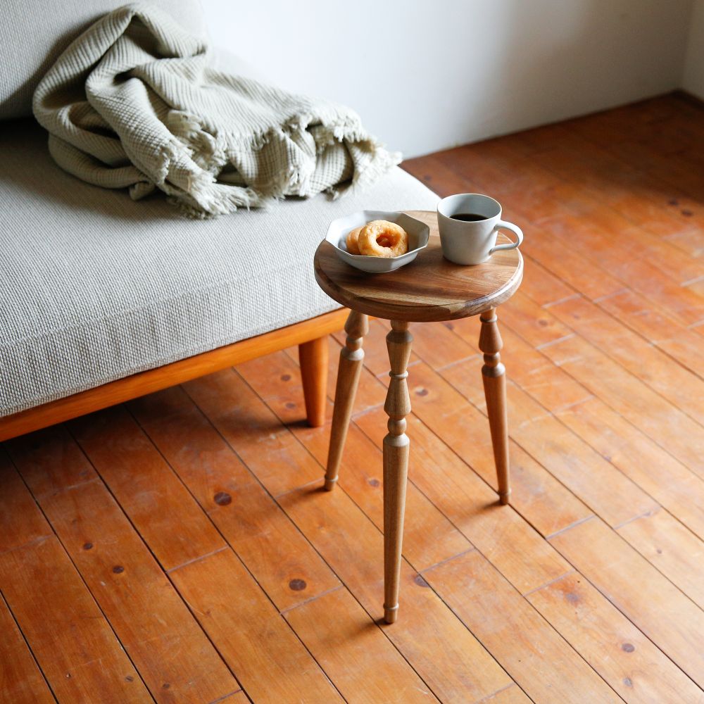 暮らしの中に、軽やかに取り入れられるミニテーブル。コンパクトに収納できる組み立て式で、使わないときは壁際などの隙間に差し込んで収納できます。 天板にはさりげないラインを施し、脚部は無垢材を旋盤で丁寧に削り出した立体的な装飾に。アンティーク家具のようなやわらかな表情を持たせながらも、今の住まいになじむバランスを大切にしました。組み立て式でありながら、簡易的に見えない佇まいを意識しています。 サイドテーブルとしてお使いして頂きやすい、ソファ横にちょうどよい高さに設計。小ぶりなサイズ感なので、玄関やお部屋のコーナーで花台としても楽しめます。 組み立ては脚をねじ込むだけのシンプルな仕様。工具を使わず、どなたでも簡単に取り付け・取り外しが可能です。床用フェルトも付属し、安心してお使いいただけます。 洗練された佇まいと装飾が空間に表情を添える、使い勝手と美しさを兼ね備えた一台です。 ACACIA WOODは中心部が濃い茶色で周辺部は白色と、濃淡の差がはっきりとしています。これらを木材そのものの特徴として捉え、原材料を無駄なく使い、限りある資源を大切にしたいと考えています。また、手作りのため商品のサイズや形状にも多少の誤差があります。素材そのものが持つ個体差や、大量生産にはないそれぞれの表情をお楽しみください。 >>家具