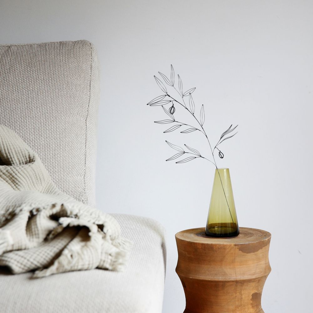 身近な植物を、美術館で展示される作品のように。空間に“静けさ”と“格”を添える、ワイヤーアートです。枯れない植物でありながら無機質になりすぎず、空間に静けさと洗練をもたらす存在として、“標本”のような視点で企画しました。 暑い季節など、生花を飾りたくても長く楽しめない時期でも、時間や季節に左右されず、空間に植物の気配を添えられるアイテムです。線のみで構成された繊細なフォルムは、1本1本の線を職人が手作業で溶接し、葉の曲線や葉脈に至るまで丁寧に再現しています。大量生産では表現できない、わずかな揺らぎなど、本物の植物のような有機的な存在感を生み出します。 モチーフは、穏やかさと実りの象徴「オリーブ」・空間に涼やかなリズムを生む「シダ」・凛とした葉姿が美しい「くすのき」の3種類。 影までもがデザインとなり、時間帯や光の向きによって表情が変わるのも魅力です。“新しい植物のかたち”として、長くお楽しみいただけます。 ■曲線で魅せる繊細なワイヤーアートシリーズはこちら ■オブジェ・置物関連はこちら shesayのIRON(アイアン)シリーズは、一つ一つ職人の手作業により作られています。そのため、同じ商品でも色・形・大きさに微妙な違いが生じる場合がございます。ハンドメイドならではの風合いとしてお楽しみください。また、素材の特性上、水気・湿気の多い場所でのご使用時には錆が生じる場合がありますのでご注意ください。 >>インテリア雑貨