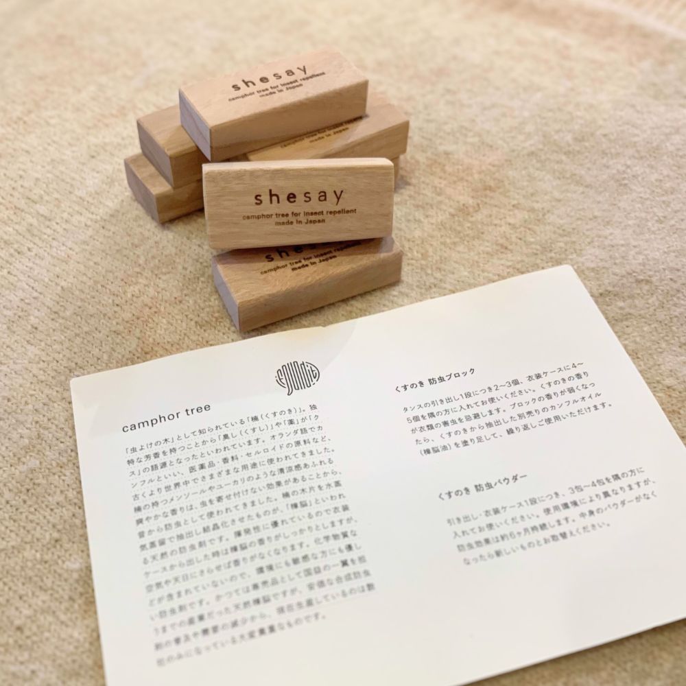 九州産の楠(くすのき)を板材に加工した後の端材を再利用して作られた防虫ブロックは、タンスや衣装ケースの引き出しに入れると害虫から大切な衣類を守ってくれます。さらに消臭効果もあるので、トイレや靴箱等匂いが気になるところにもおすすめです。 香りが弱くなったら、カンフルオイルを塗れば繰り返し使うことができます。 タンスの引き出しに2~3個、衣装ケースに4~5個ぐらい、隅に入れてご使用ください。 *香りが薄くなったら、カンフルオイル(別売り 品番161099)を塗り足して、繰り返しお使いいただけます。 ■その他カンフル(くすのき)シリーズはこちら 「虫よけの木」として知られている「楠(くすのき)」。独特な芳香を持つことから、「臭し(くすし)」や「薬」が「クス」の語源になったともいわれています。オランダ語でカンフルといい、医薬品・香料・セルロイドの原料など、古くより世界中で様々な用途に使われてきました。楠の持つメンソールやユーカリのような清涼感あふれる爽やかな香りは、虫を寄せ付けない効果があることから、昔から防虫として使われてきました。楠の木片を水蒸気蒸留で抽出し結晶化させたものが、「樟脳」といわれる天然の防虫剤です。揮発性に優れているので衣装ケースから出した時は樟脳の香りがしっかりとしますが、空気や天日にさらせば香りがなくなります。化学物質などが含まれていないので、環境に敏感な方にも優しい防虫剤です。かつては専売品として国益の一翼を担うまでの産業だった天然樟脳ですが、安価な合成防虫剤の普及や需要の減少から、現在生産しているのは数社のみになっている大変貴重なものです。 >>生活雑貨・日用品